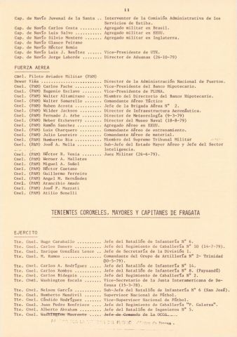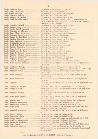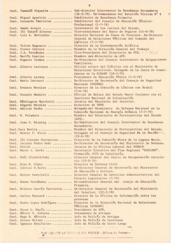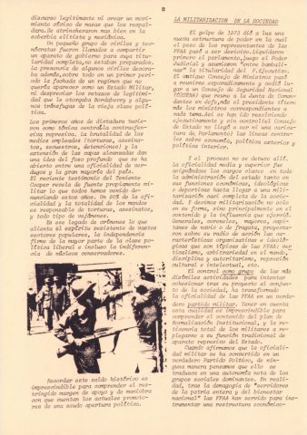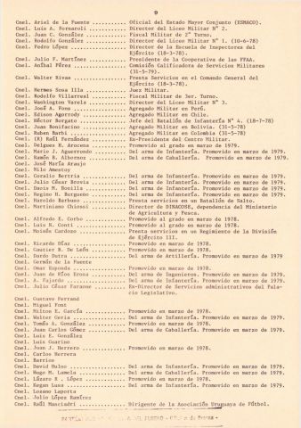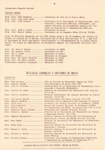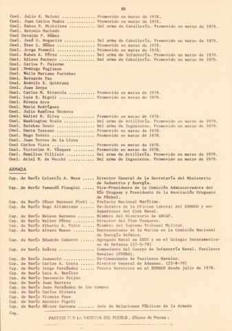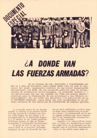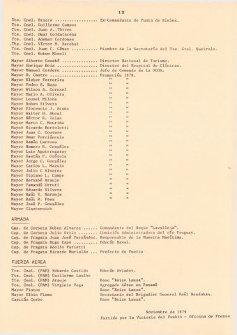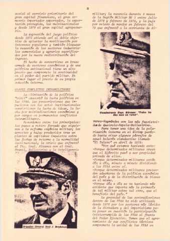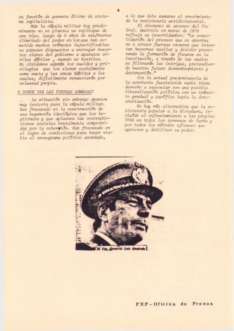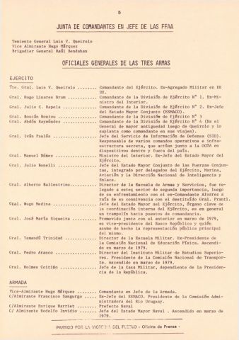 Documento producido por el PVP que hace un análisis de la interna militar hacia noviembre de 1979 y tiene extensas nóminas de personal militar, sus asignaciones y ascensos. Este ejemplar vino encartado en el número 31 de "Informaciones y documentos".