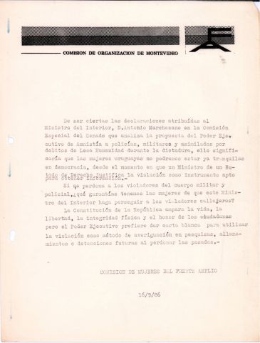 Declaración de la Comisión de Mujeres del Frente Amplio, en la que abordan las declaraciones del Ministro del Interior, Antonio Marchesano en el que consideró que la violación a detenidas estaba comprendida dentro de la ley de amnistía propuesta por Julio María Sanguinetti.