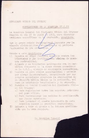Día 27 Mes 6 Año 1973 Tipo de material Volante Colección Huelga General Sindicato Médico del Uruguay (SMU) Origen Colección Luis Alberto Gallegos Colección Luis Alberto Gallegos Publicacion