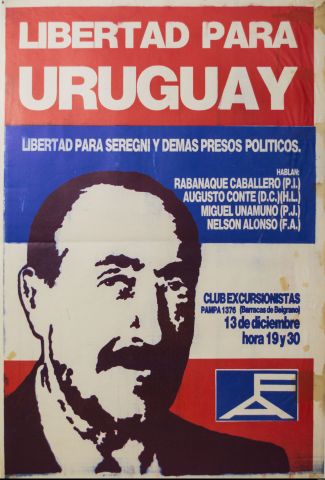 Afiche político de convocatoria "Libertad para Uruguay : libertad para Seregni y demás presos políticos" del Frente Amplio. Concentración con oradores, a realizarse el día 13 de diciembre a las 19:30 hs. en el Club Excursionistas, Pampa 1376 - Barrancas