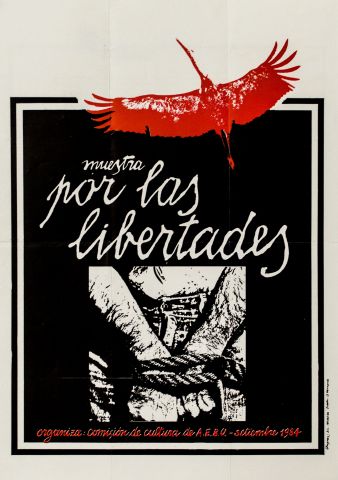 Afiche impreso en ambos lados: Anverso: impreso en negro y rojo sobre fondo blanco, con imagen de un pájaro y de un hombre con las manos atadas. Sólo se lee: "Muestra por las libertades" El afiche fue diseñado por O. Ferrando. Reverso: Explicación de la muestra y lista de expositores que mandan sus obras desde ese país o de afuera.