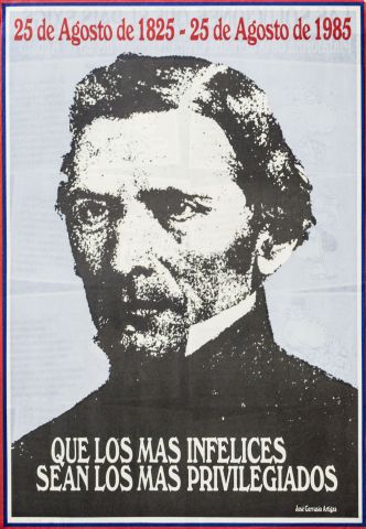 Afiche impreso en ambos lados: Anverso: Imagen de José Gervasio Artigas en blanco y negro. Se lee: "25 de Agosto de 1825-25 de Agosto de 1985. Que los más infelices sean los más privilegiados". Reverso: Serie de recuadros con "Soluciones que el país exige. Plataforma de la Jornada Cívica Nacional del 25 de agosto"