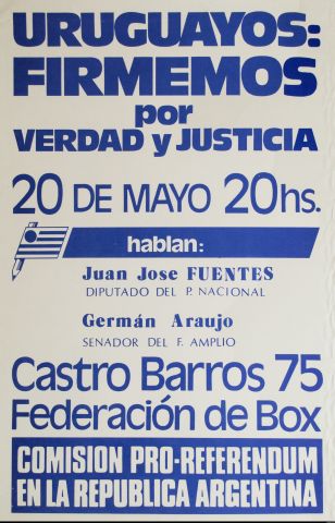 Afiche de convocatoria de la Comisión Pro-Referéndum en la República Argentina al acto y campaña de apoyo a Uruguay por la anulación de la Ley de Caducidad de la Pretensión Punitiva del Estado (Ley N.º 15.848), realizada el 20 de mayo en la Federación de Box. Contiene la leyenda: “Uruguayos, firmemos por verdad y justicia” y los nombres de los oradores: "Juan José Fuentes, diputado del Partido Nacional, y Germán Araujo, senador del Frente Amplio"