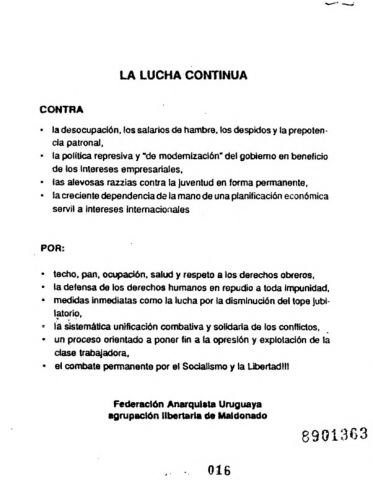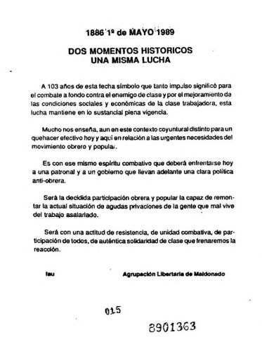 Día 1 Mes 5 Año 1989 Tipo de material Volante Dimensión 2 pags. Colección Federación Anarquista Uruguaya (FAU) Origen Archivo Berrutti Archivo Berrutti Publicacion
