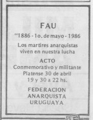 Día 30 Mes 4 Año 1986 Tipo de material Volante Colección Federación Anarquista Uruguaya (FAU) Origen Colección Fernando de León Colección Fernando de León Publicacion