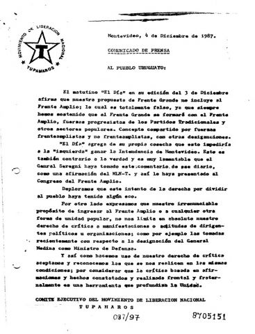 Día 4 Mes 12 Año 1987 Tipo de material Documento Colección Movimiento de Liberación Nacional - Tupamaros (MLN-T) Origen Archivo Berrutti Archivo Berrutti Publicacion