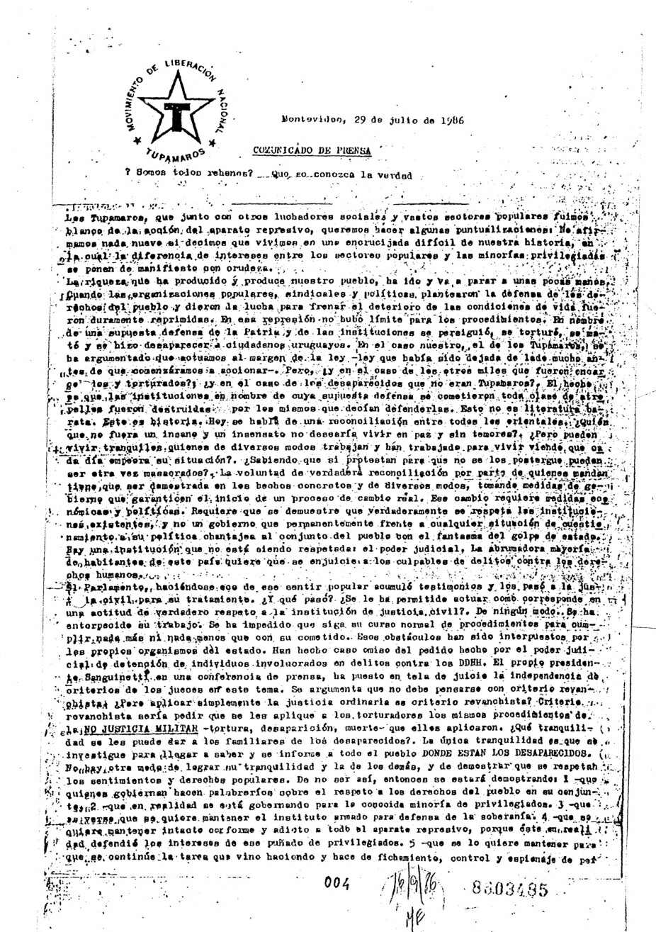 Día 29 Mes 7 Año 1986 Tipo de material Documento Colección Movimiento de Liberación Nacional - Tupamaros (MLN-T) Origen Archivo Berrutti Archivo Berrutti Publicacion