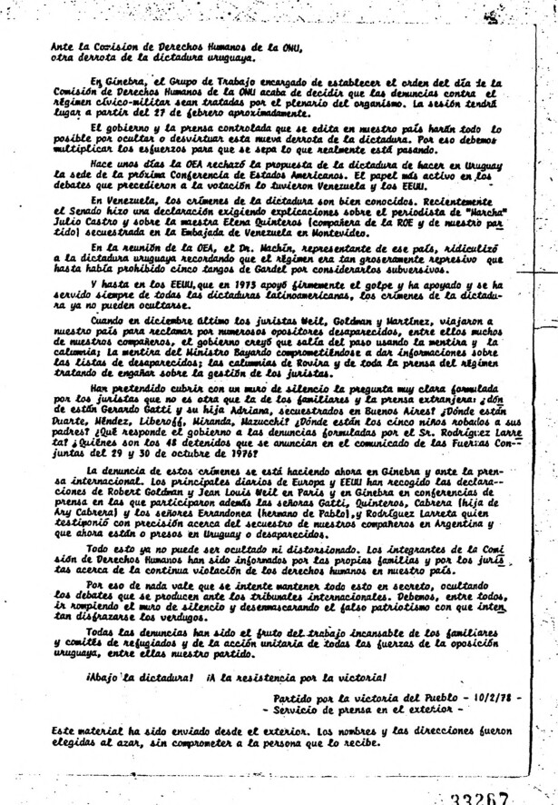 Día 10 Mes 2 Año 1978 Tipo de material Documento Dimensión 1 pag. Colección Partido por la Victoria del Pueblo (PVP) Origen Archivo Berrutti Archivo Berrutti Publicacion