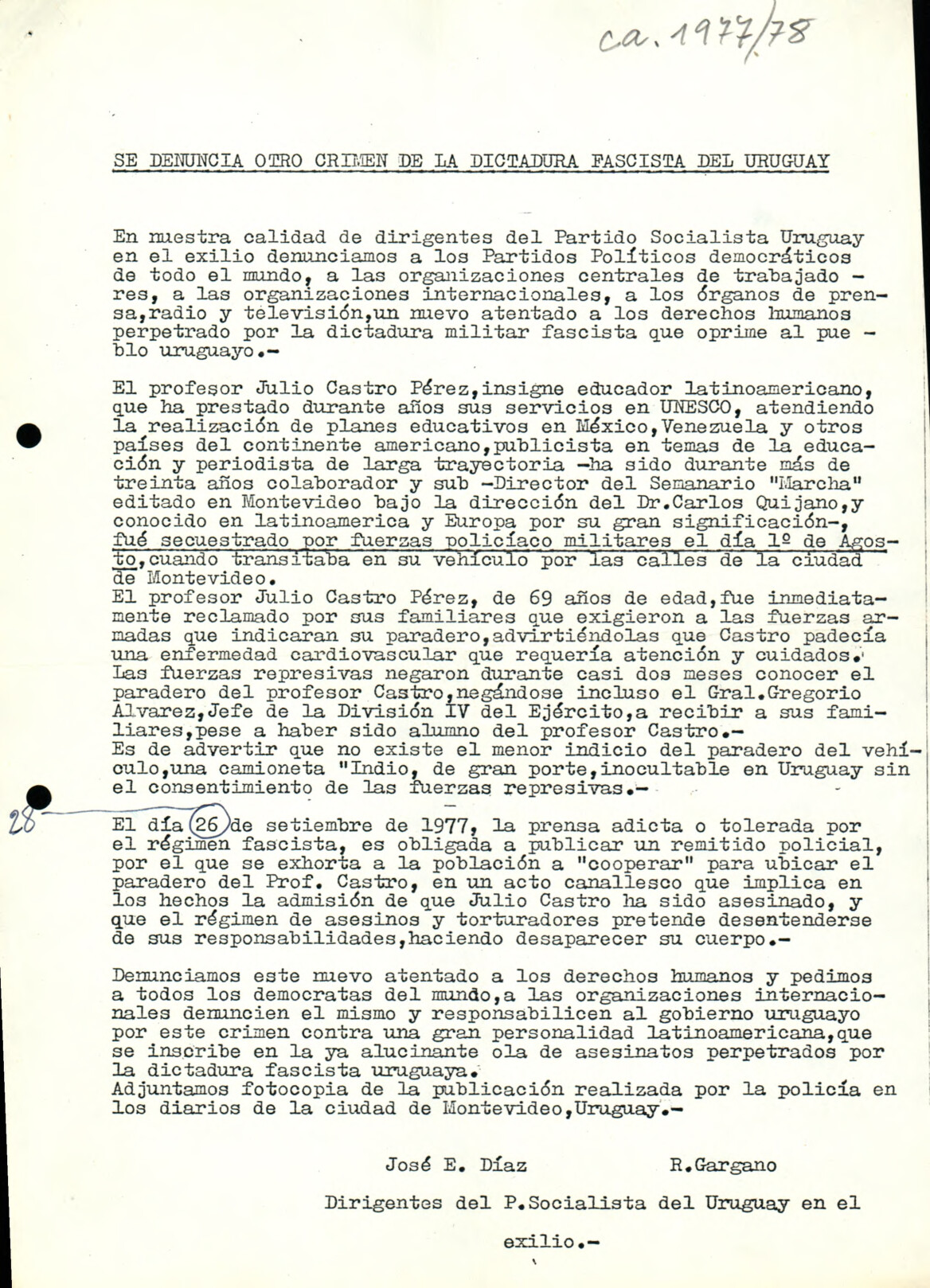 Año 1977 Tipo de material Documento Dimensión 1 pag. Colección Partido Socialista de Uruguay (PSU) Origen Anáforas Proyecto Anáforas Publicacion