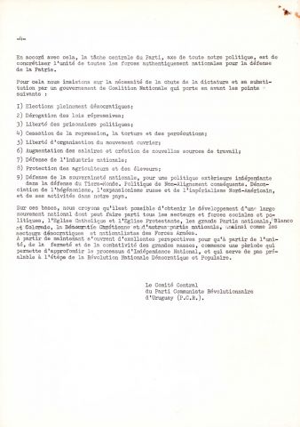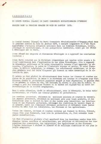 Este comunicado del Comité Central (ampliado) del Partido Comunista Revolucionario de Uruguay (PCR), fechado en la primera semana de enero de 1979, presenta un análisis crítico de la dictadura y propone una estrategia para su derrocamiento.
