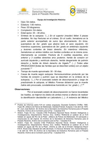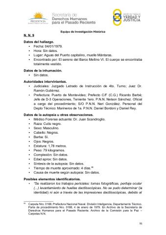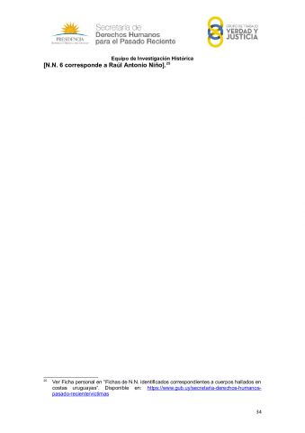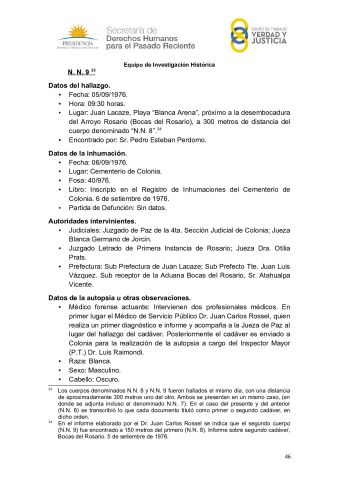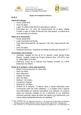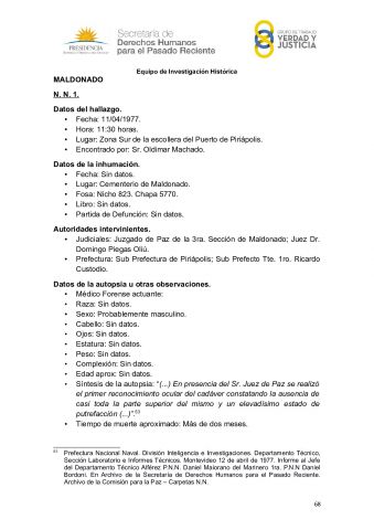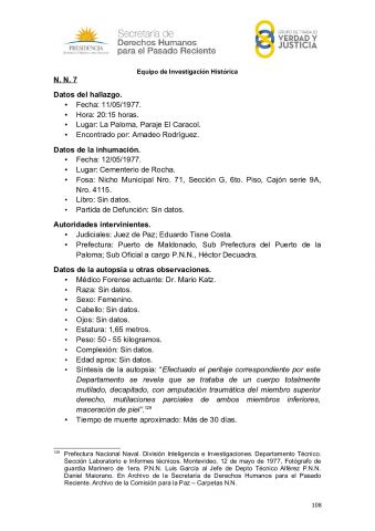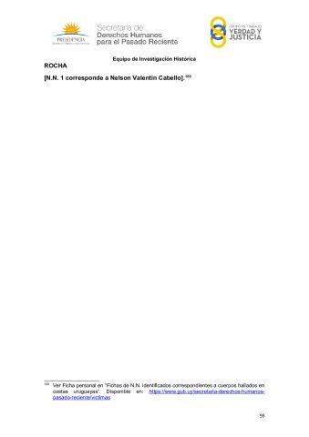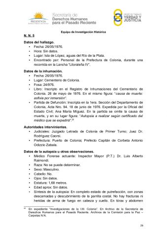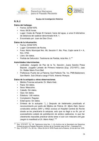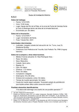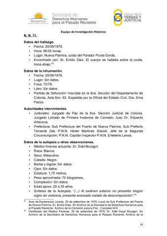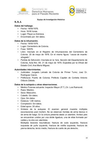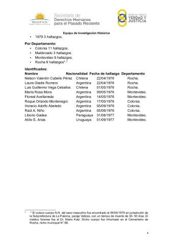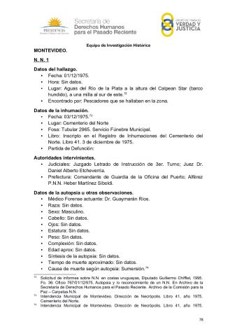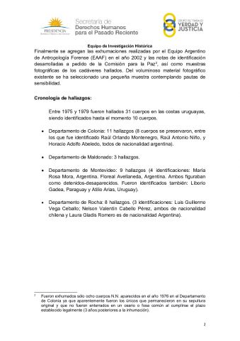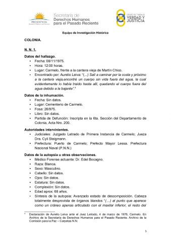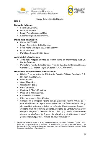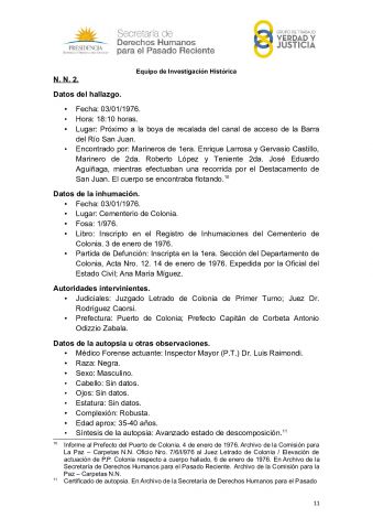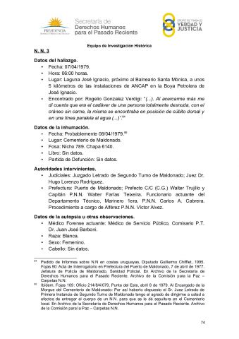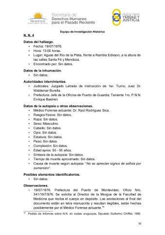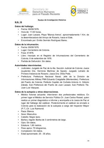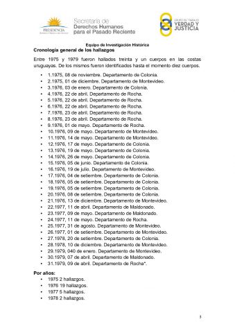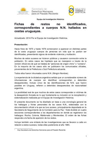 Este documento fue realizado por el equipo de investigación histórica de la Secretaría para el Pasado Reciente de Presidencia de la República y actualizado en 2014. En el se sistematiza los los hallazgos de cuerpos de personas, aparecidas en las costas de Rocha, Colonia, Maldonado y Montevideo entre los años 1975 - 1979 e inhumados como N. N. en los cementerios de esos departamentos. De un total de 31 cuerpos se han identificado a la fecha 10 personas.