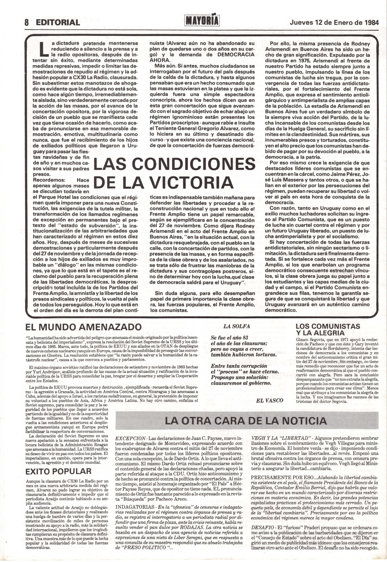 Medio de prensa Mayoría Tipo Del exilio Día de publicación 12 Mes de publicación 1 Año de publicación 1984 Origen Archivo del PCU Archivo del Partido Comunista del Uruguay Publicacion completa