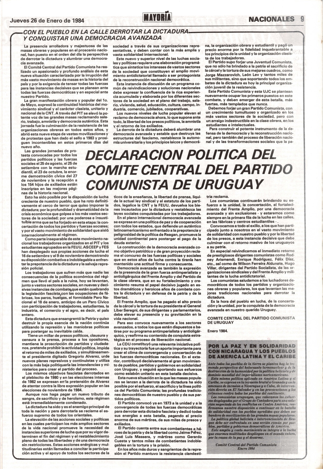 Medio de prensa Mayoría Tipo Del exilio Día de publicación 26 Mes de publicación 1 Año de publicación 1984 Origen Archivo del PCU Archivo del Partido Comunista del Uruguay Publicacion completa