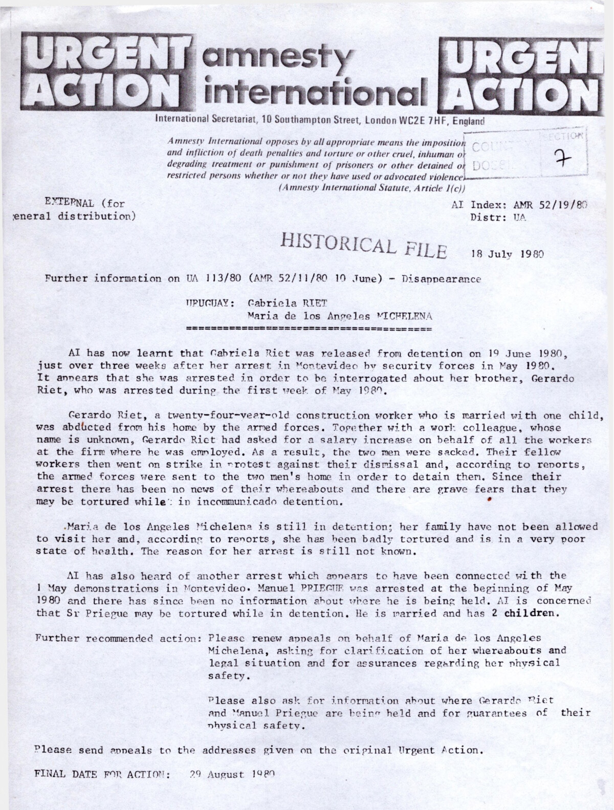 Medio de prensa Acción Urgente (Urgent Action) Tipo Extranjera Día de publicación 18 Mes de publicación 7 Año de publicación 1980 Origen Colección Marisa Ruiz Colección Marisa Ruiz Publicacion completa