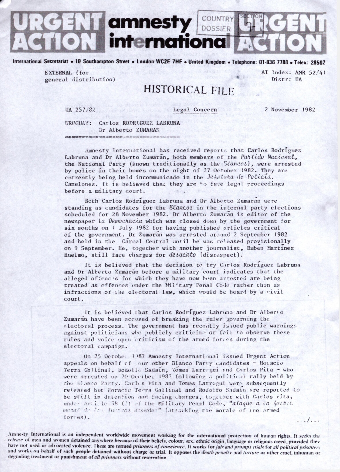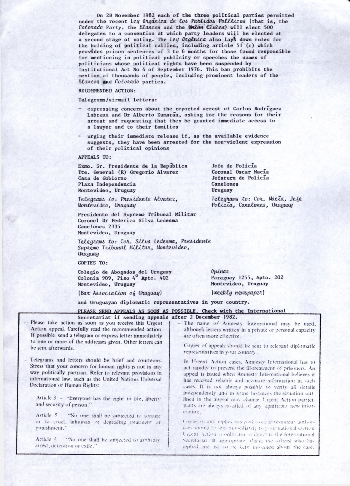Medio de prensa Acción Urgente (Urgent Action) Tipo Extranjera Día de publicación 2 Mes de publicación 11 Año de publicación 1982 Origen Colección Marisa Ruiz Colección Marisa Ruiz Publicacion completa