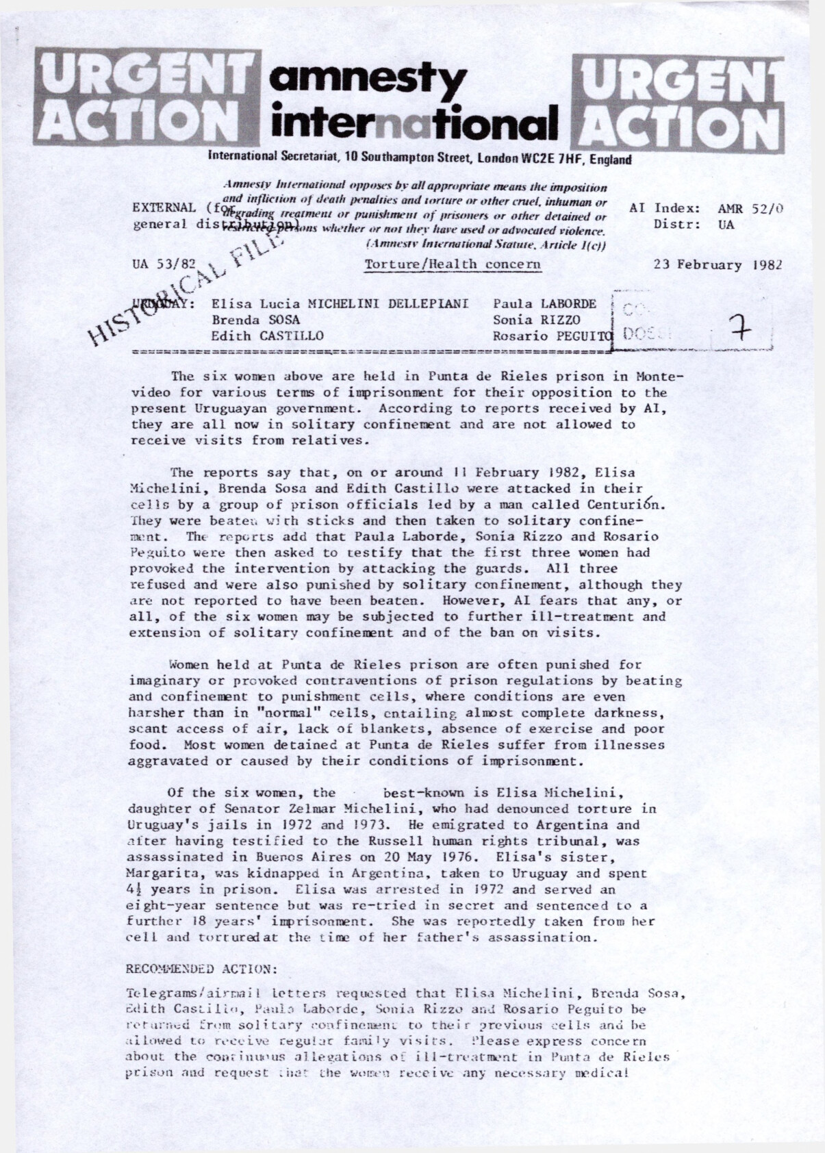 Medio de prensa Acción Urgente (Urgent Action) Tipo Extranjera Día de publicación 23 Mes de publicación 2 Año de publicación 1982 Origen Colección Marisa Ruiz Colección Marisa Ruiz Publicacion completa