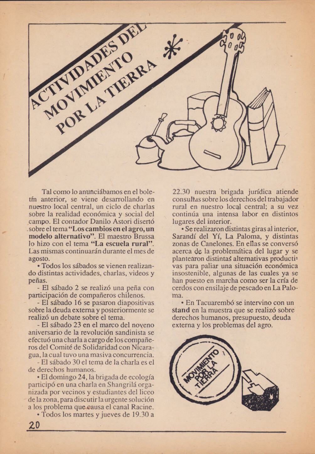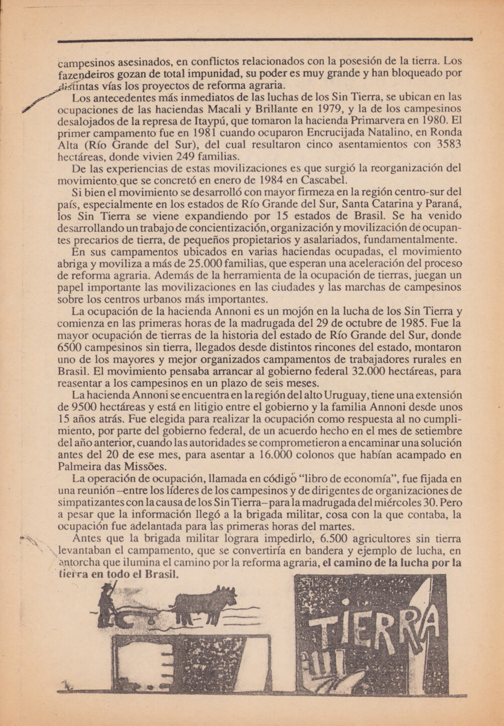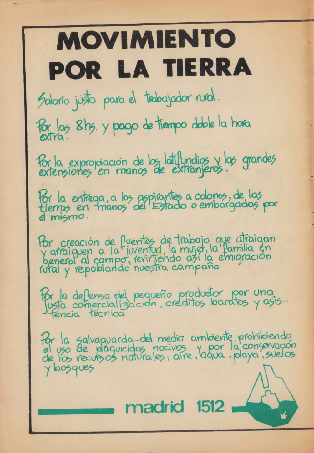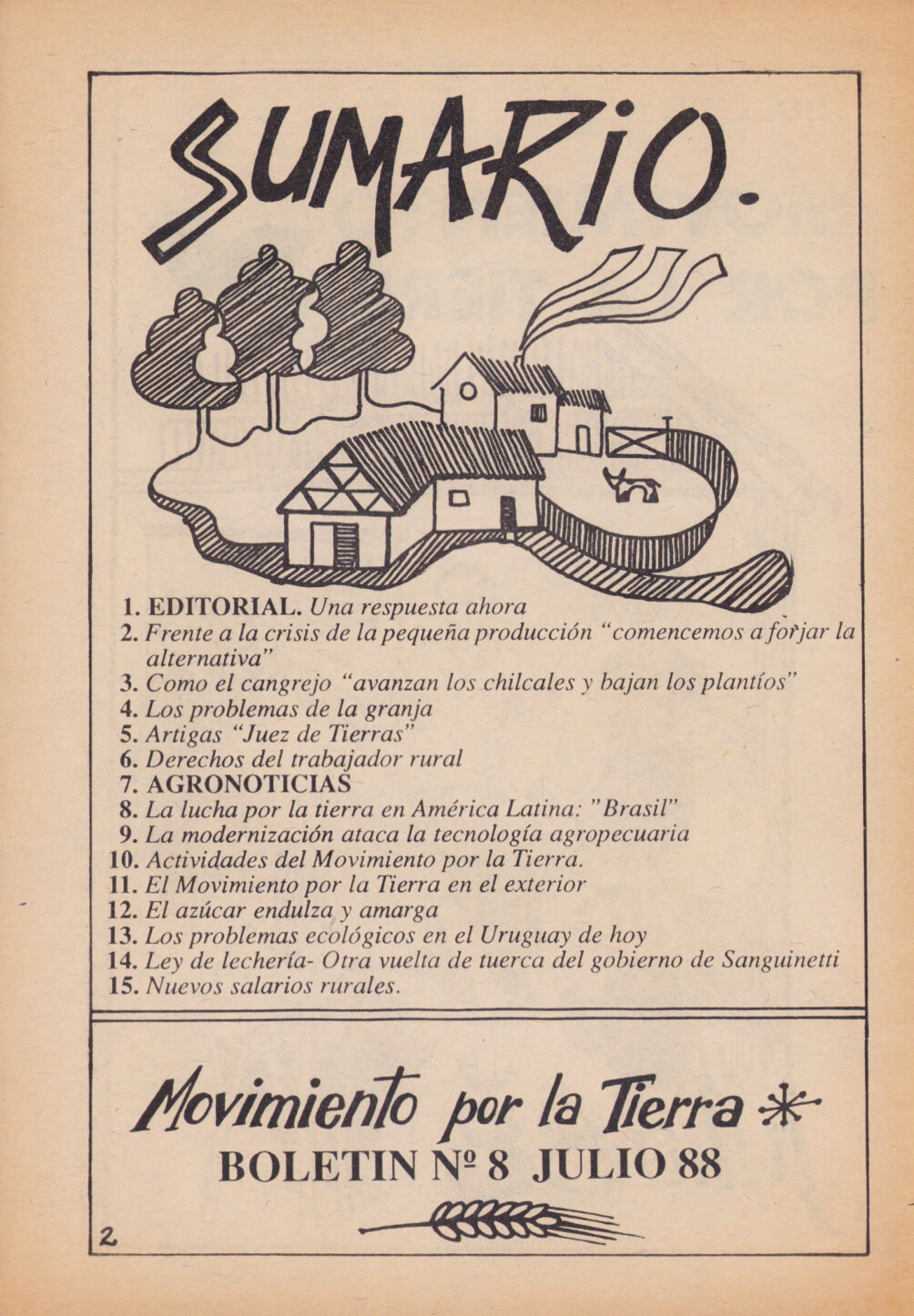 Medio de prensa Boletín del Movimiento por la Tierra Tipo Posdictadura Mes de publicación 7 Año de publicación 1988 Origen Colección Jacqueline Gómez Colección Jacqueline Gómez Publicacion completa