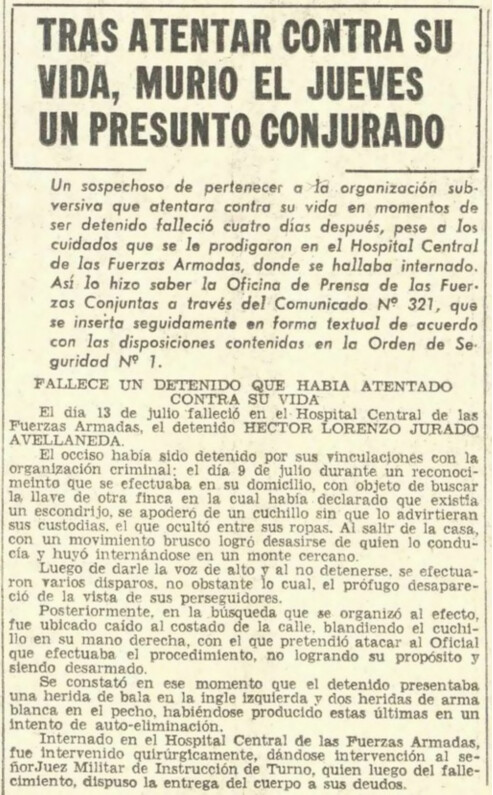La nota de El País, reproduce el comunicado y la versión de las Fuerzas Conjuntas sobre la detención y muerte de Héctor Jurado Avellaneda. En el comunicado, se afirma que el detenido hizo un intento de autoeliminación, y a pesar de los cuidados que le brindaron en el Hospital Militar, falleció a los pocos días.