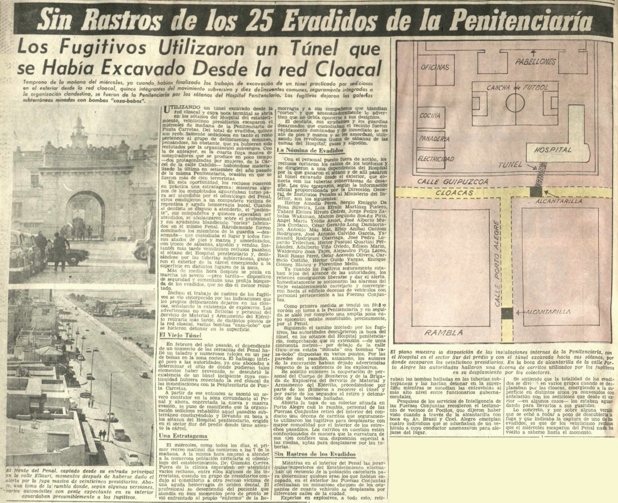 Además de la narración de los hechos, la nota incluye la lista de los 25 evadidos y un plano del penal que ilustra el recorrido del túnel desde las cloacas hasta el hospital penitenciario.