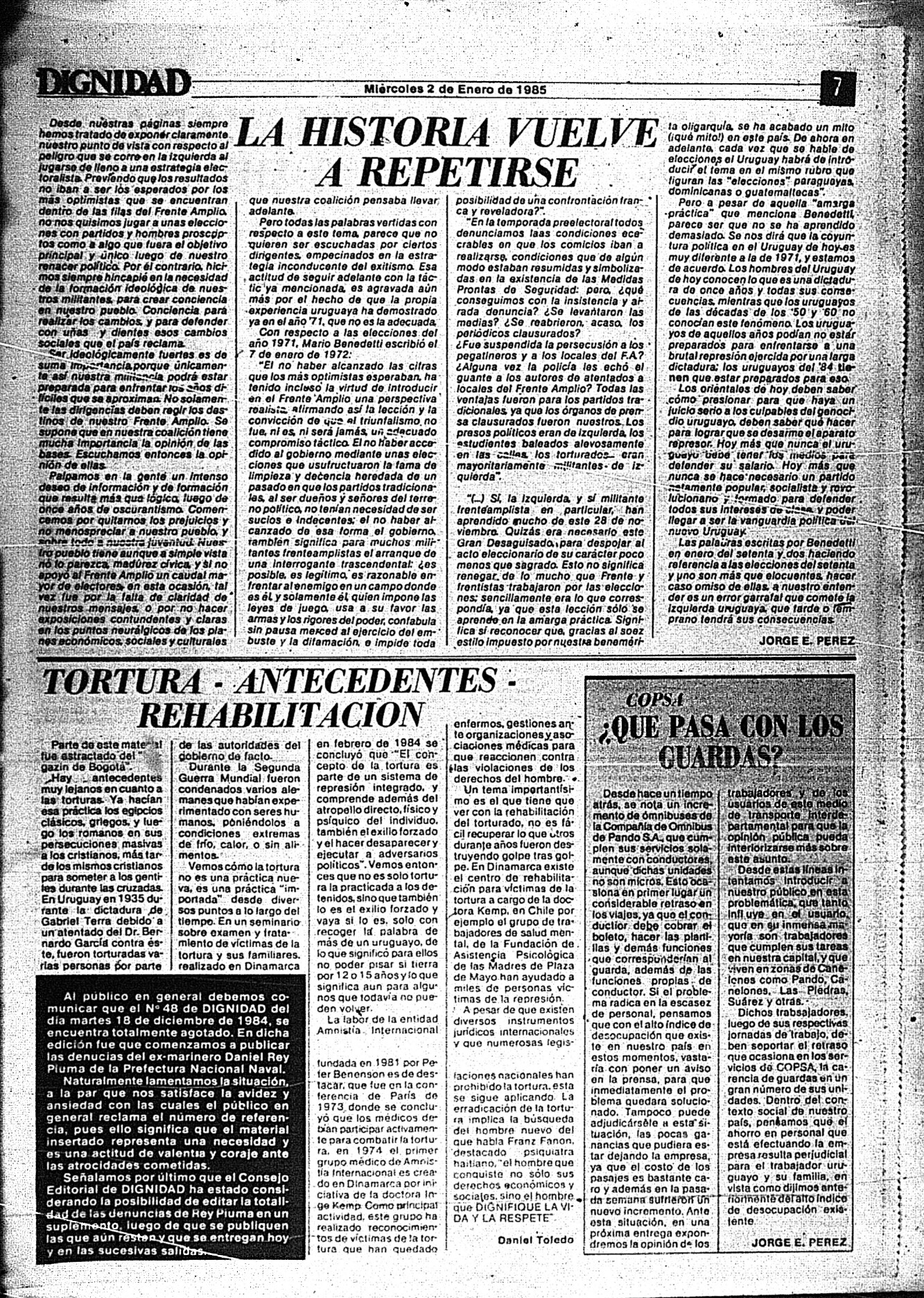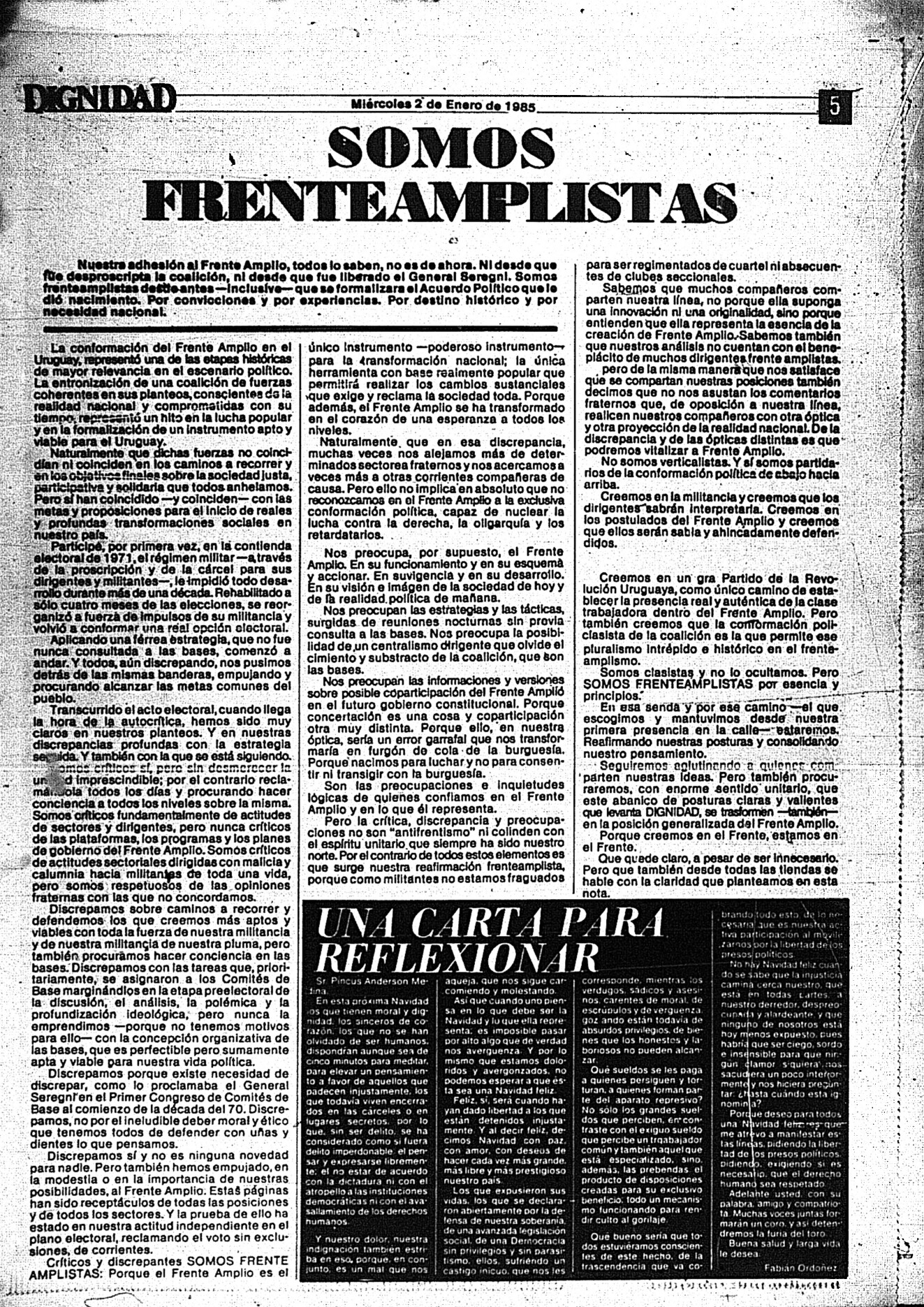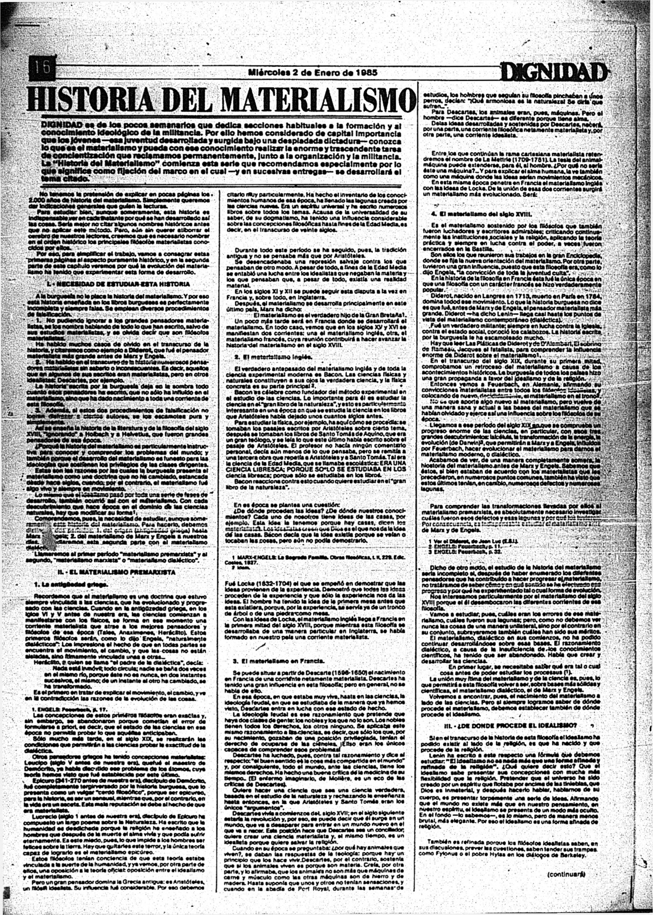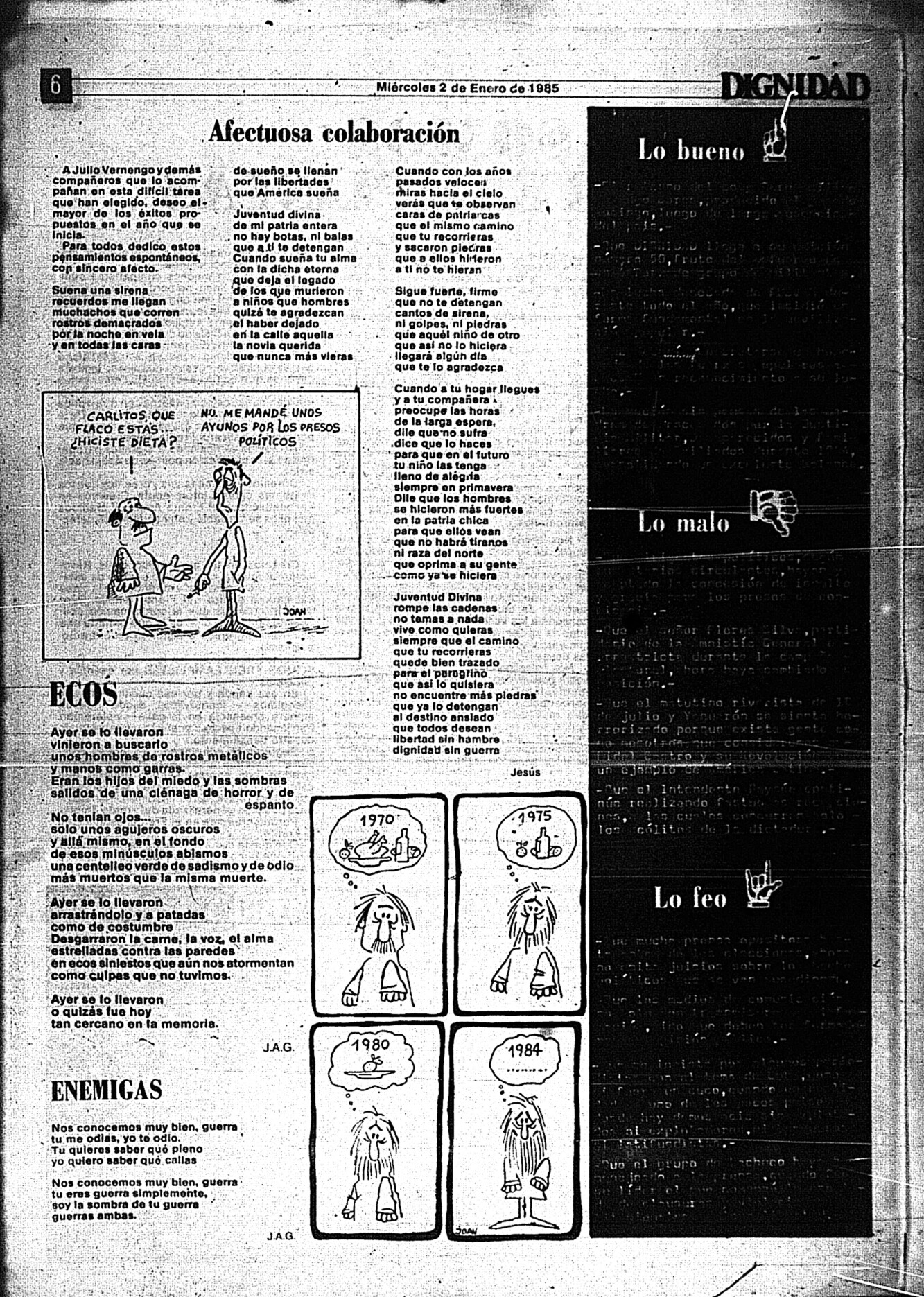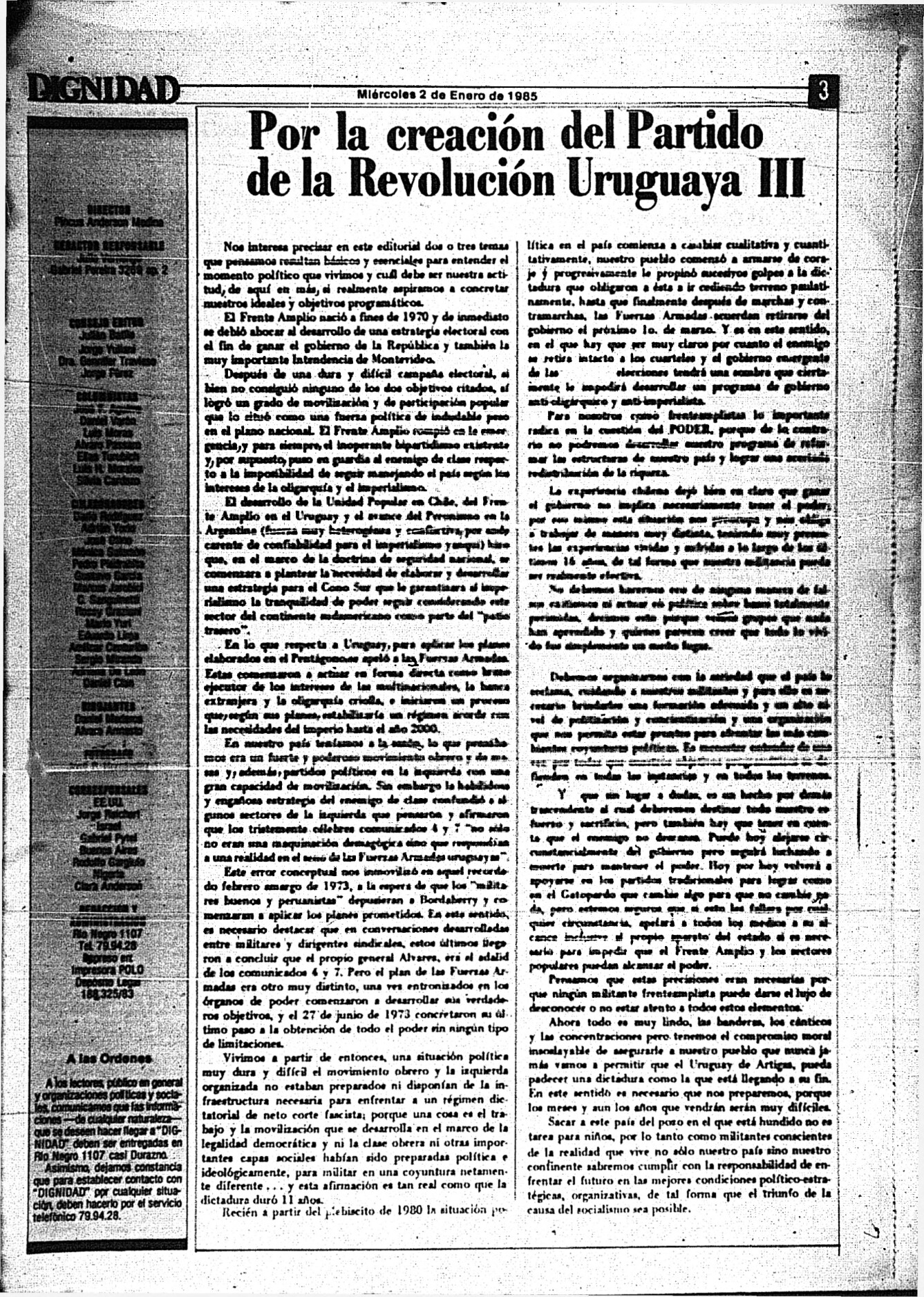 Medio de prensa Dignidad Tipo De la transición Día de publicación 2 Mes de publicación 1 Año de publicación 1985 Origen Archivo Berrutti Archivo Berrutti Publicacion completa