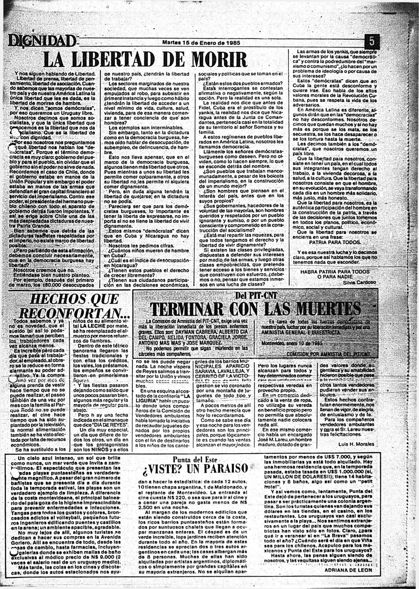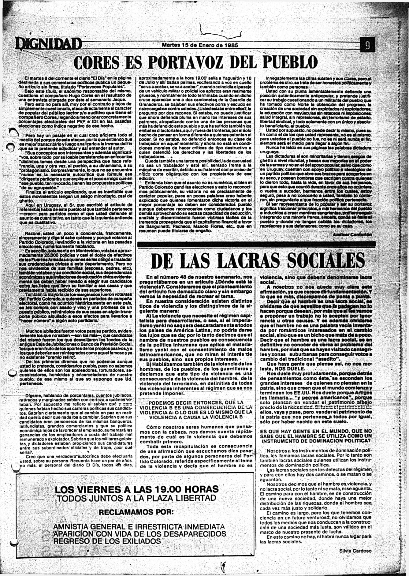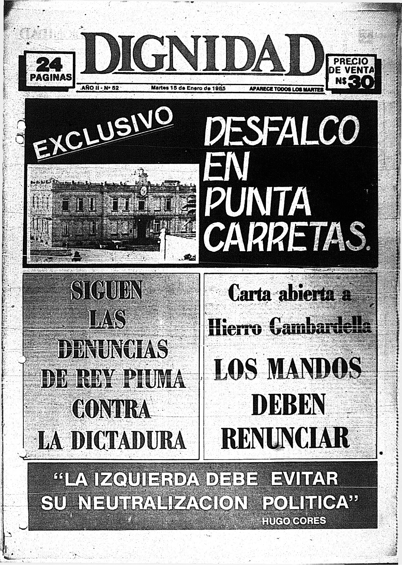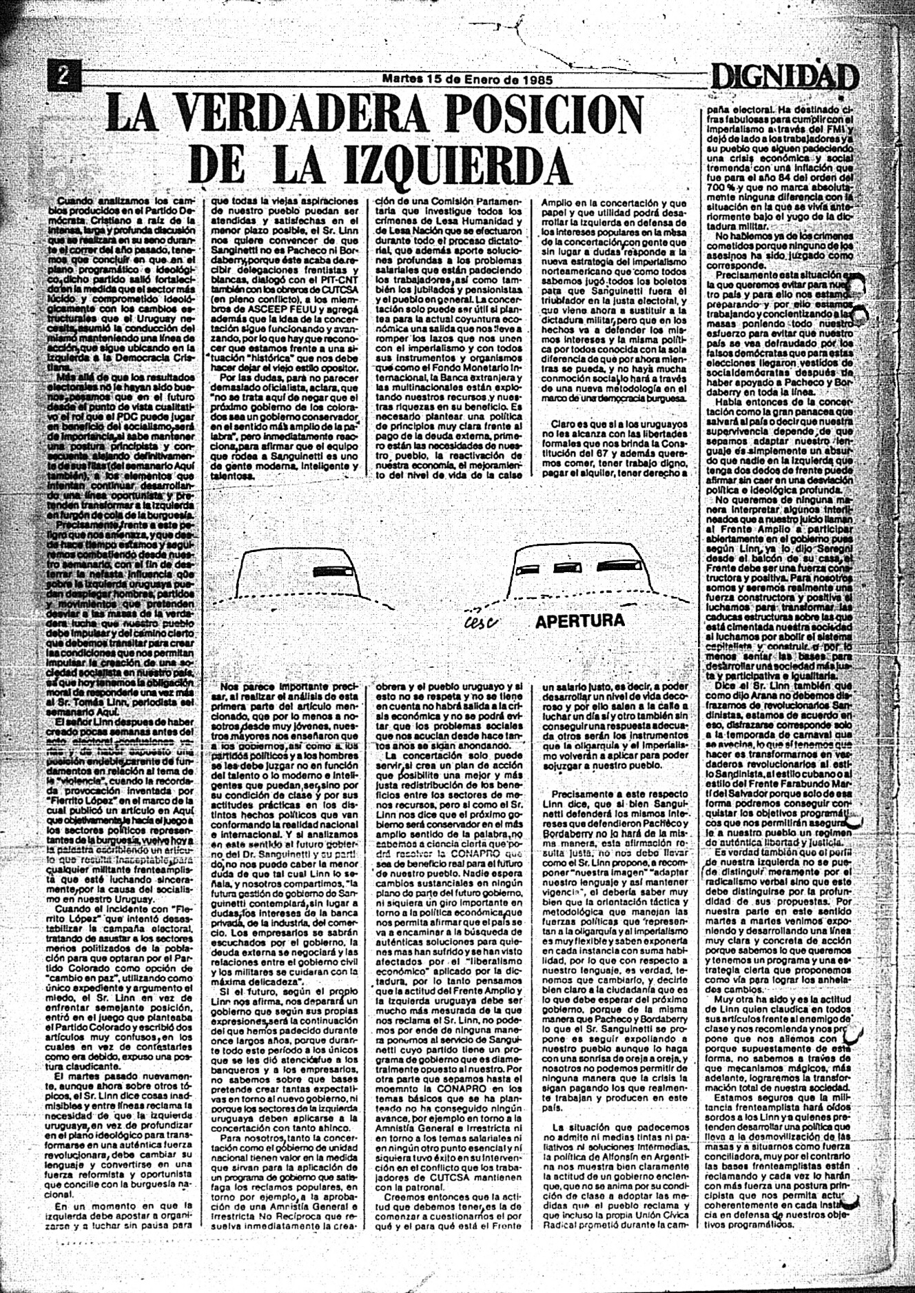Medio de prensa Dignidad Tipo De la transición Día de publicación 15 Mes de publicación 1 Año de publicación 1985 Origen Archivo Berrutti Archivo Berrutti Publicacion completa