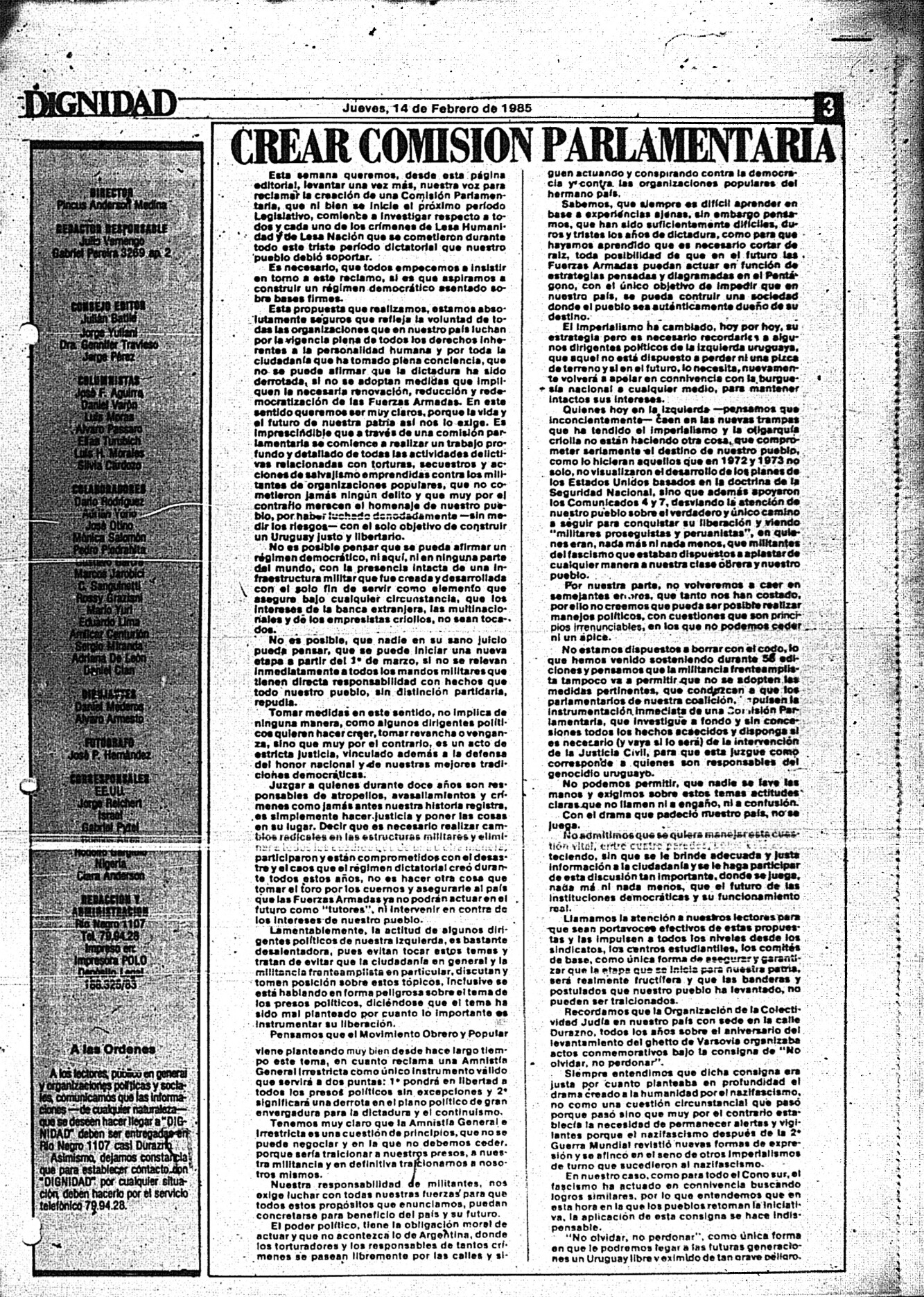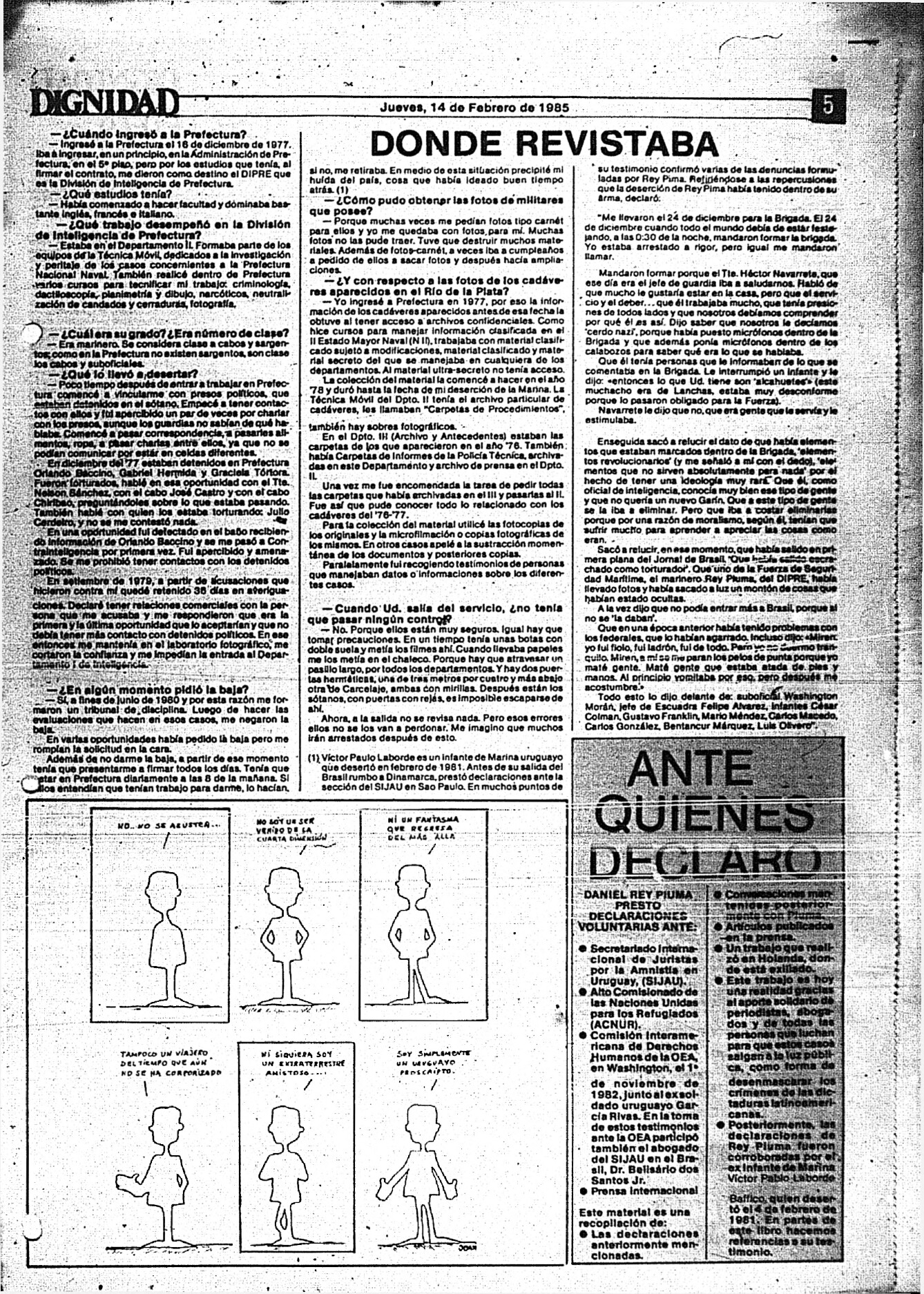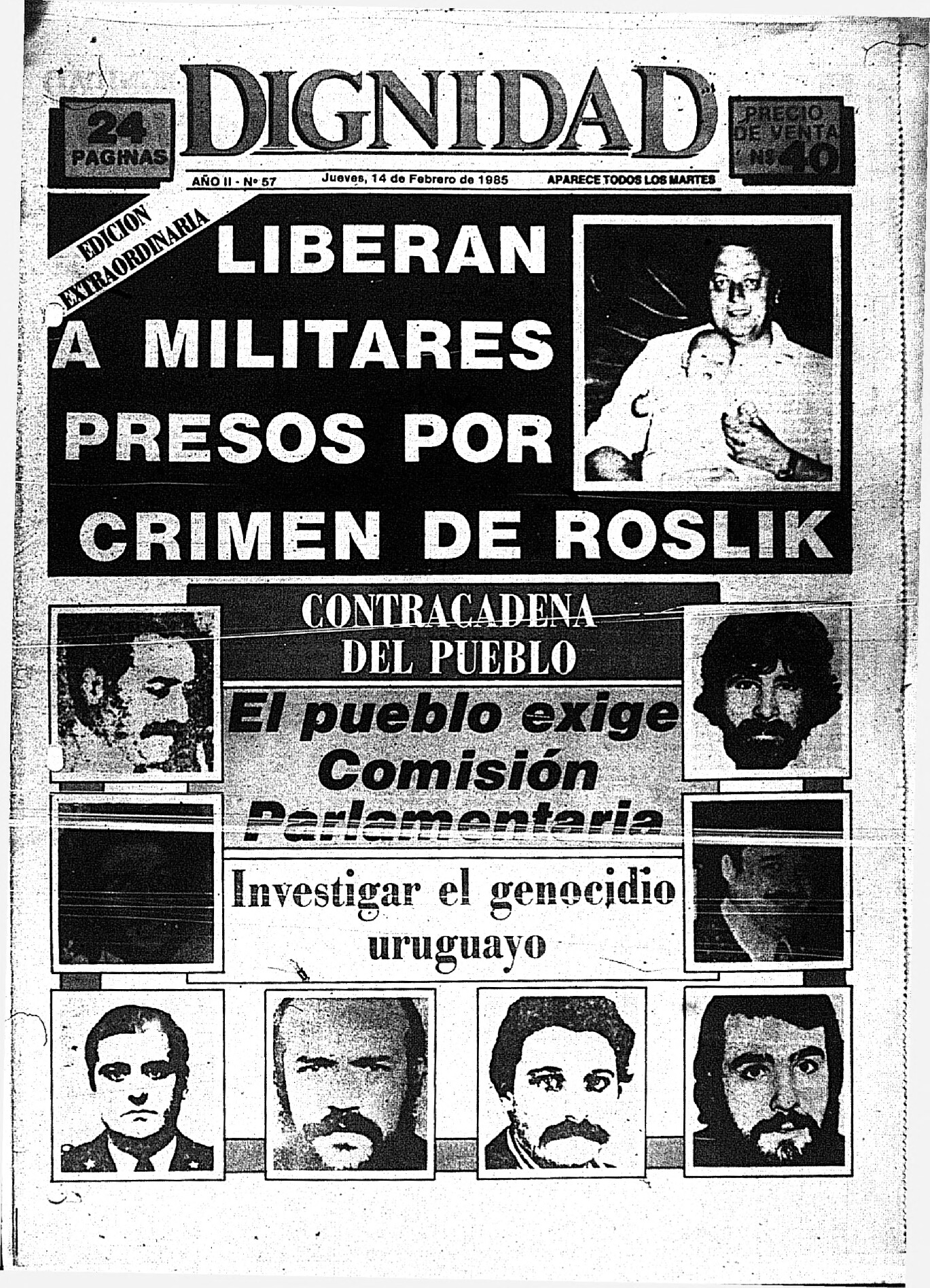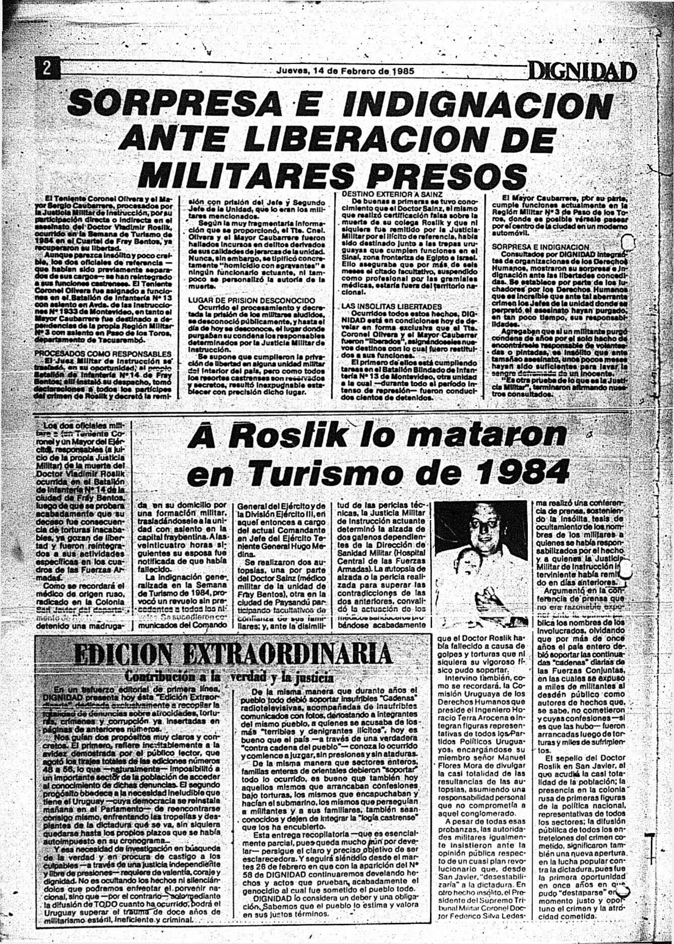 Medio de prensa Dignidad Tipo De la transición Día de publicación 14 Mes de publicación 2 Año de publicación 1985 Origen Archivo Berrutti Archivo Berrutti Publicacion completa