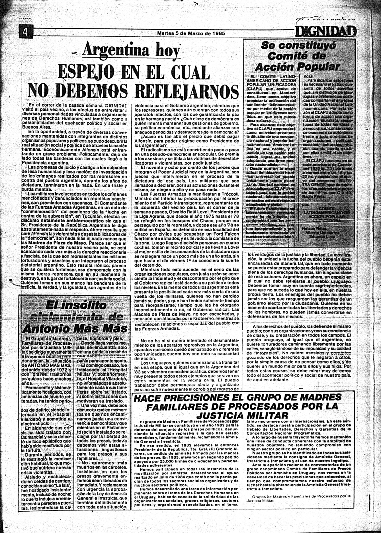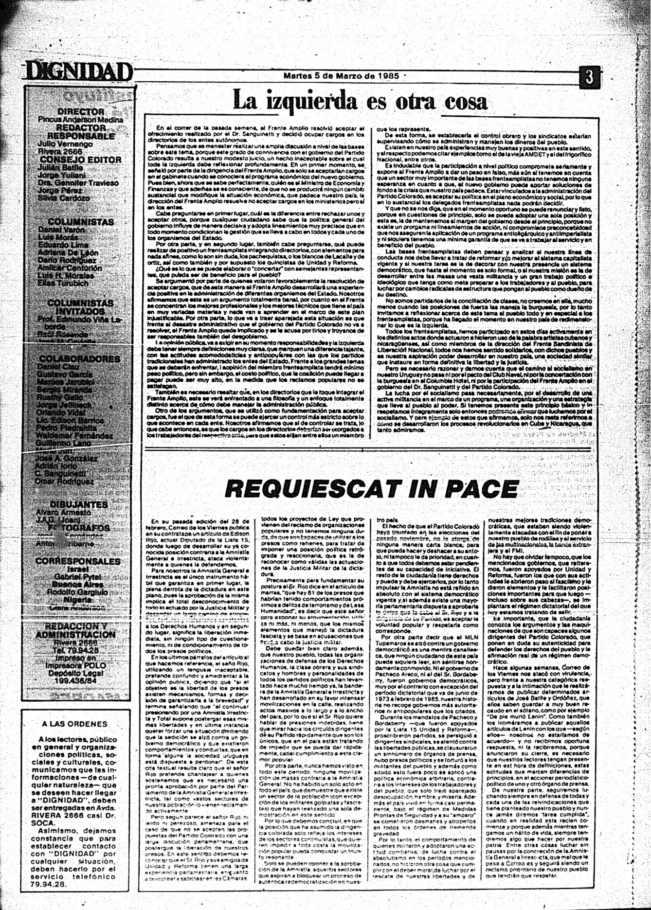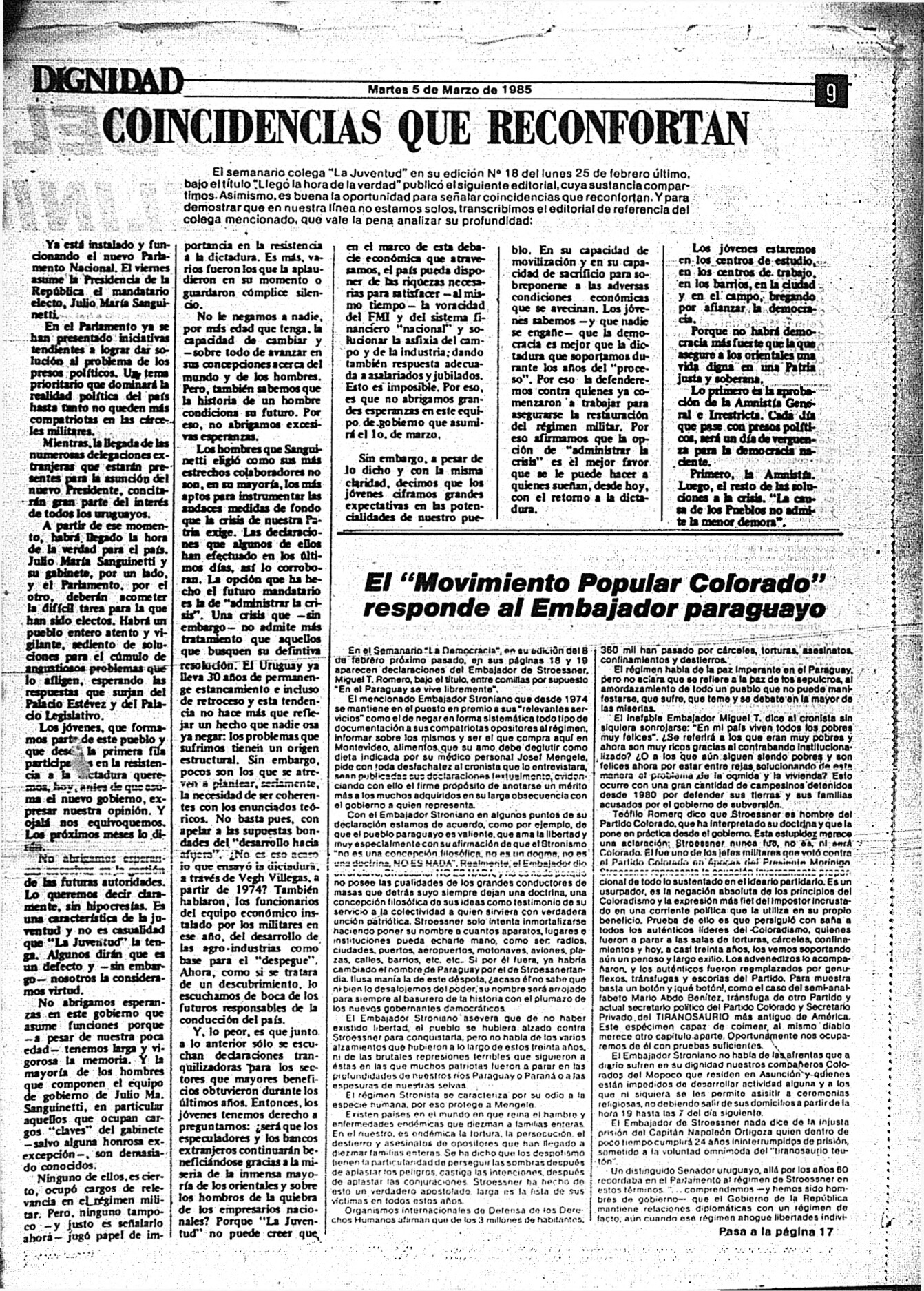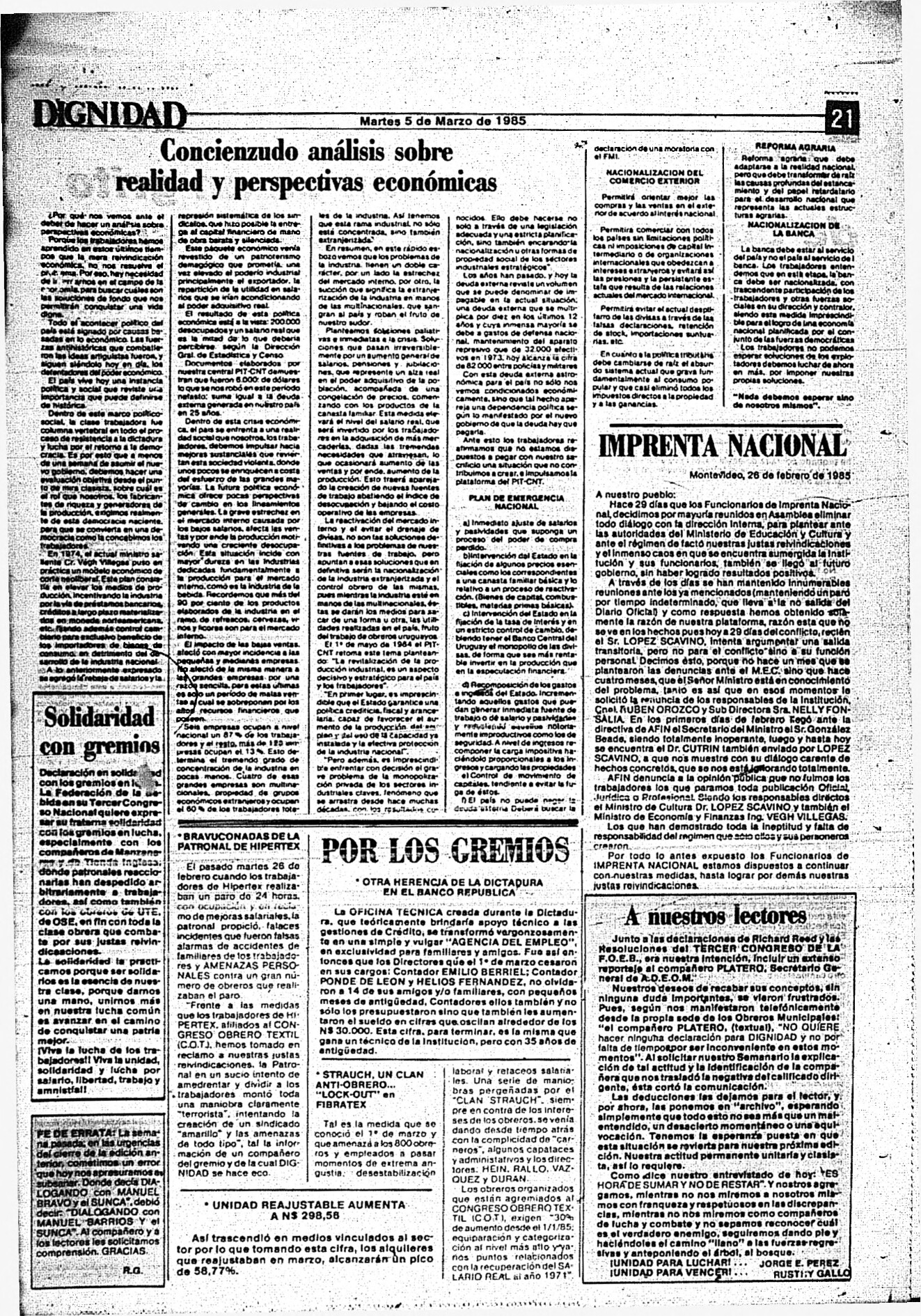 Medio de prensa Dignidad Tipo Posdictadura Día de publicación 5 Mes de publicación 3 Año de publicación 1985 Origen Archivo Berrutti Archivo Berrutti Publicacion completa