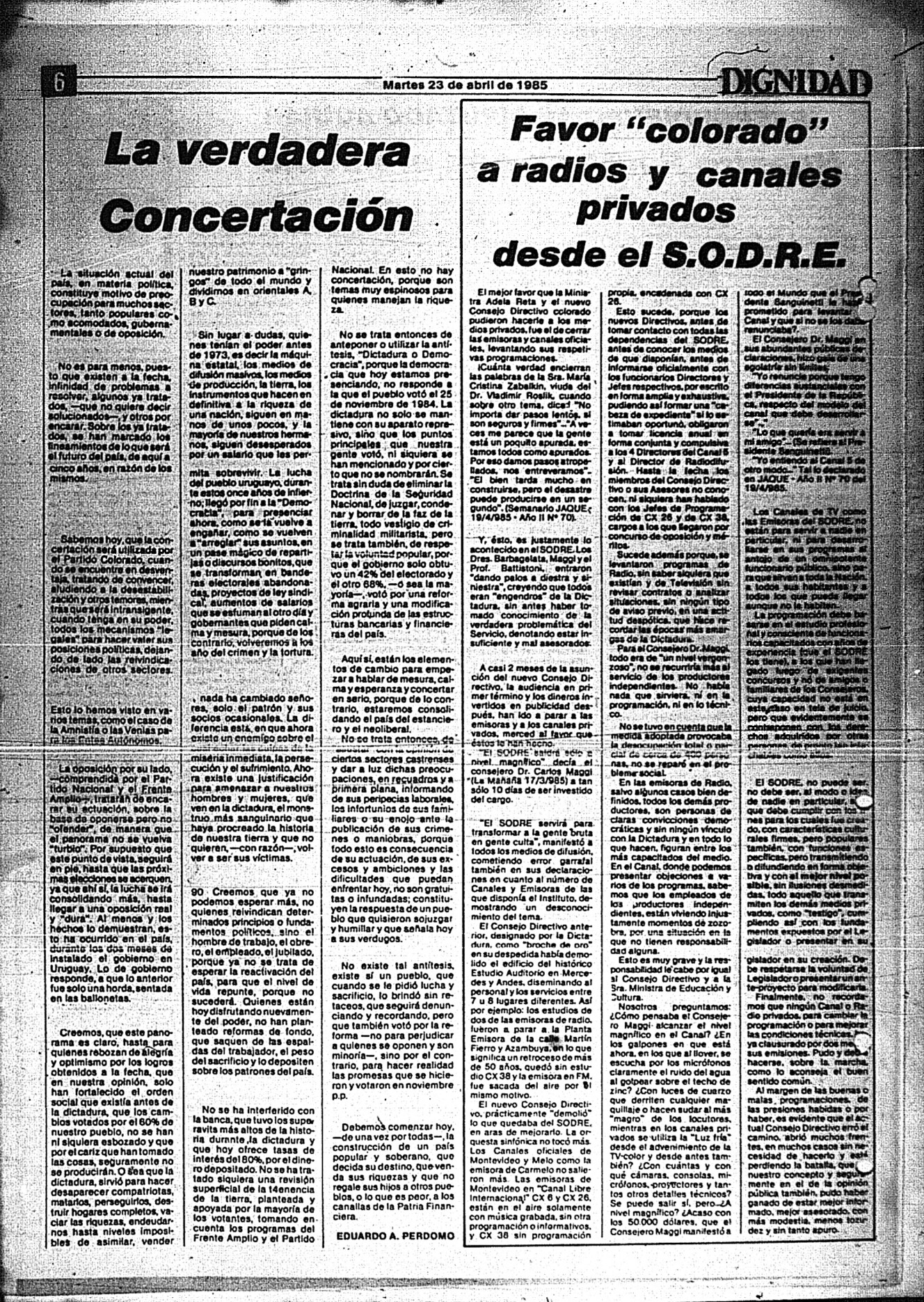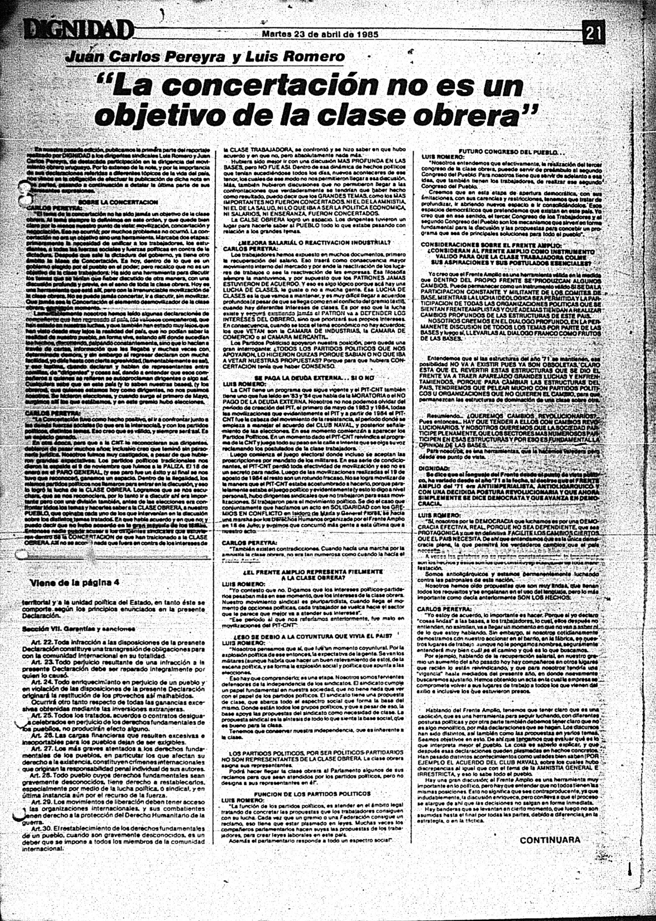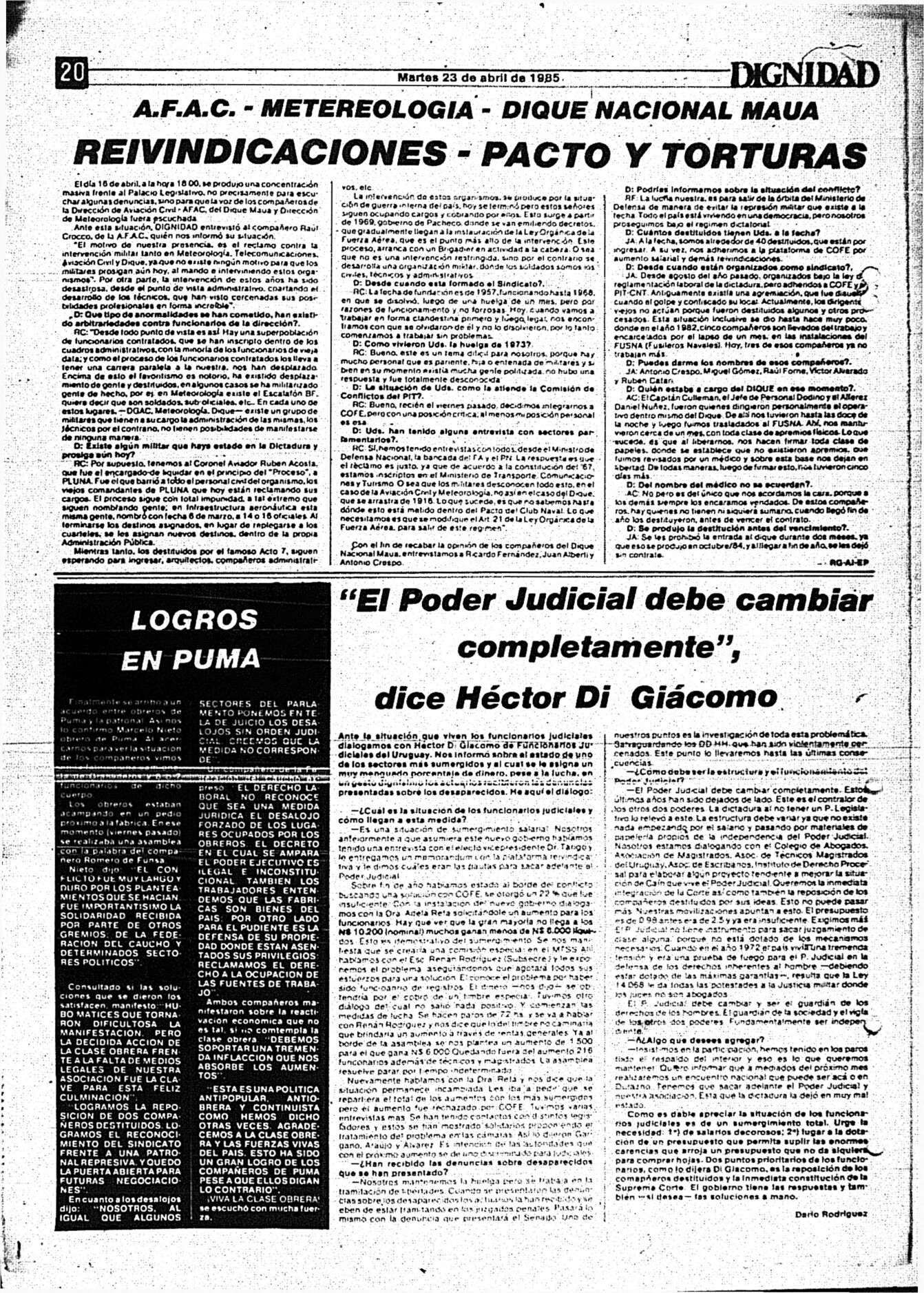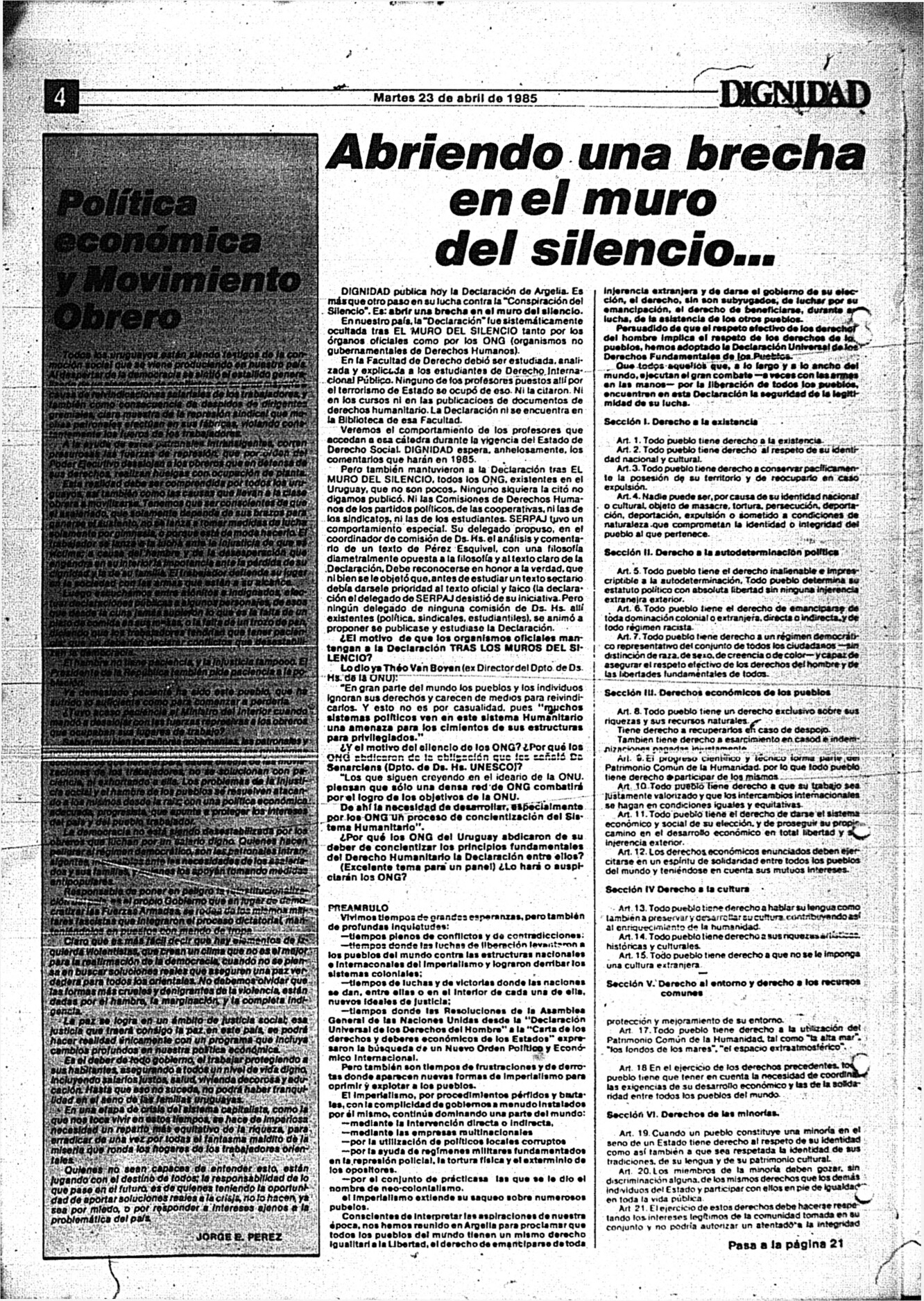 Medio de prensa Dignidad Tipo Posdictadura Día de publicación 23 Mes de publicación 4 Año de publicación 1985 Origen Archivo Berrutti Archivo Berrutti Publicacion completa