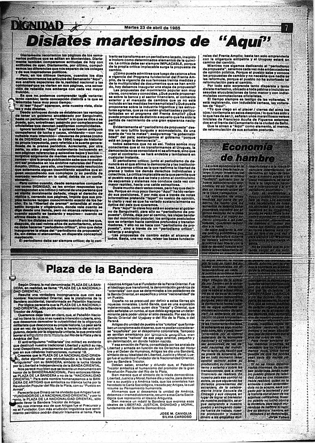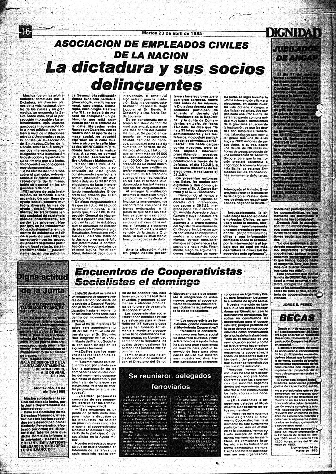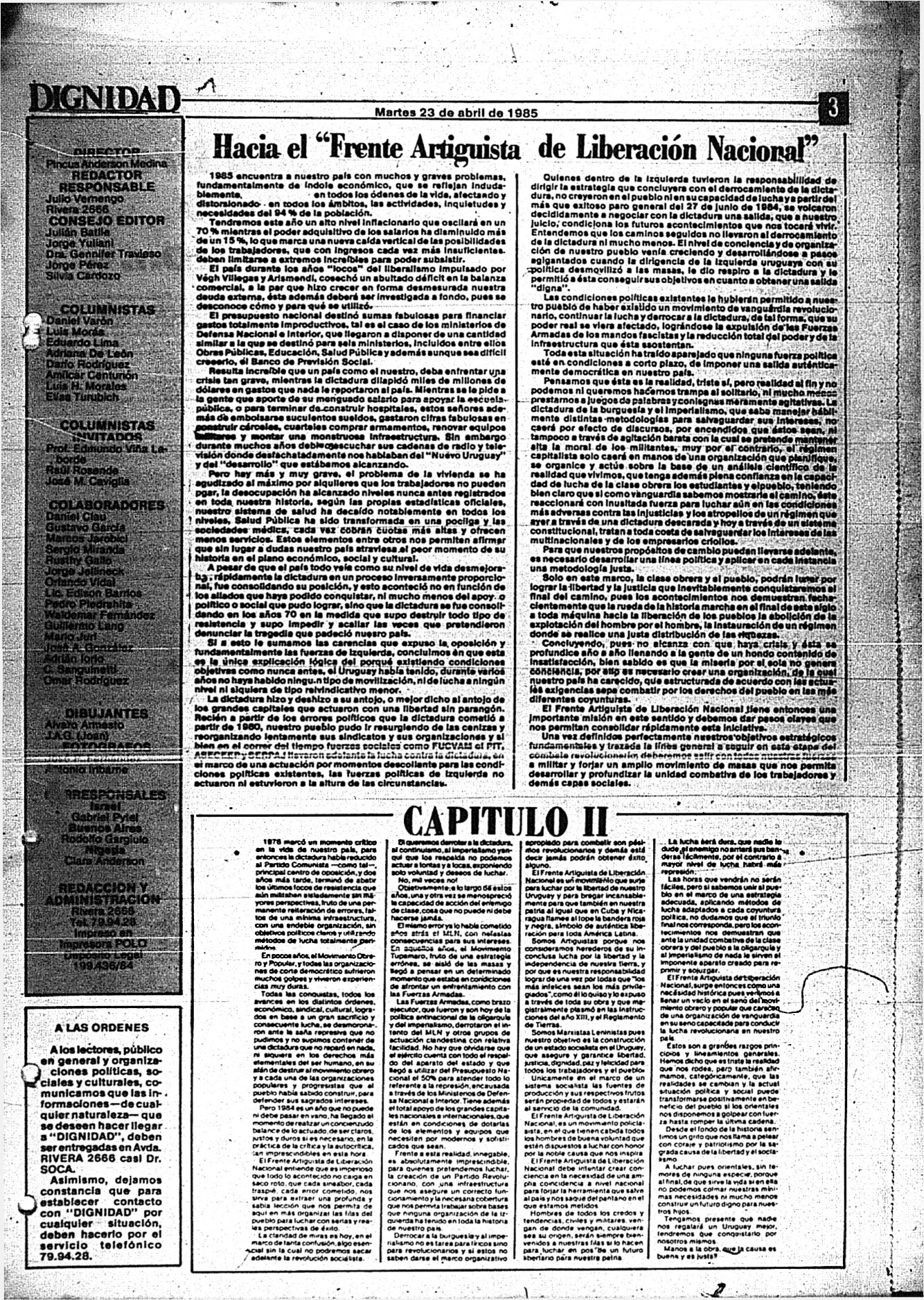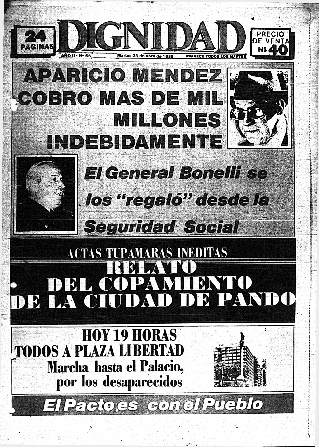Medio de prensa Dignidad Tipo Posdictadura Día de publicación 23 Mes de publicación 4 Año de publicación 1985 Origen Archivo Berrutti Archivo Berrutti Publicacion completa
