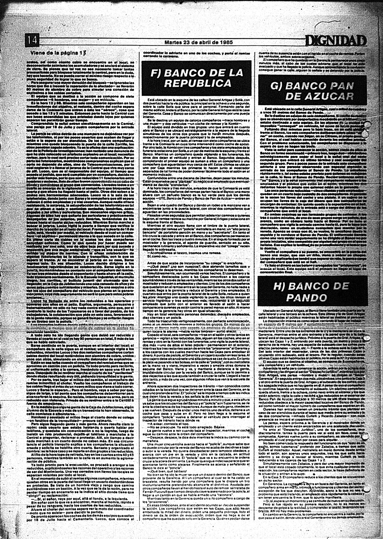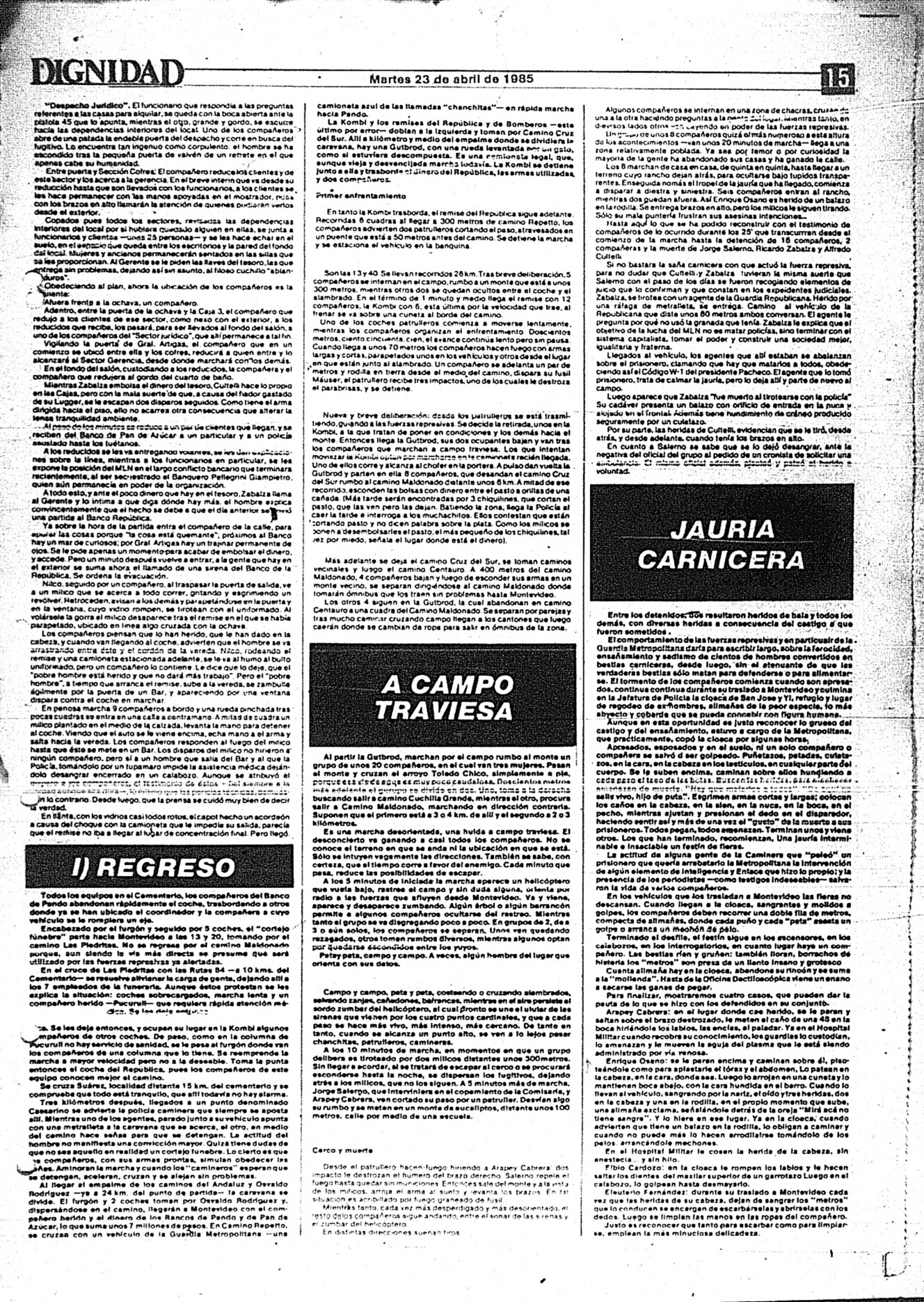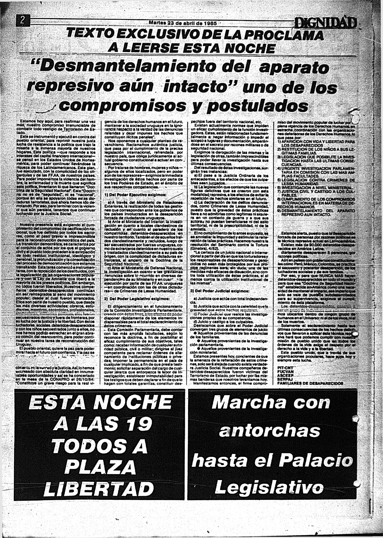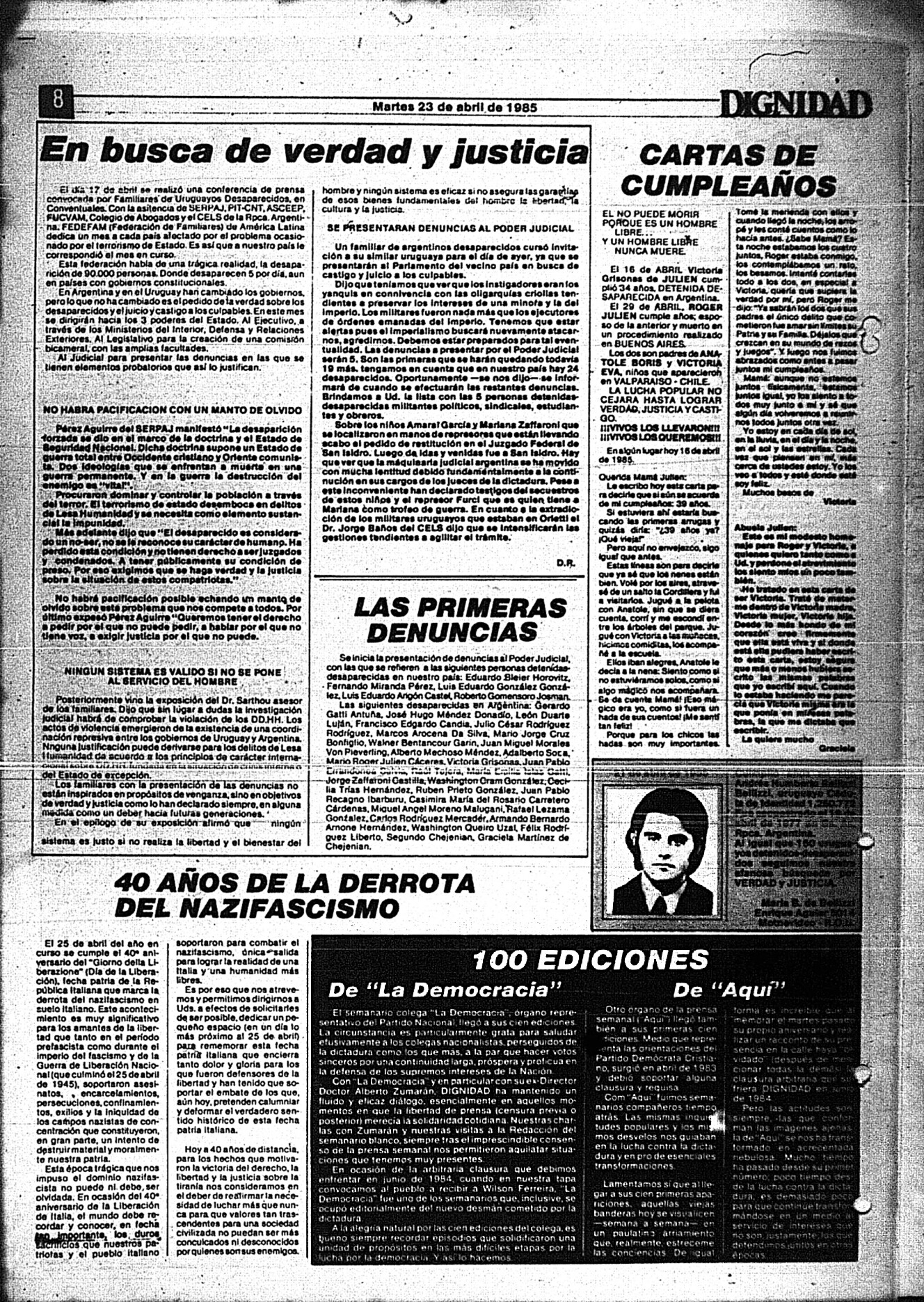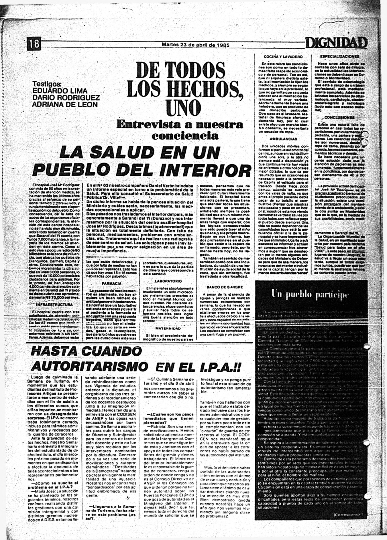 Medio de prensa Dignidad Tipo Posdictadura Día de publicación 23 Mes de publicación 4 Año de publicación 1985 Origen Archivo Berrutti Archivo Berrutti Publicacion completa