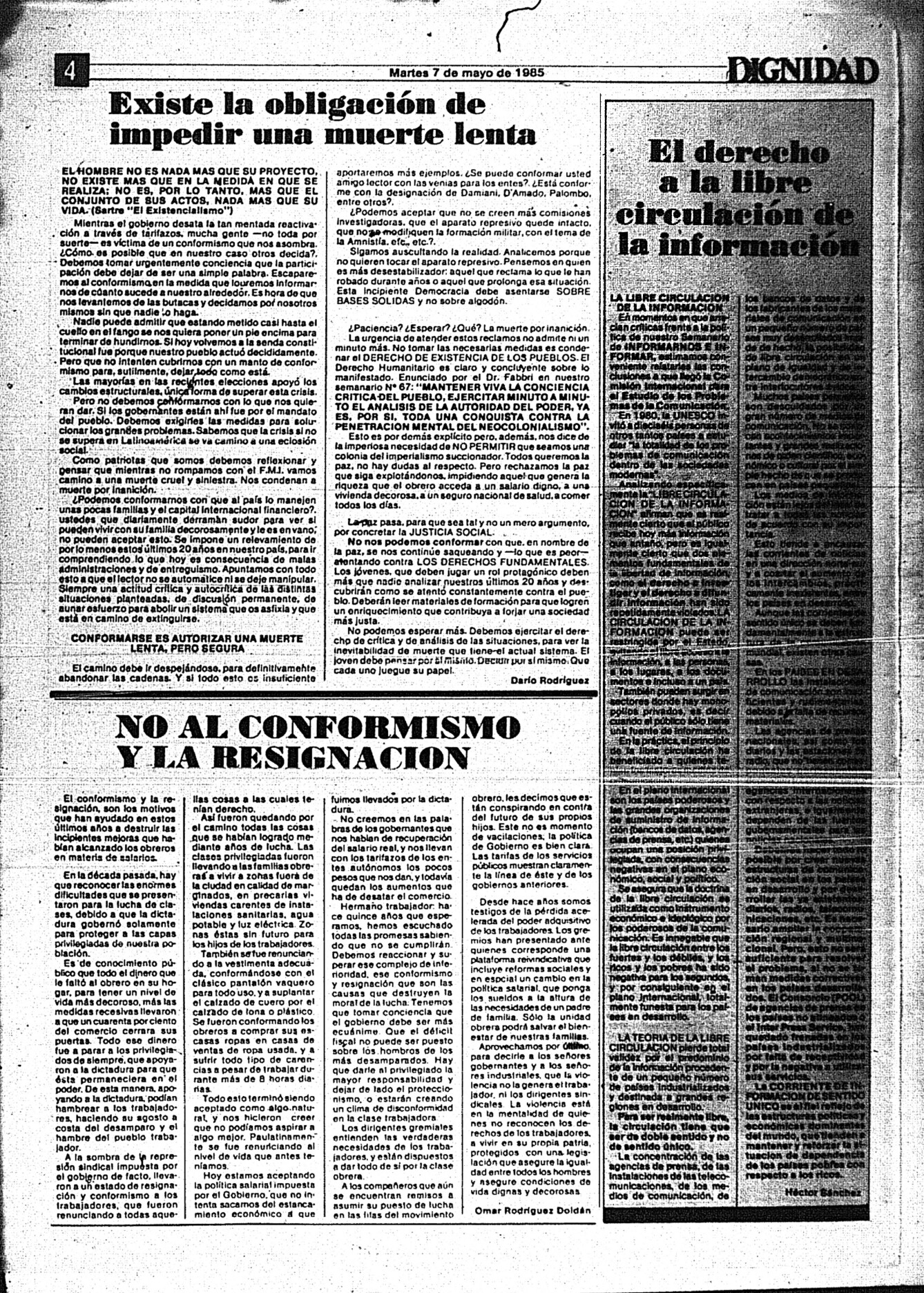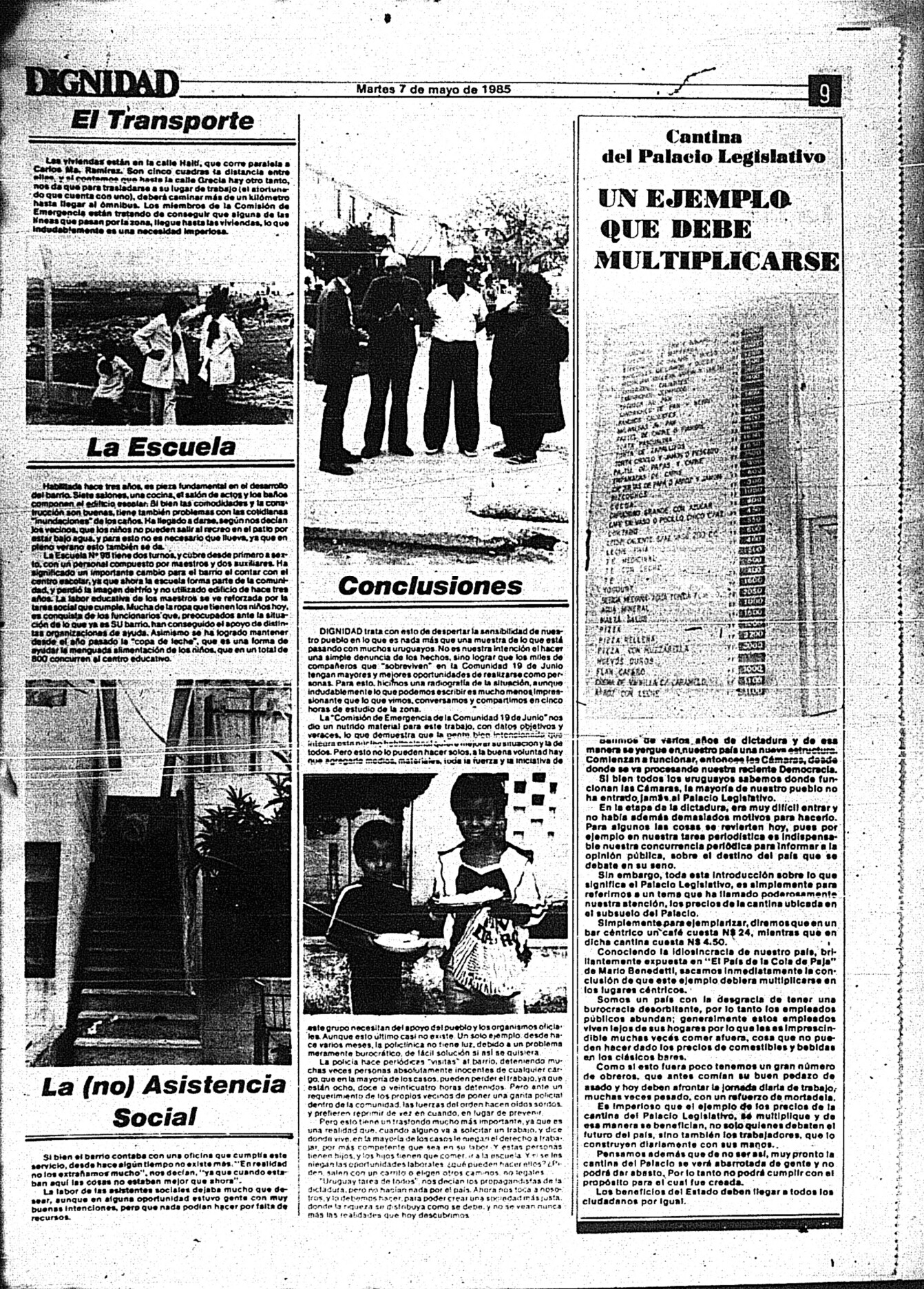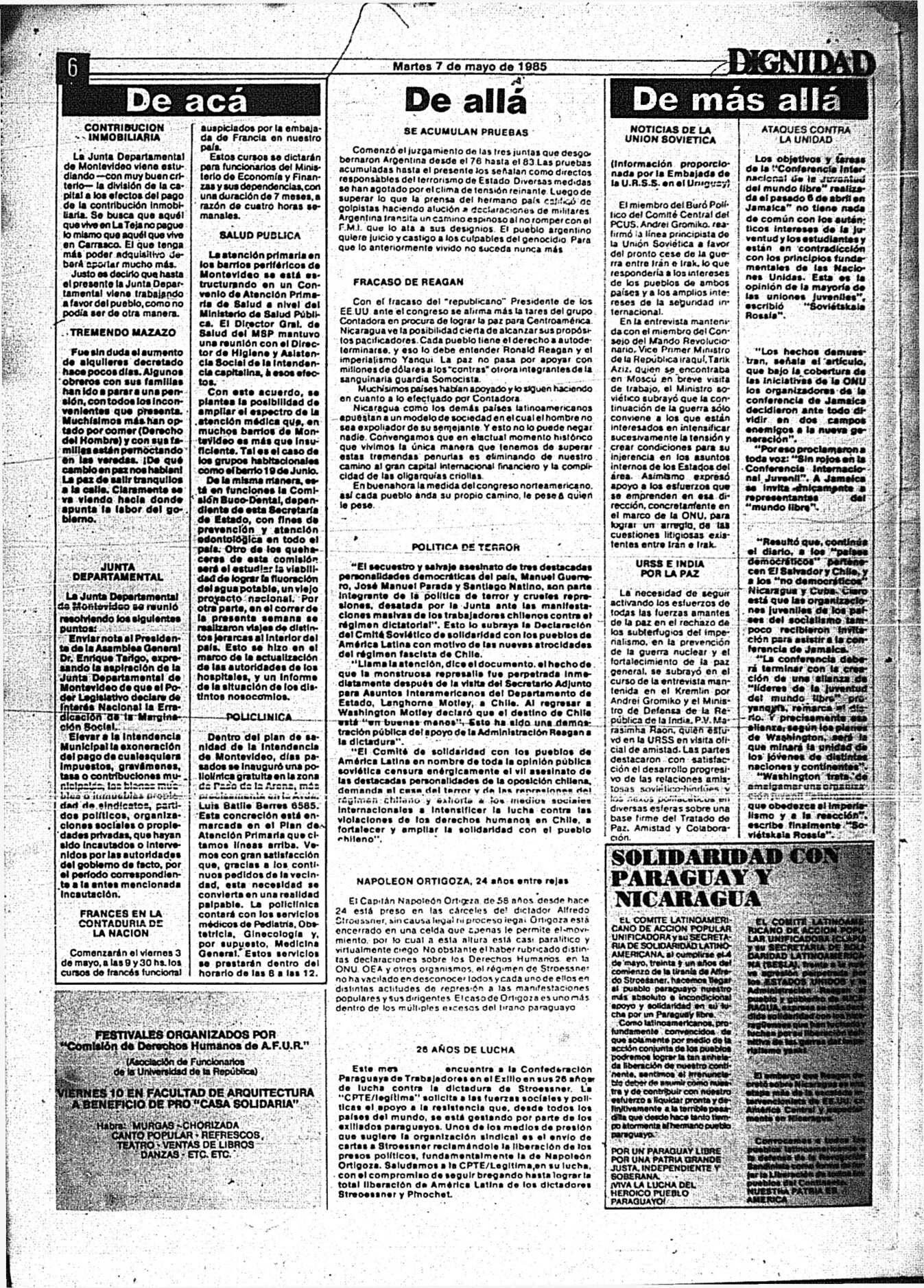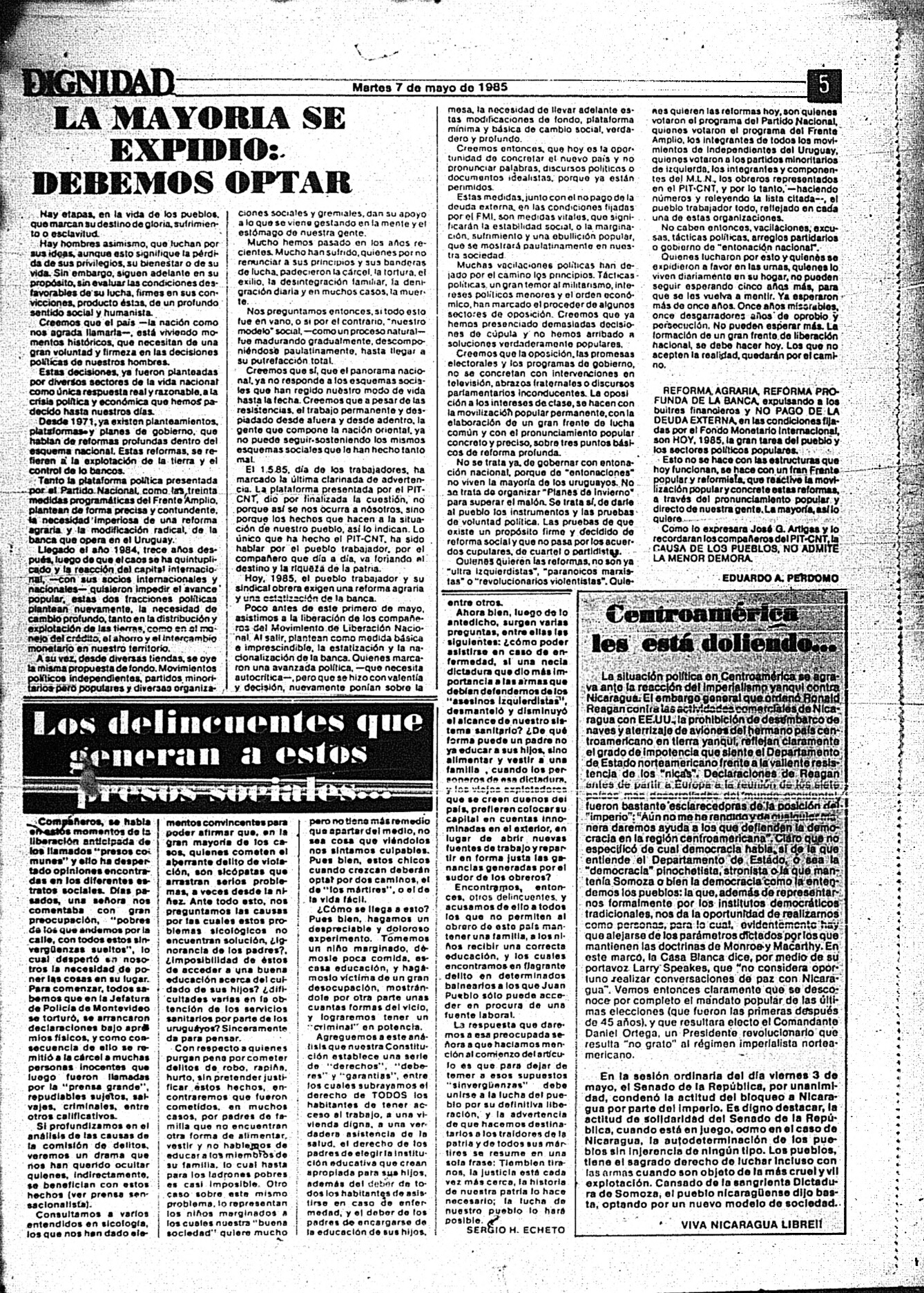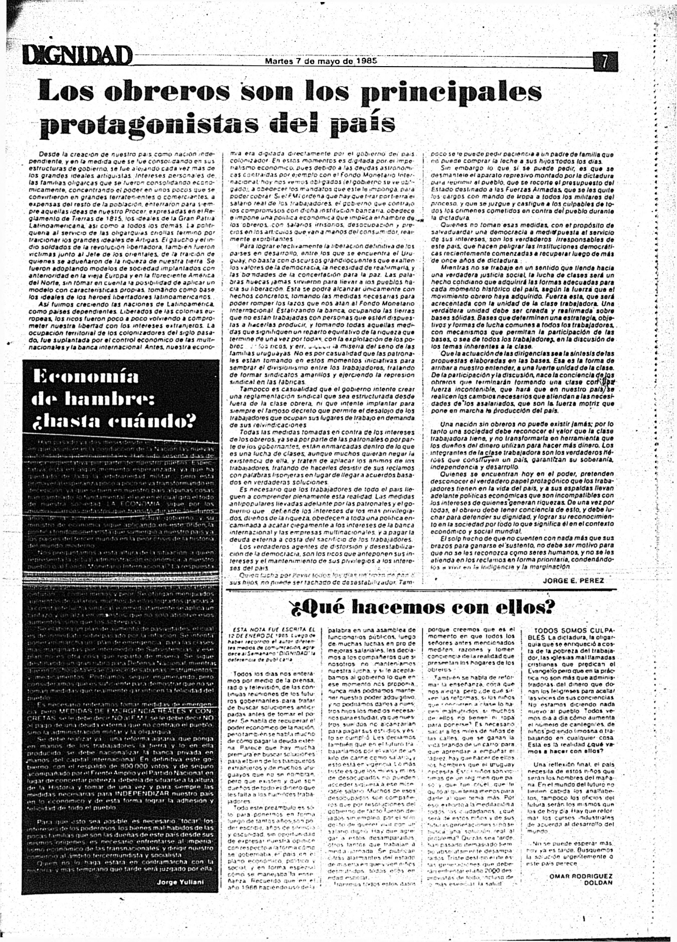 Medio de prensa Dignidad Tipo Posdictadura Día de publicación 7 Mes de publicación 5 Año de publicación 1985 Origen Archivo Berrutti Archivo Berrutti Publicacion completa