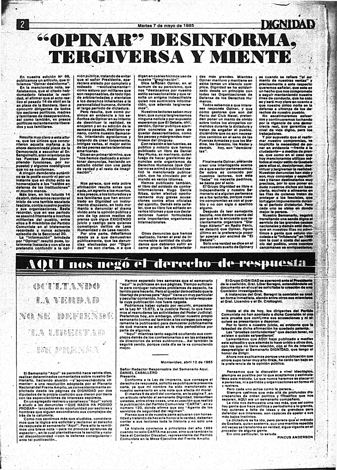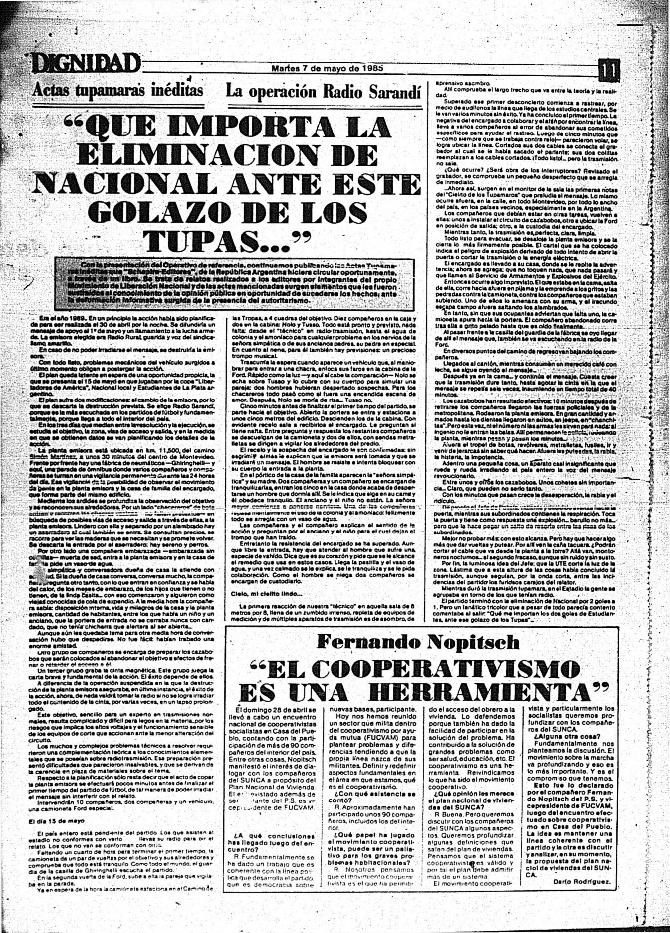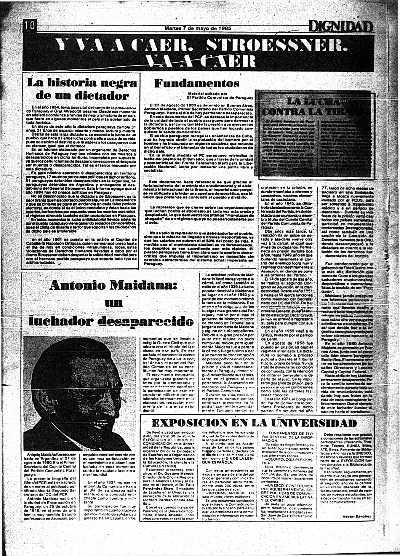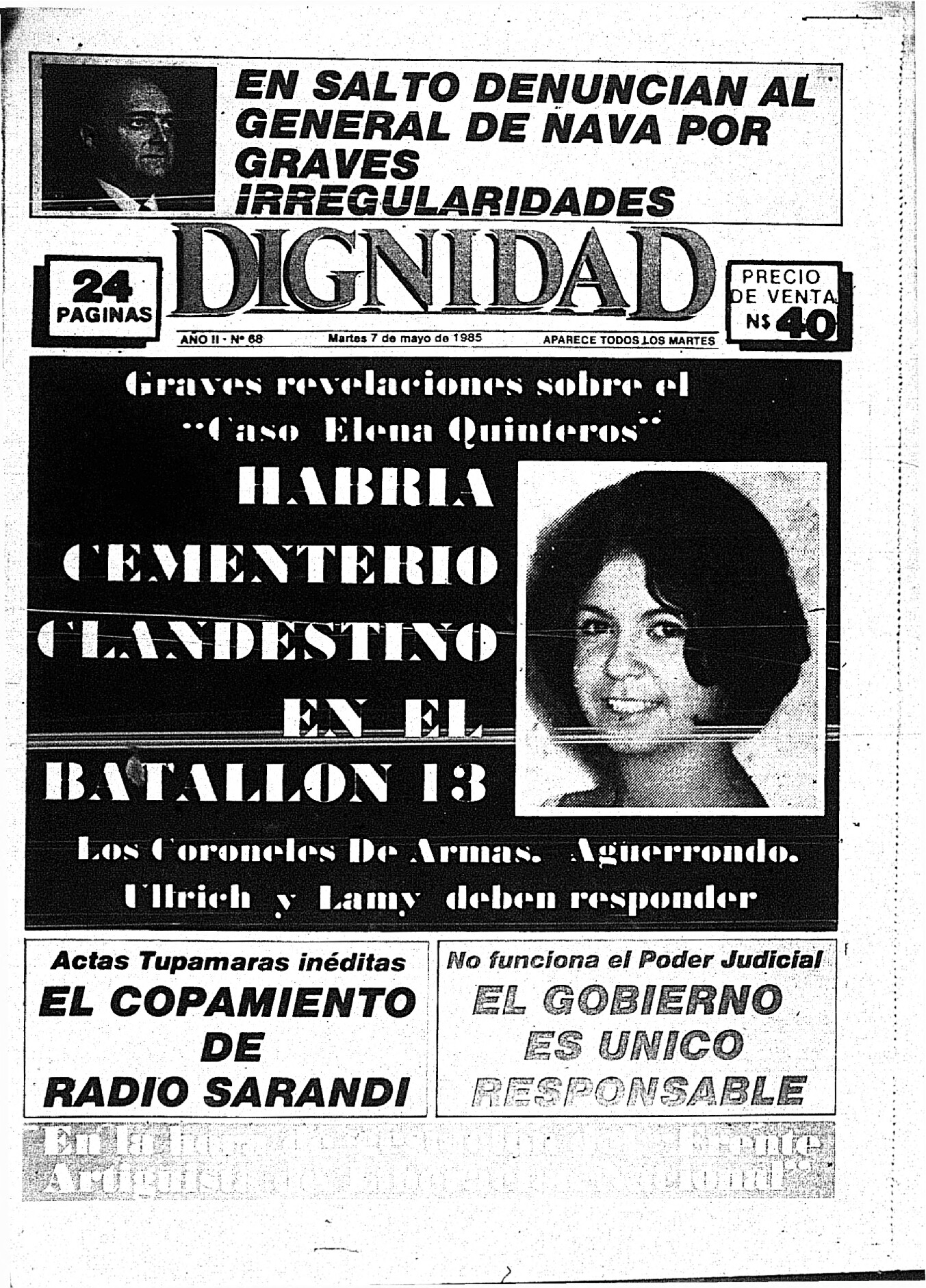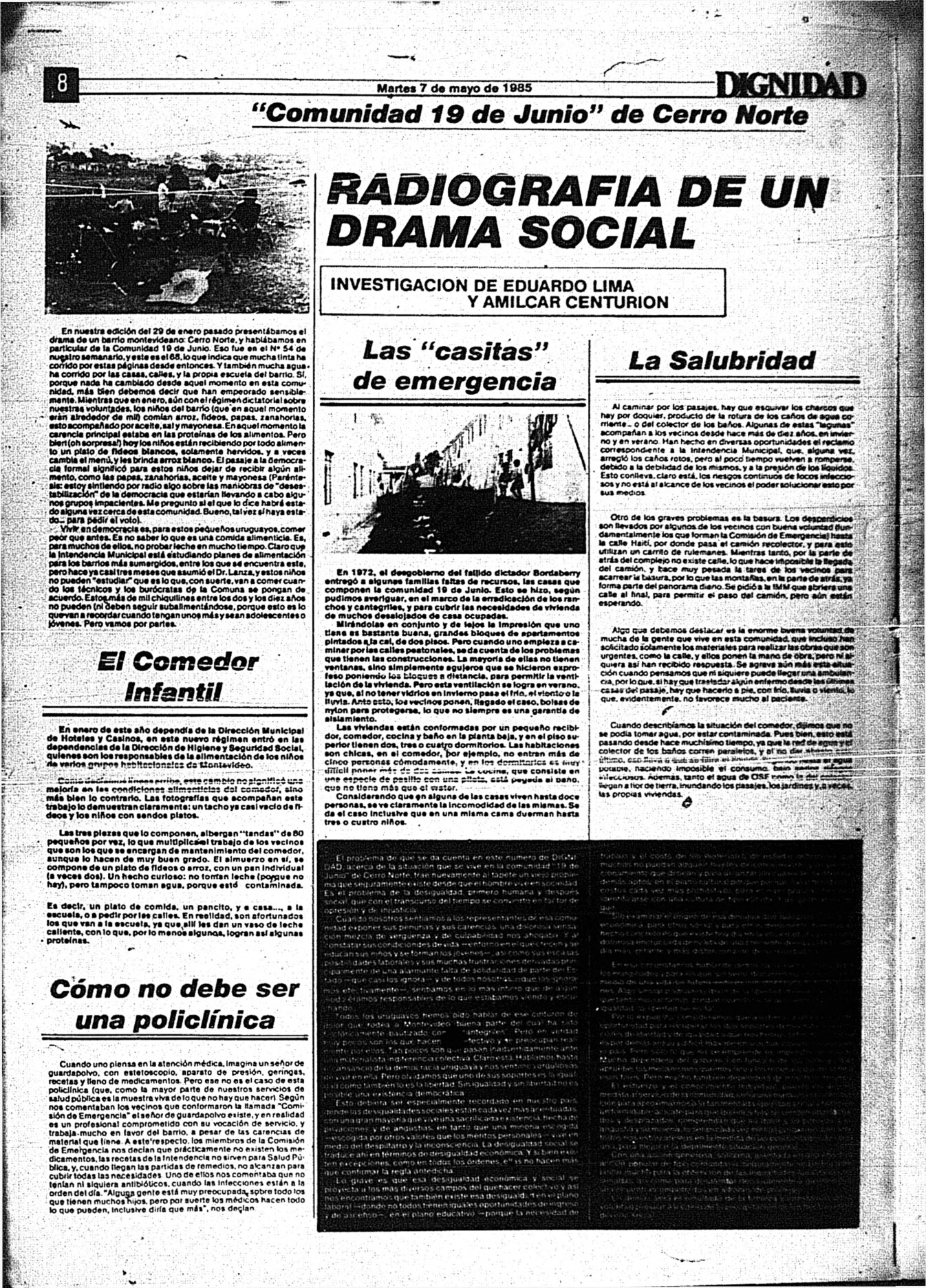 Medio de prensa Dignidad Tipo Posdictadura Día de publicación 7 Mes de publicación 5 Año de publicación 1985 Origen Archivo Berrutti Archivo Berrutti Publicacion completa