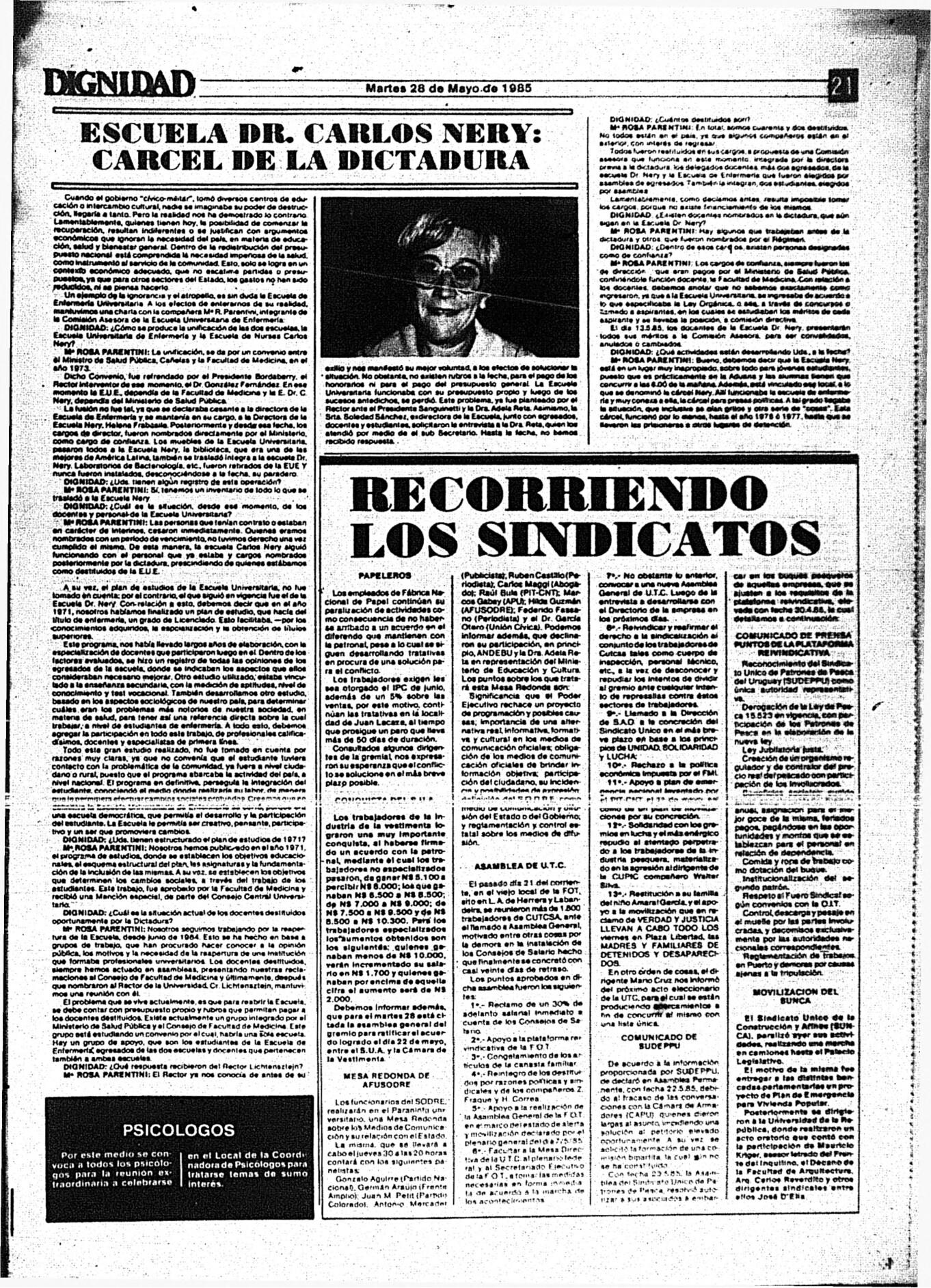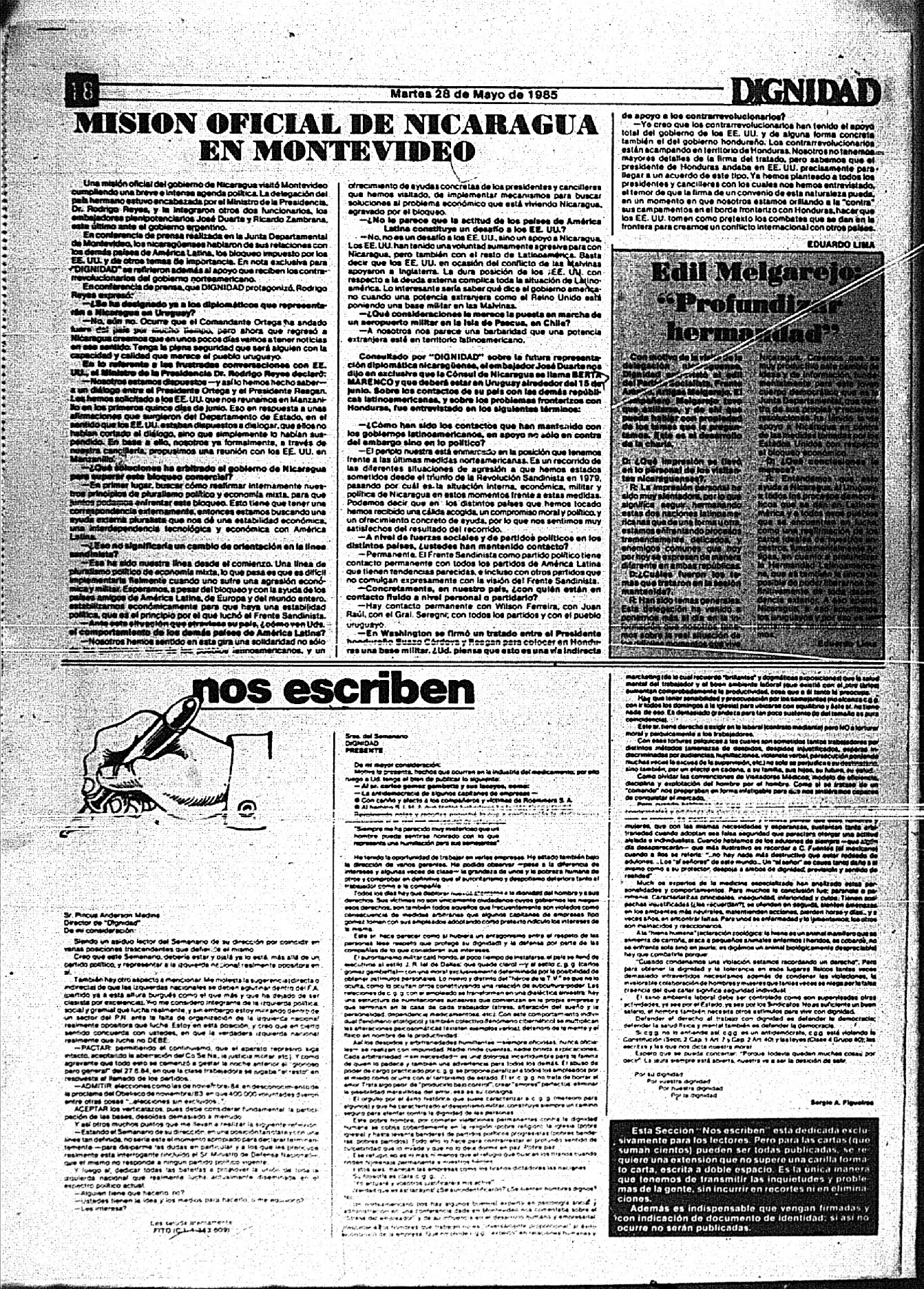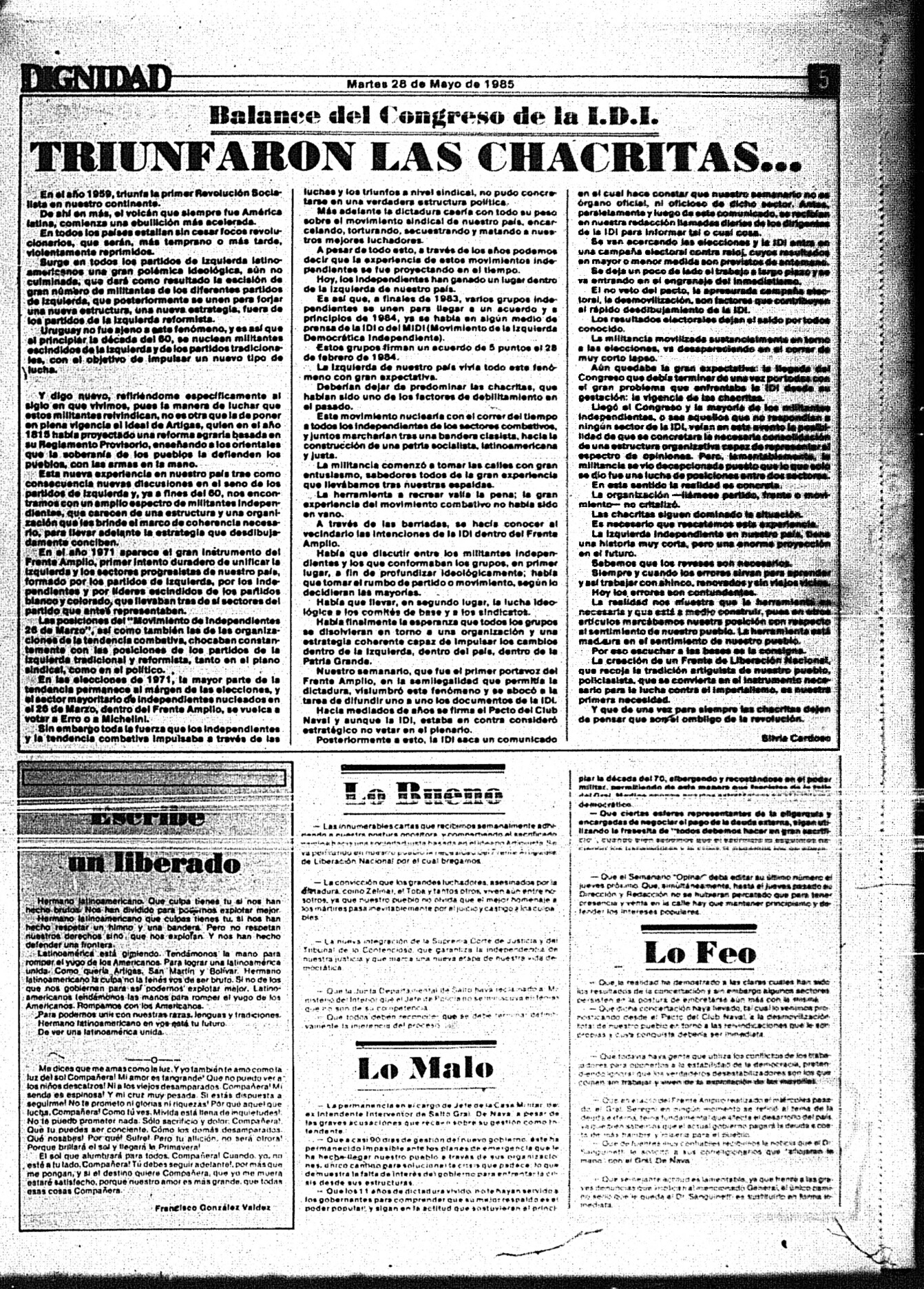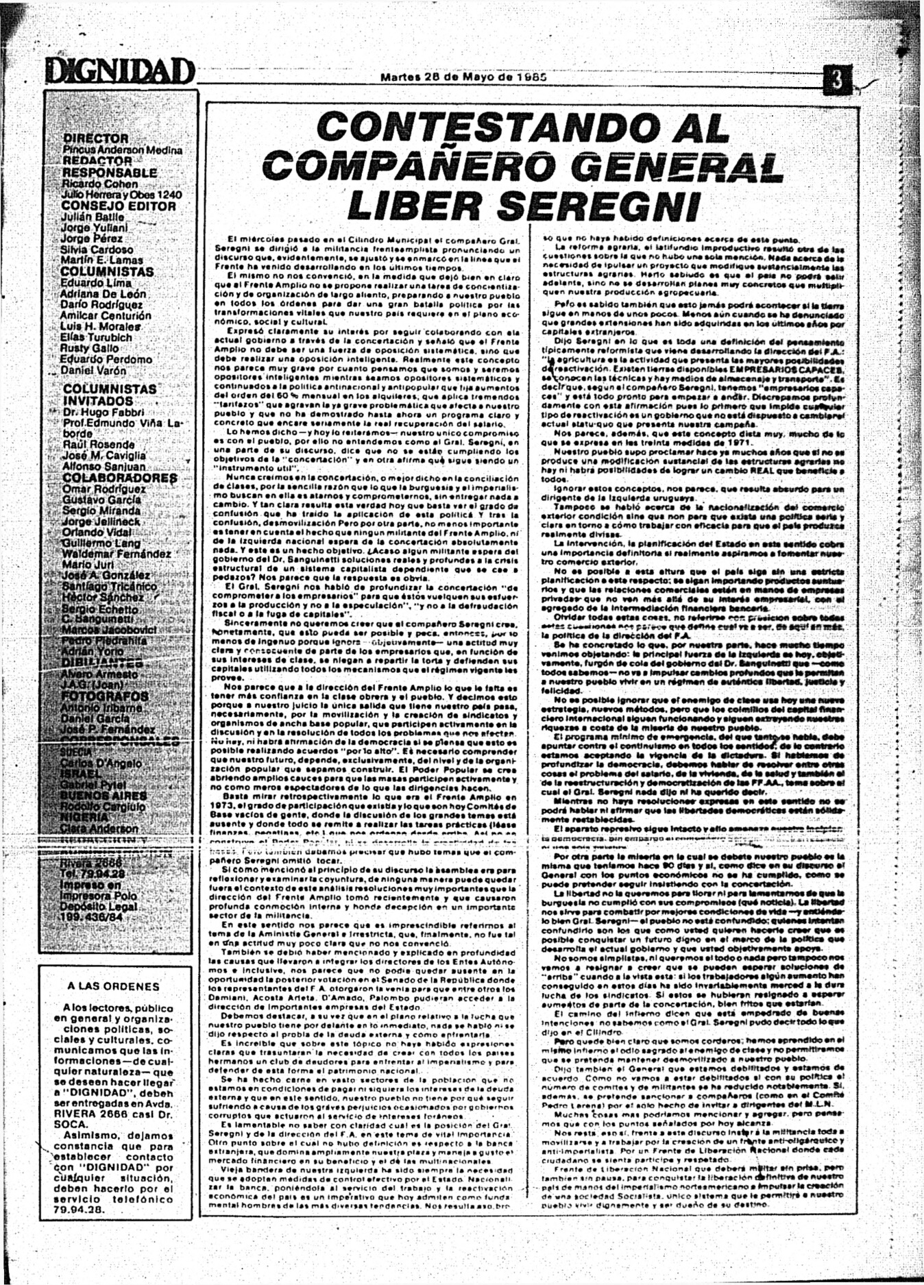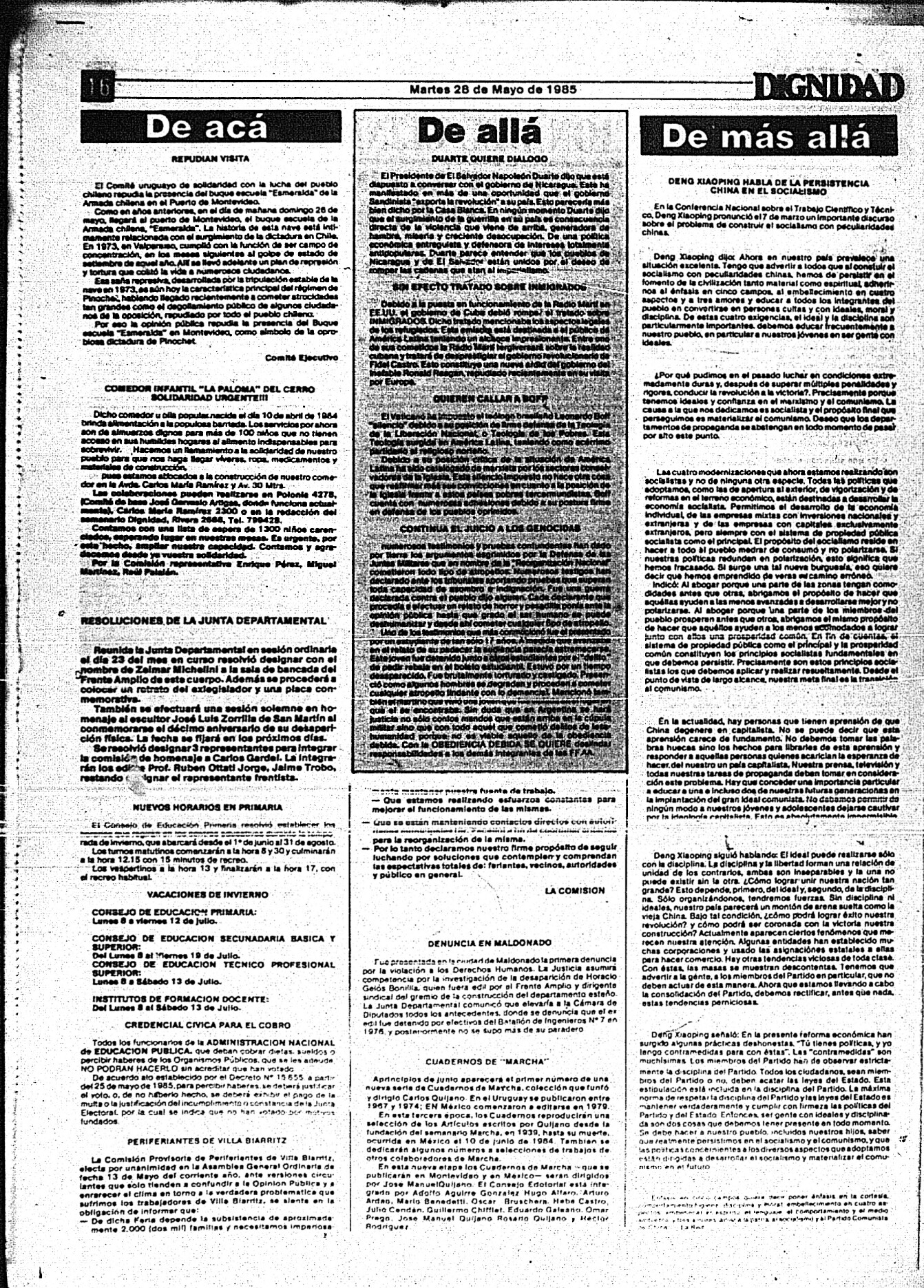Medio de prensa Dignidad Tipo Posdictadura Día de publicación 28 Mes de publicación 5 Año de publicación 1985 Origen Archivo Berrutti Archivo Berrutti Publicacion completa