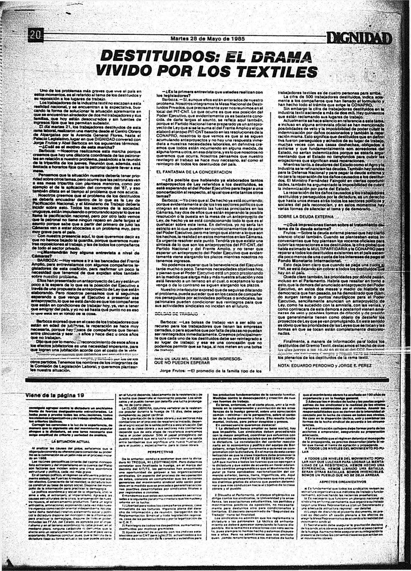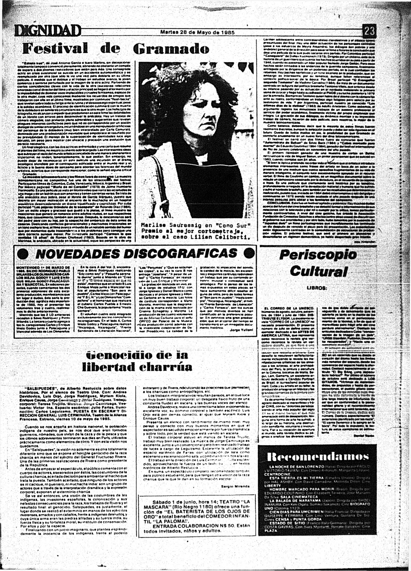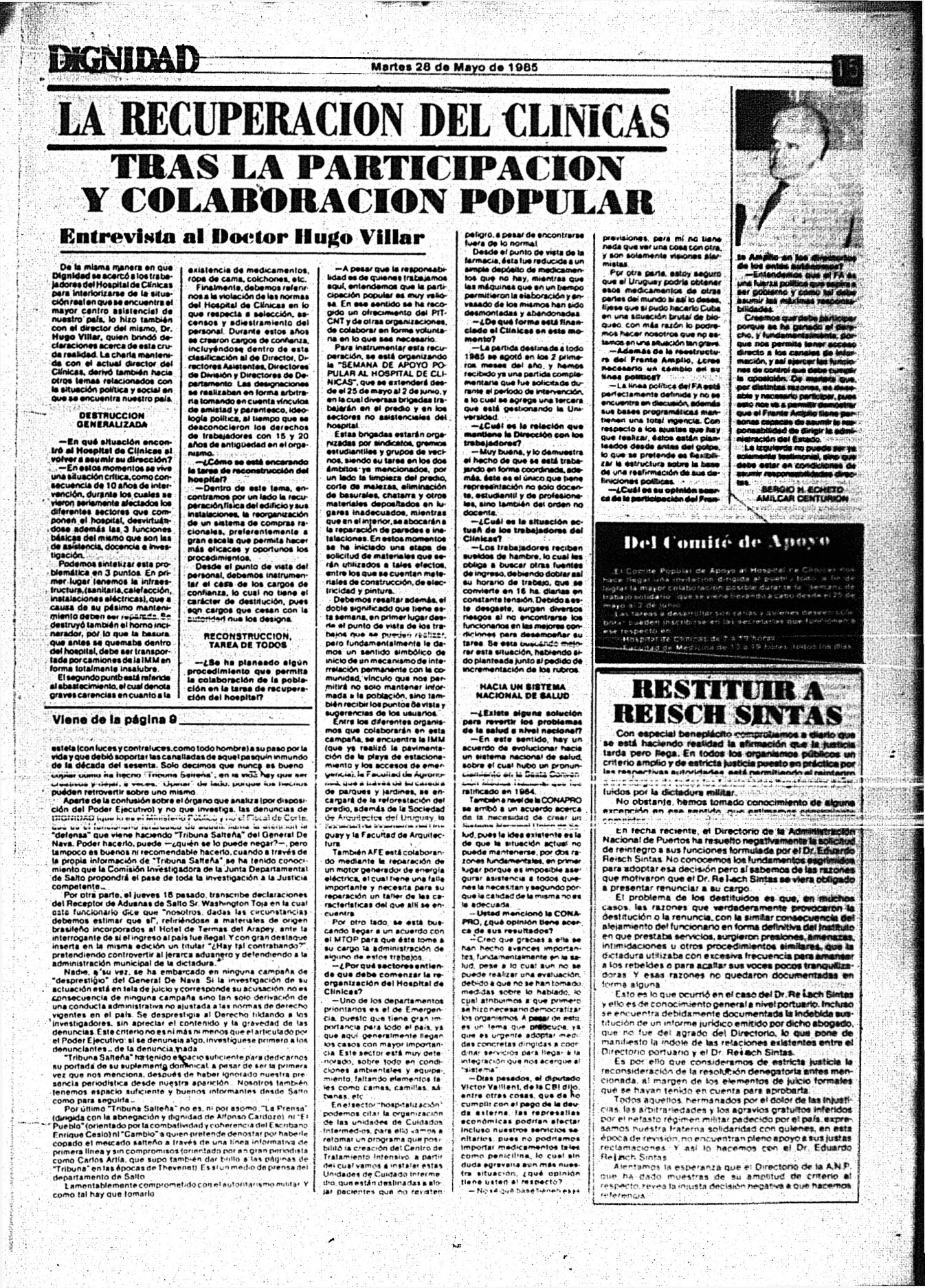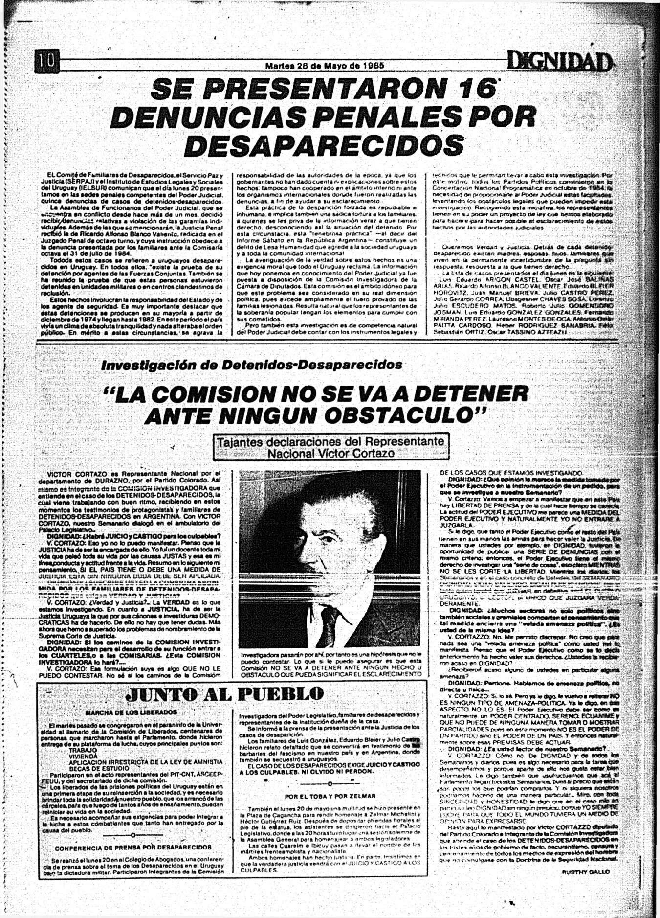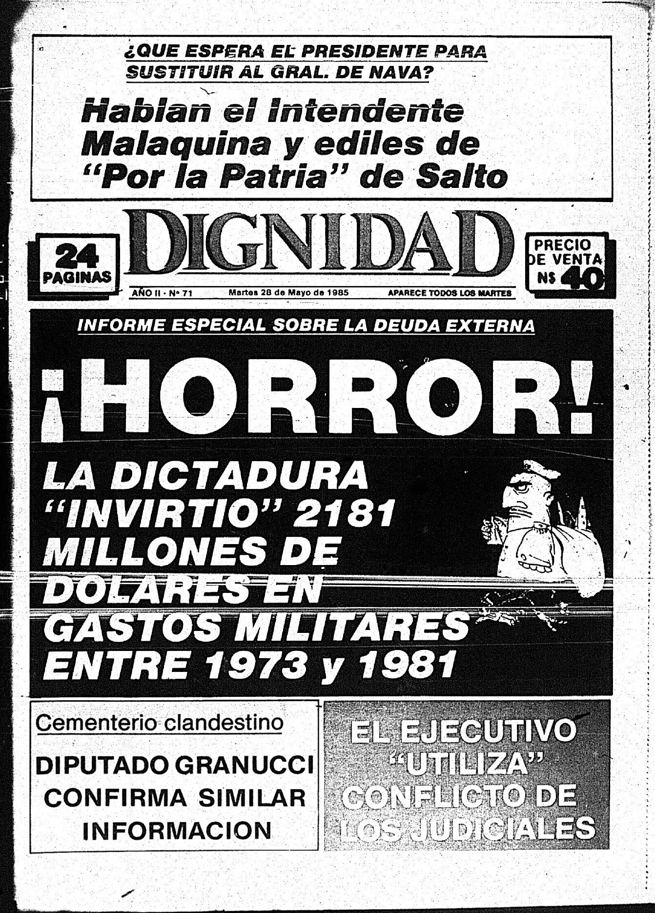 Medio de prensa Dignidad Tipo Posdictadura Día de publicación 28 Mes de publicación 5 Año de publicación 1985 Origen Archivo Berrutti Archivo Berrutti Publicacion completa