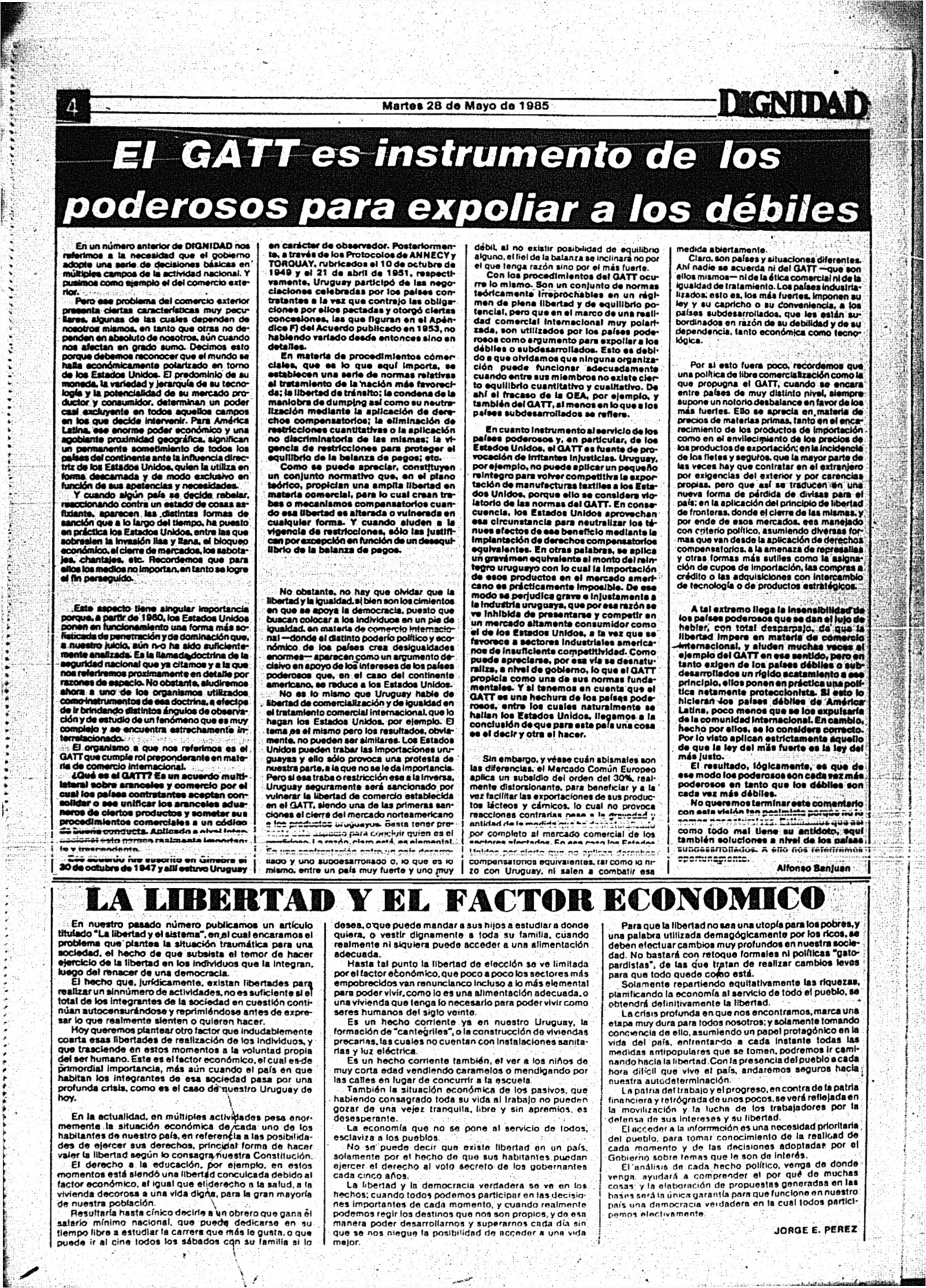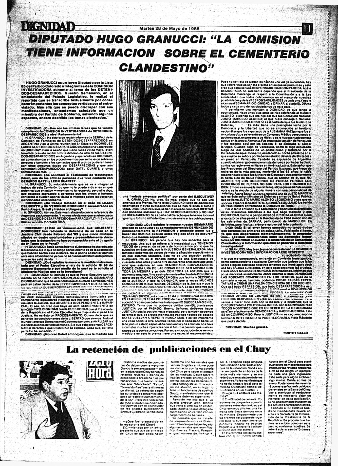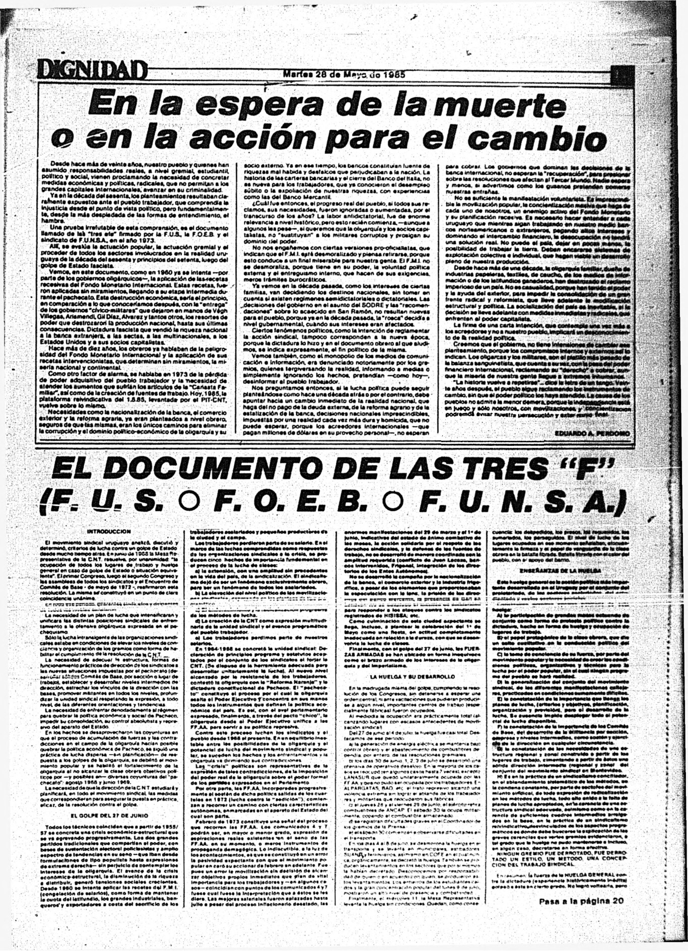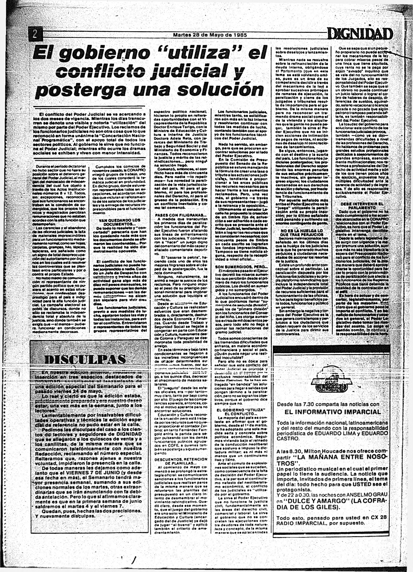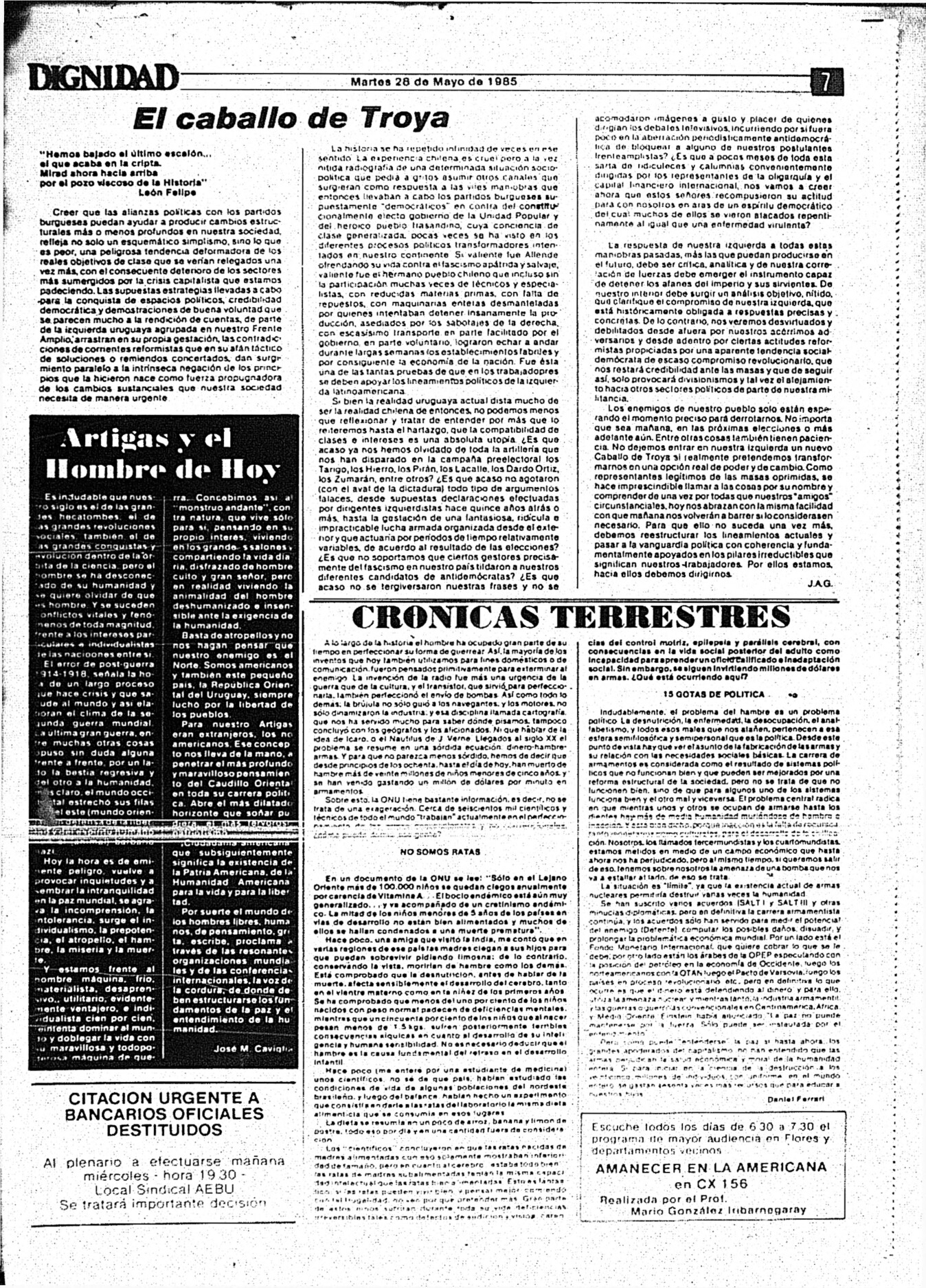 Medio de prensa Dignidad Tipo Posdictadura Día de publicación 28 Mes de publicación 5 Año de publicación 1985 Origen Archivo Berrutti Archivo Berrutti Publicacion completa