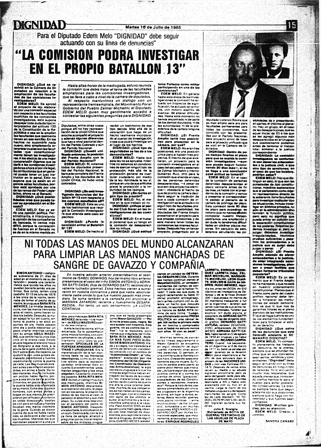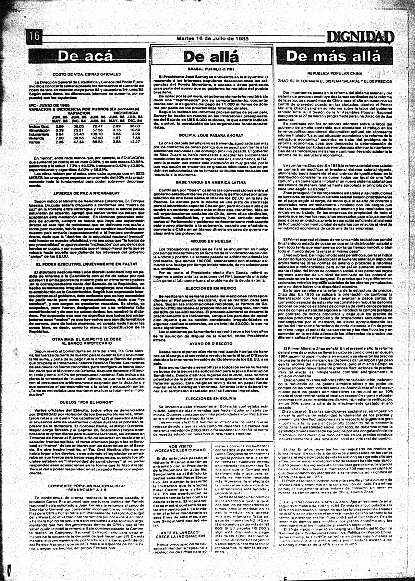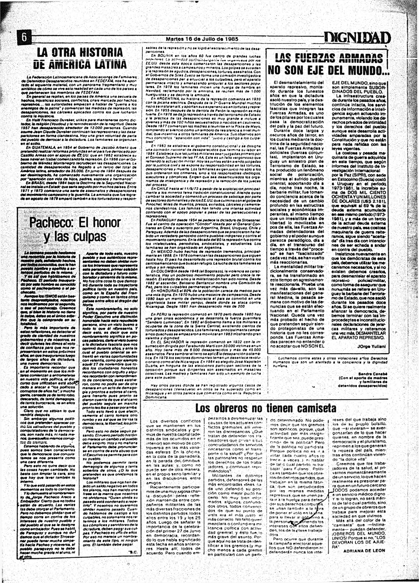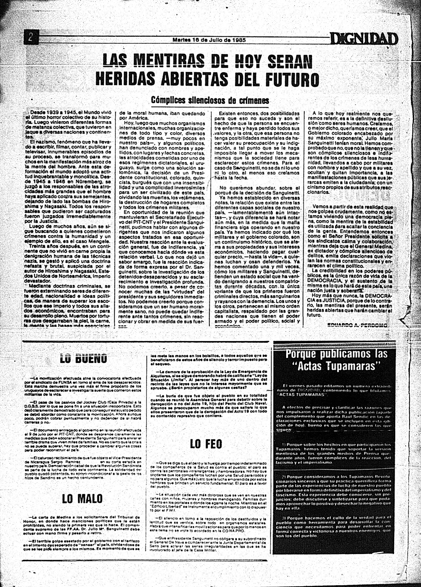 Medio de prensa Dignidad Tipo Posdictadura Día de publicación 16 Mes de publicación 7 Año de publicación 1985 Origen Archivo Berrutti Archivo Berrutti Publicacion completa