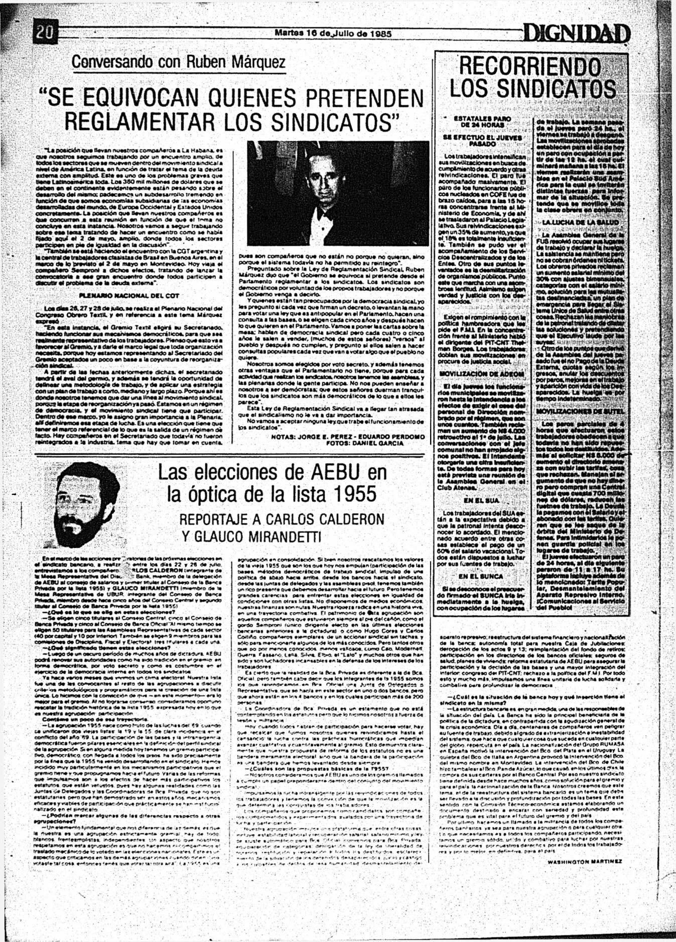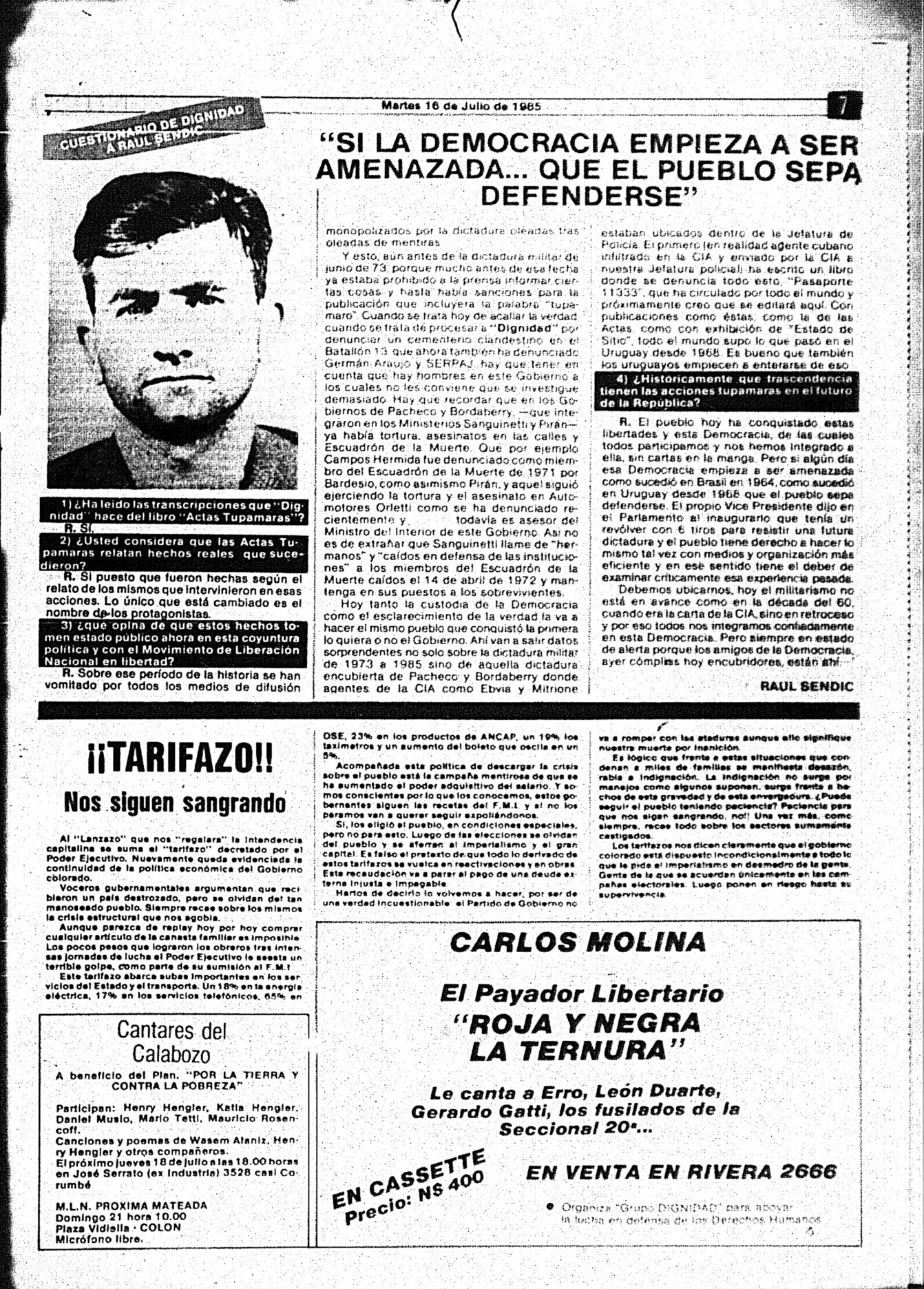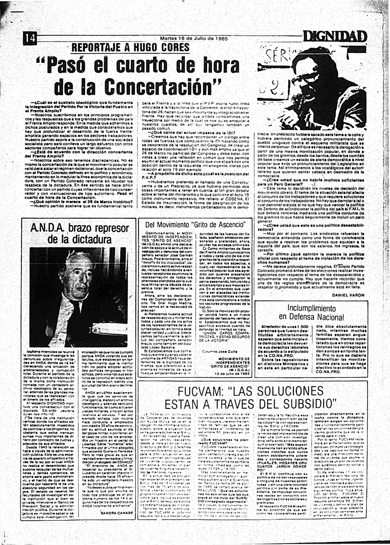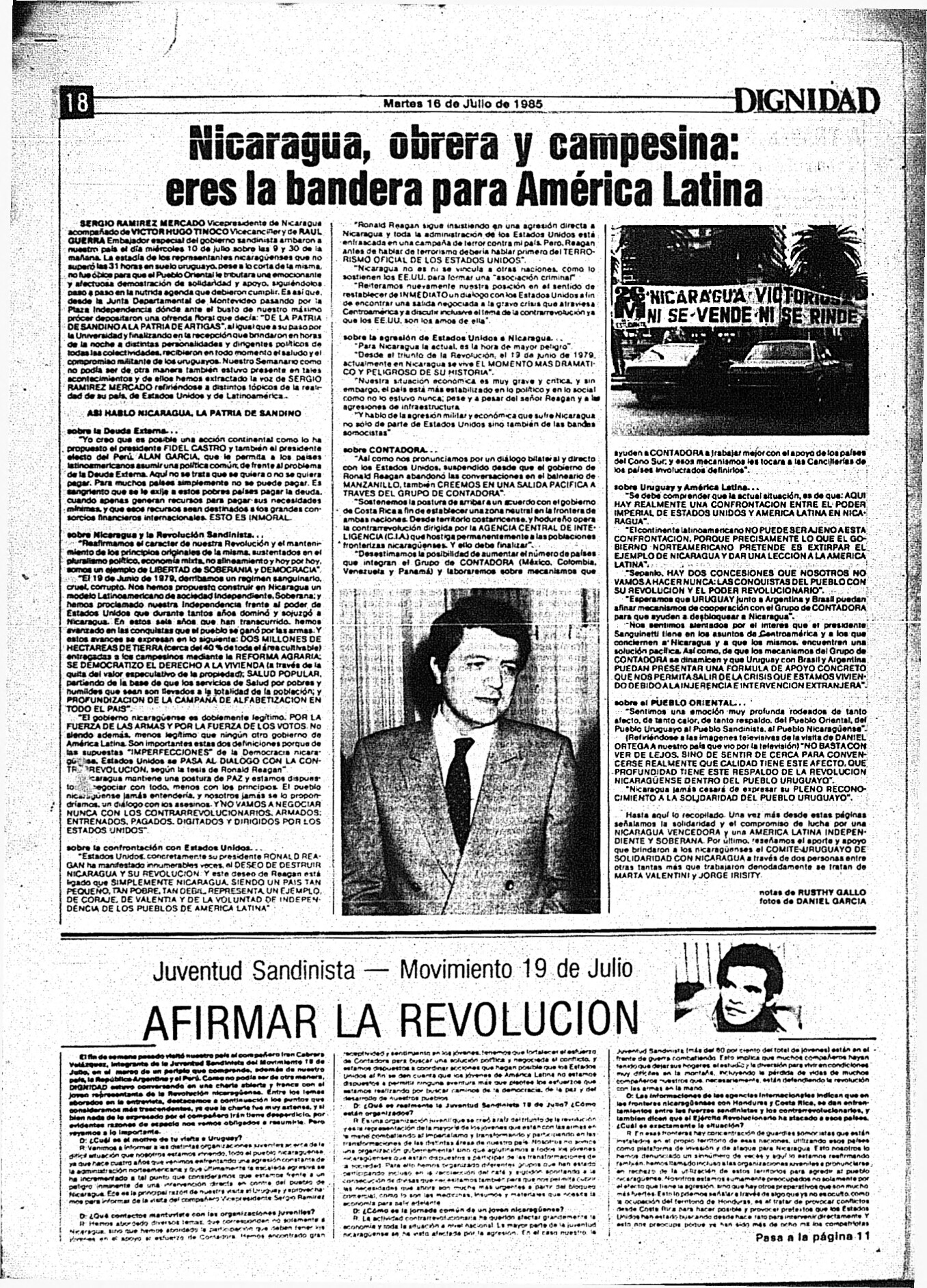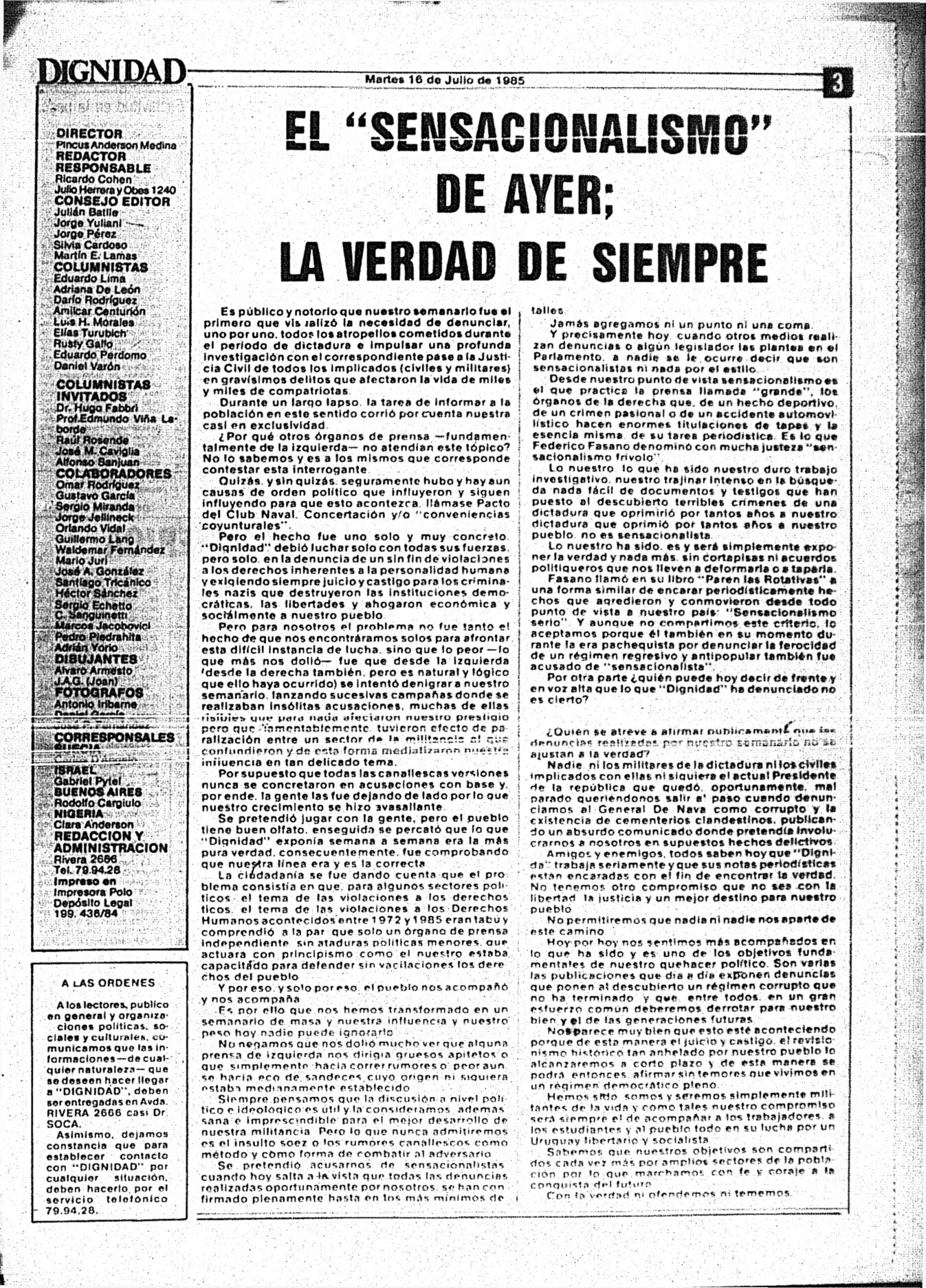 Medio de prensa Dignidad Tipo Posdictadura Día de publicación 16 Mes de publicación 7 Año de publicación 1985 Origen Archivo Berrutti Archivo Berrutti Publicacion completa