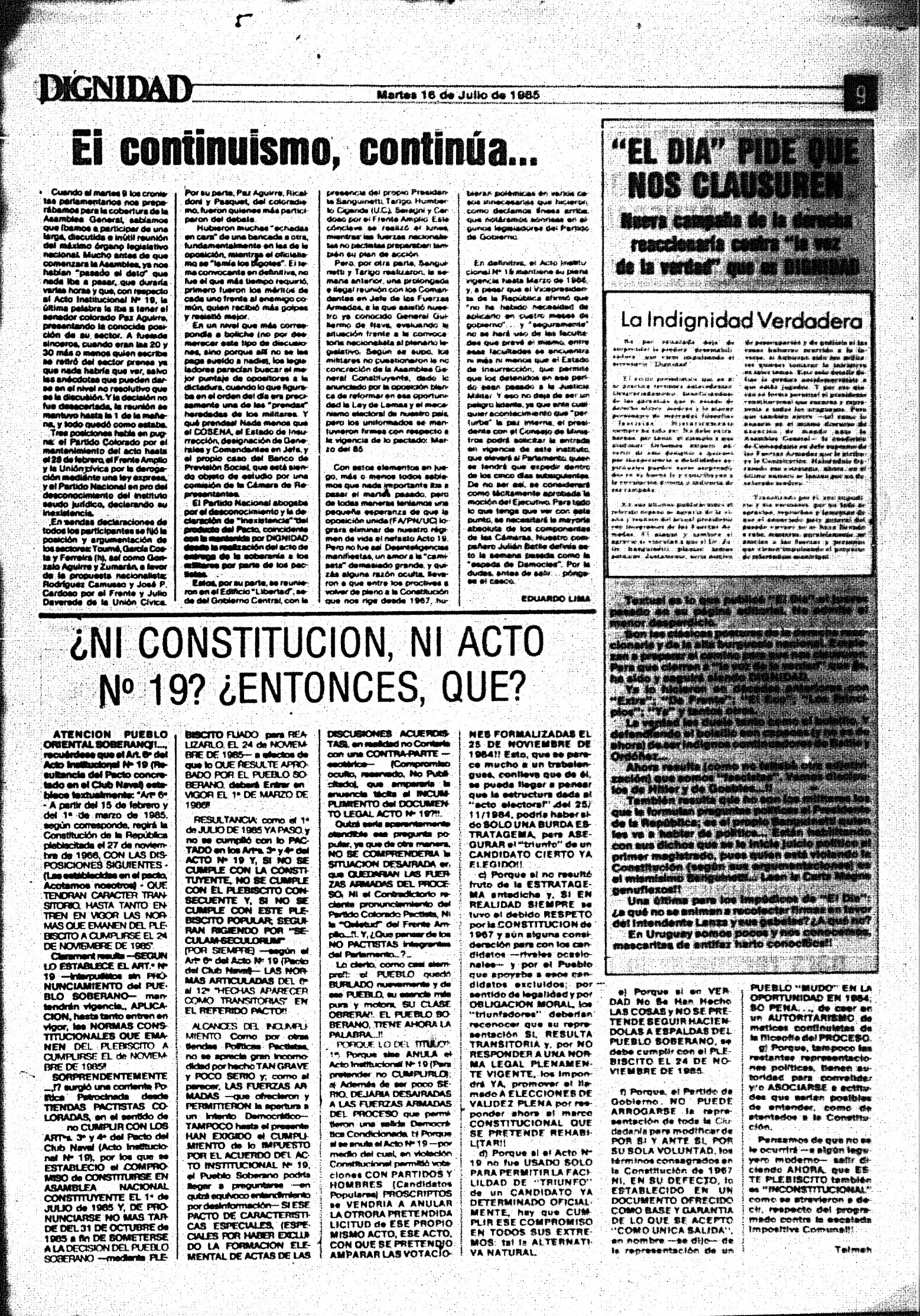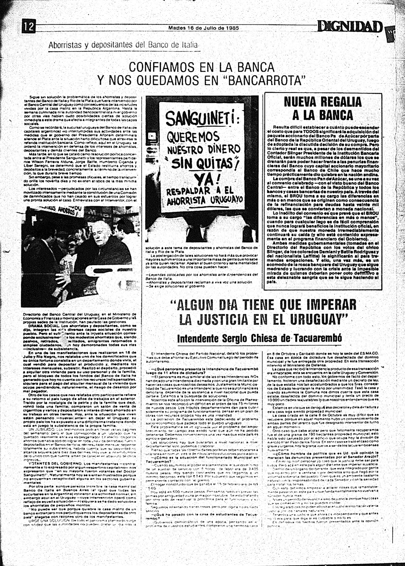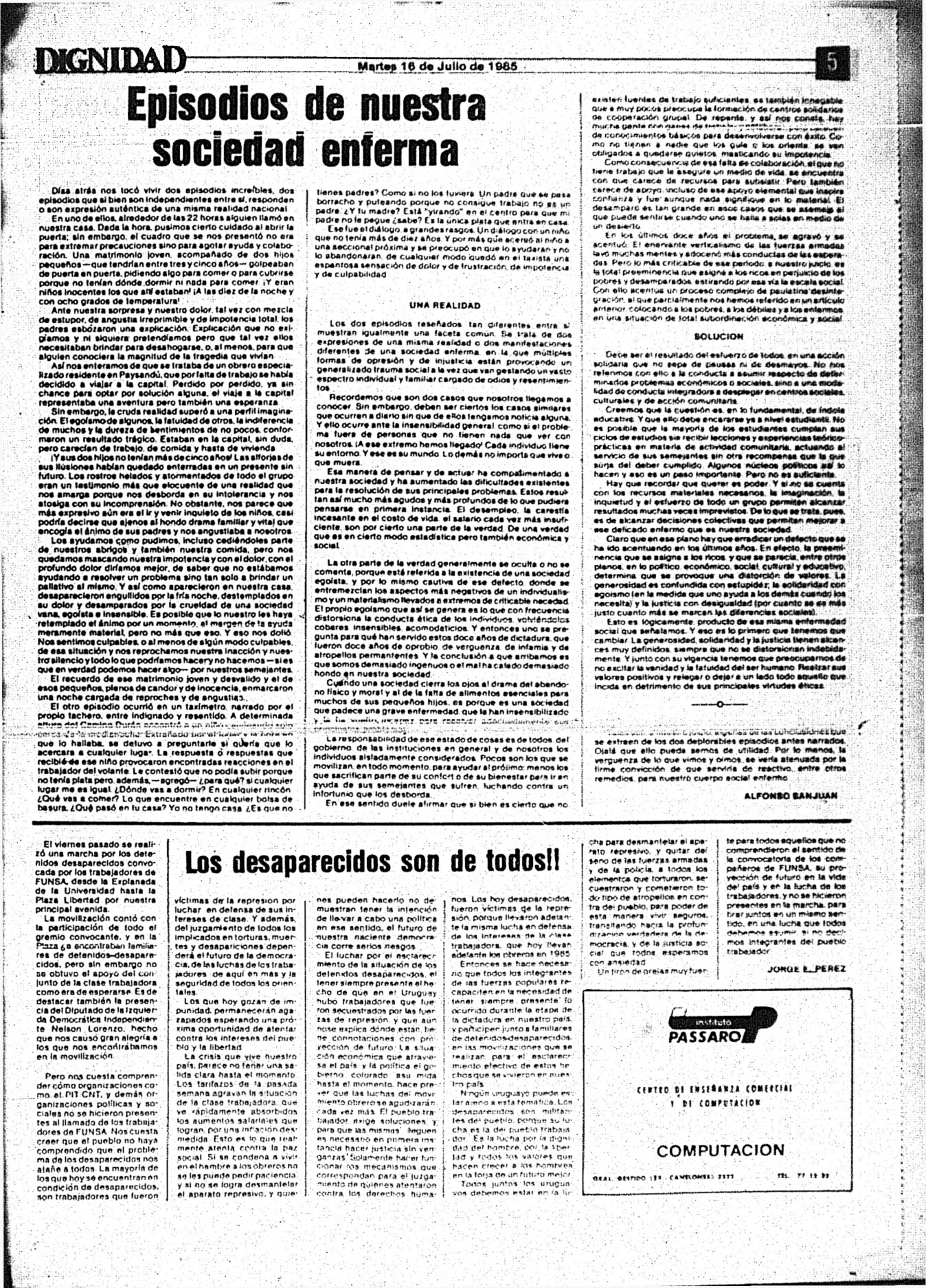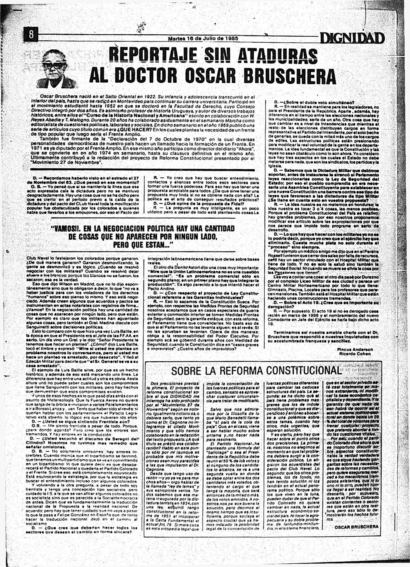 Medio de prensa Dignidad Tipo Posdictadura Día de publicación 16 Mes de publicación 7 Año de publicación 1985 Origen Archivo Berrutti Archivo Berrutti Publicacion completa