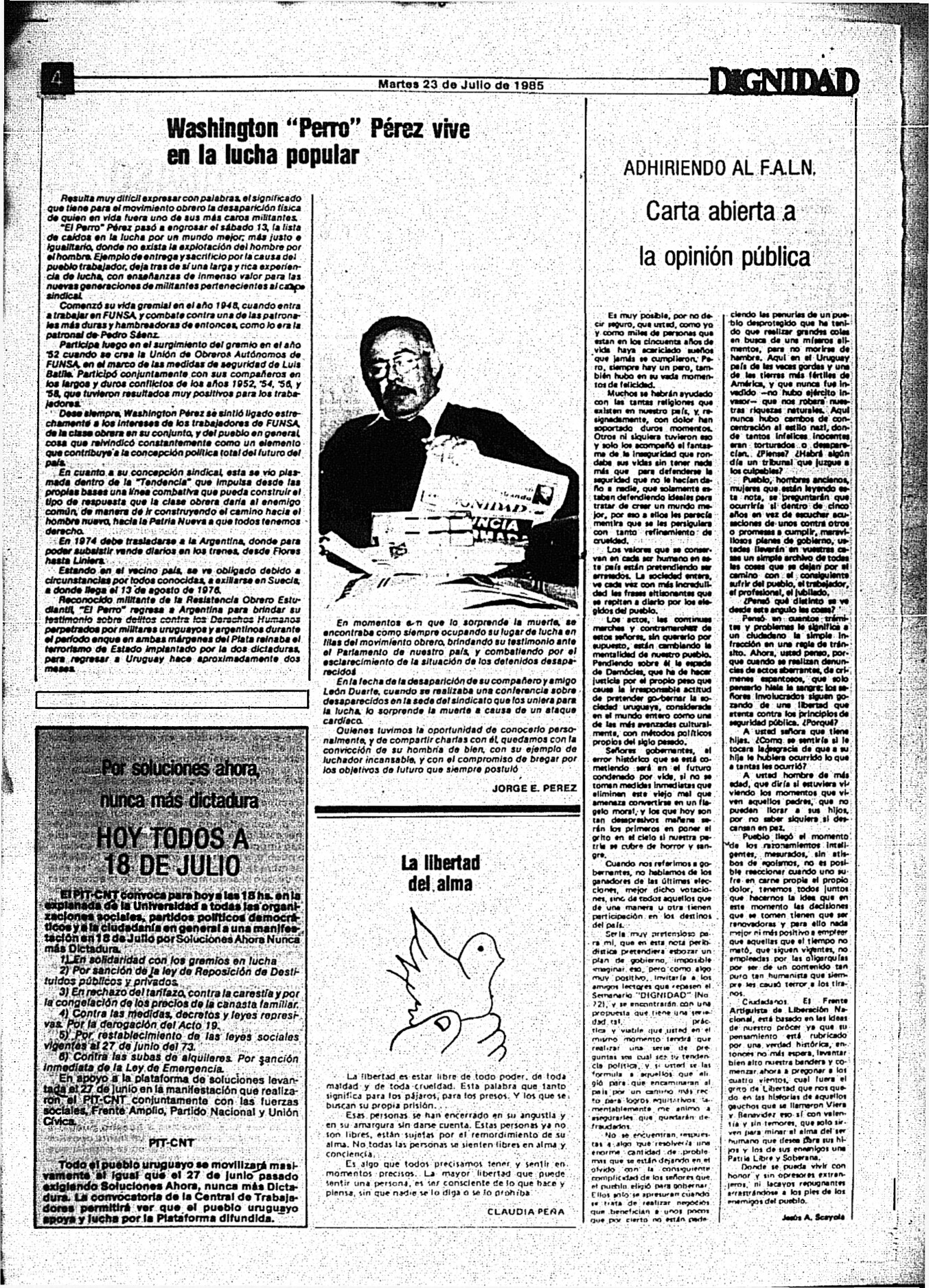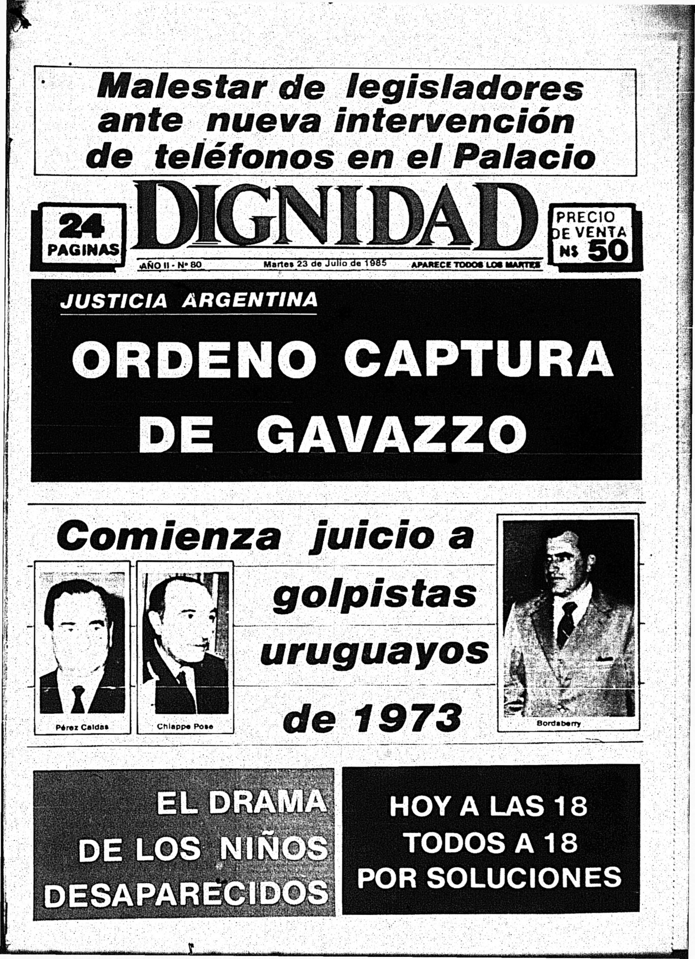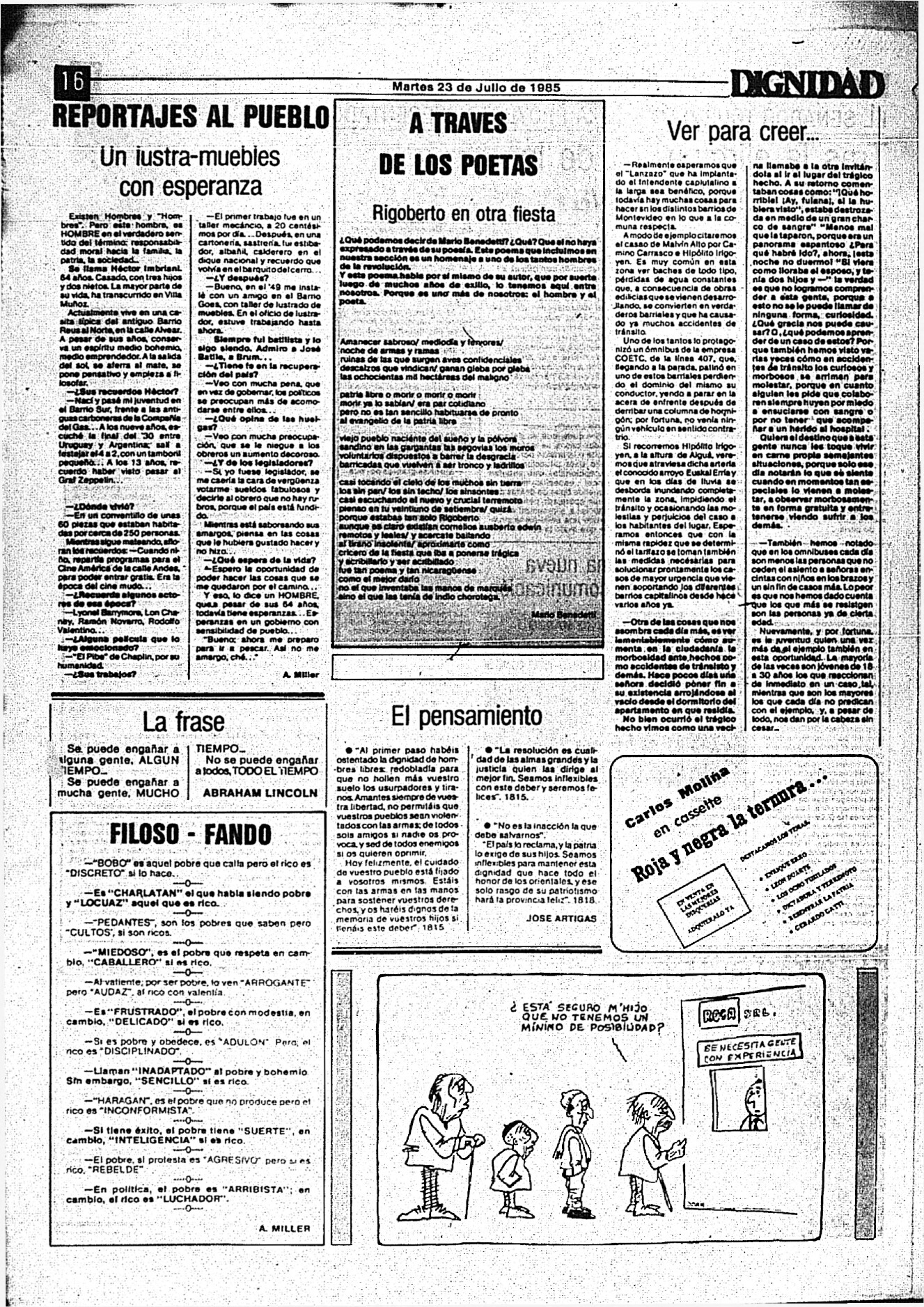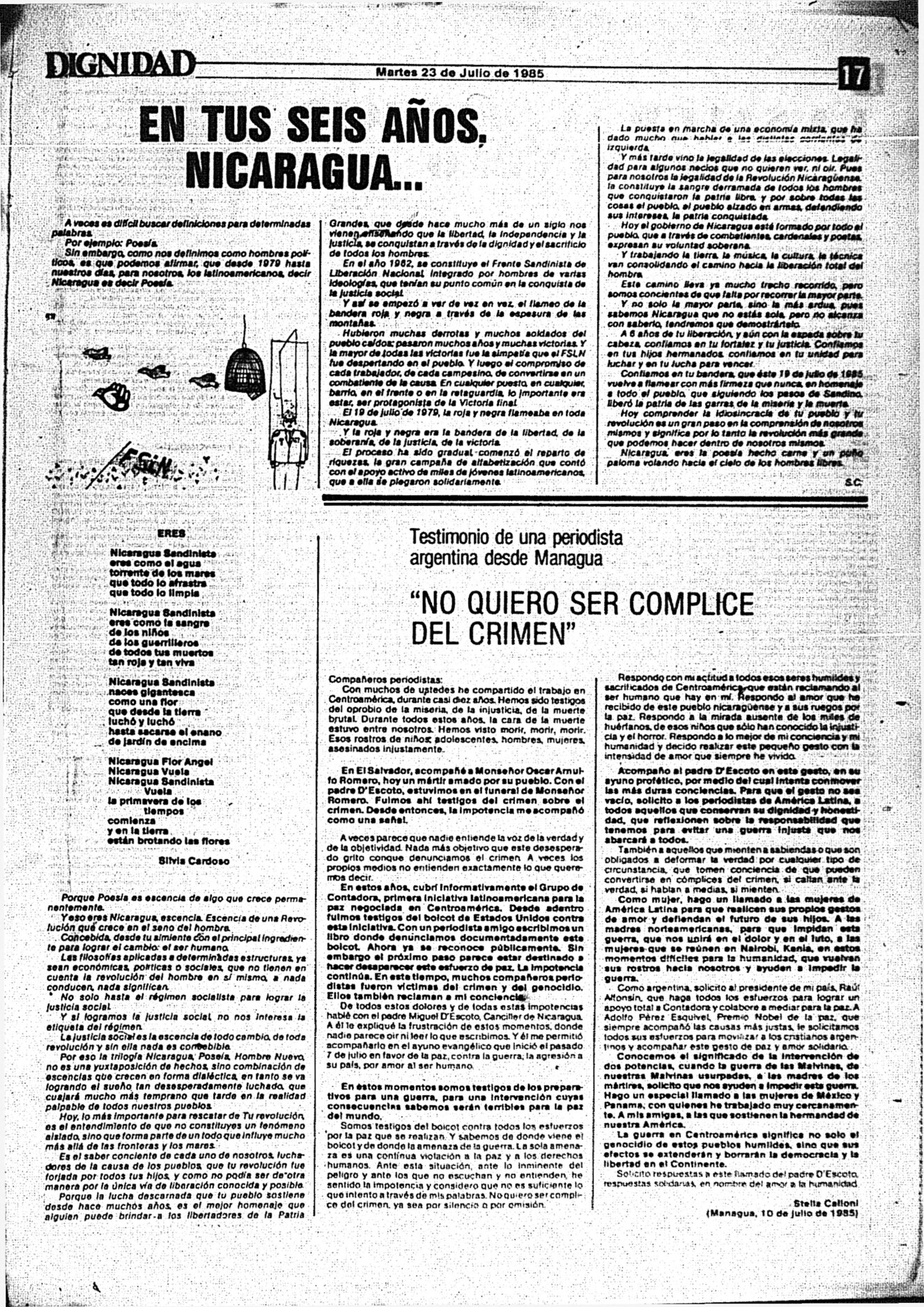Medio de prensa Dignidad Tipo Posdictadura Día de publicación 23 Mes de publicación 7 Año de publicación 1985 Origen Archivo Berrutti Archivo Berrutti Publicacion completa