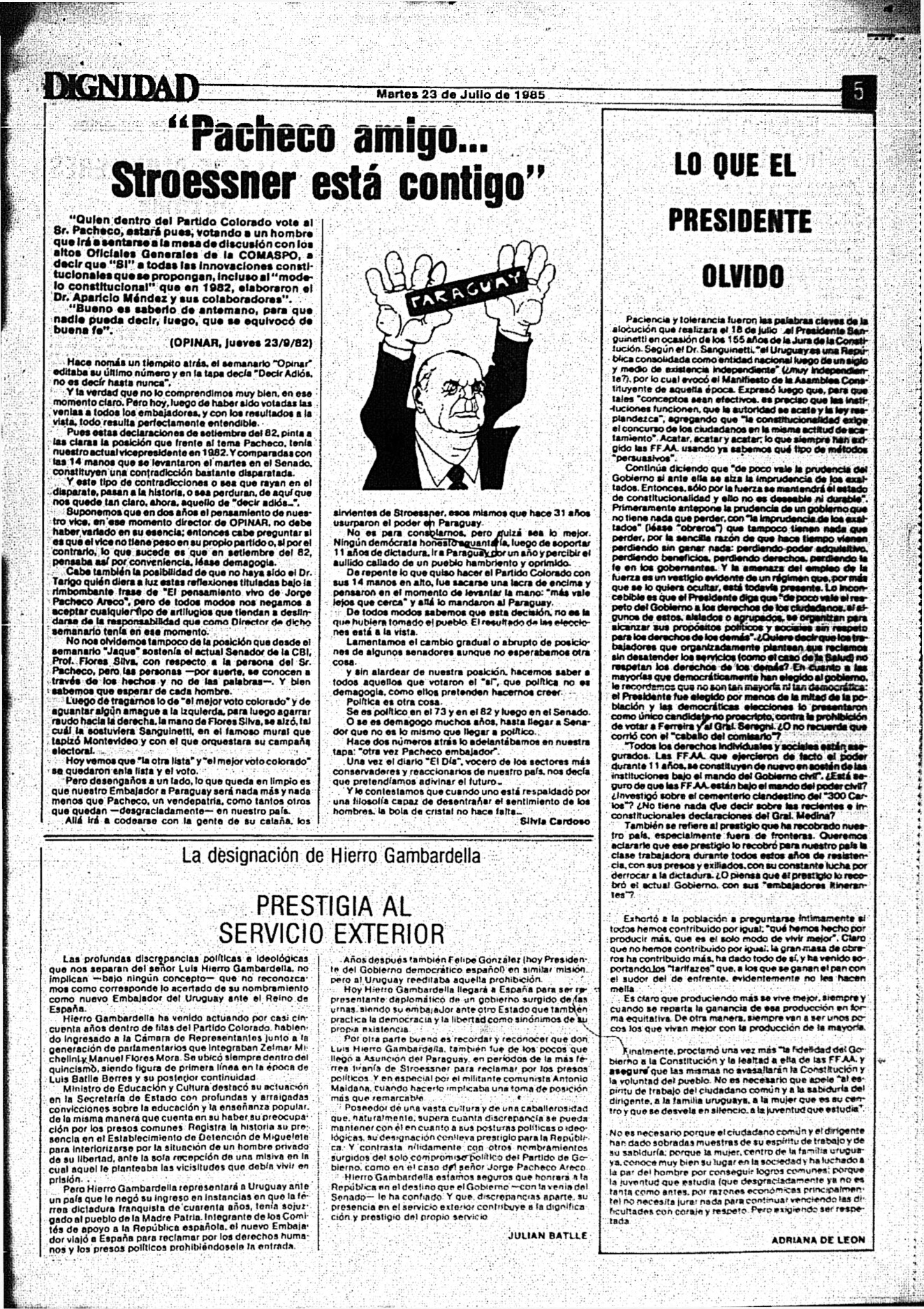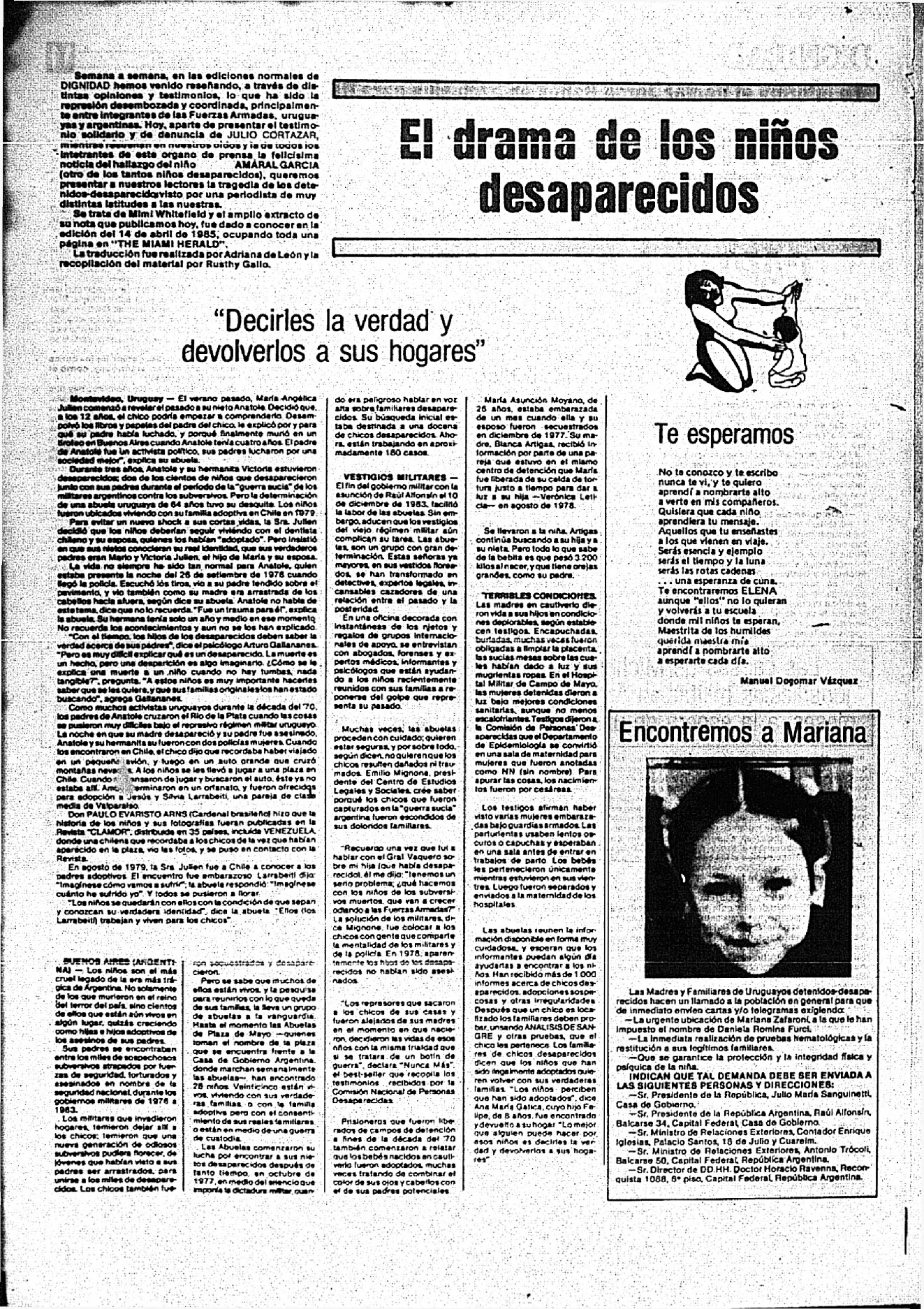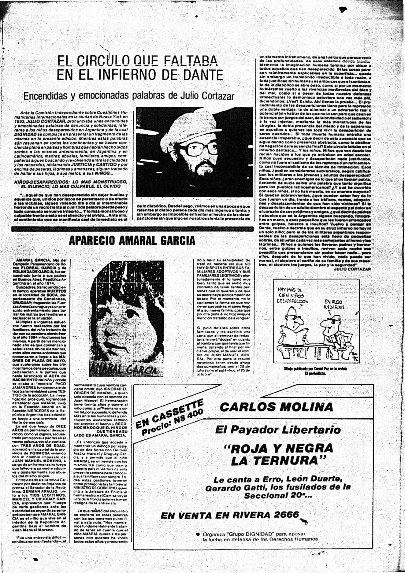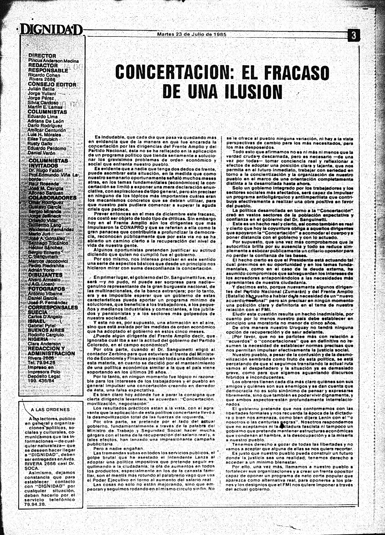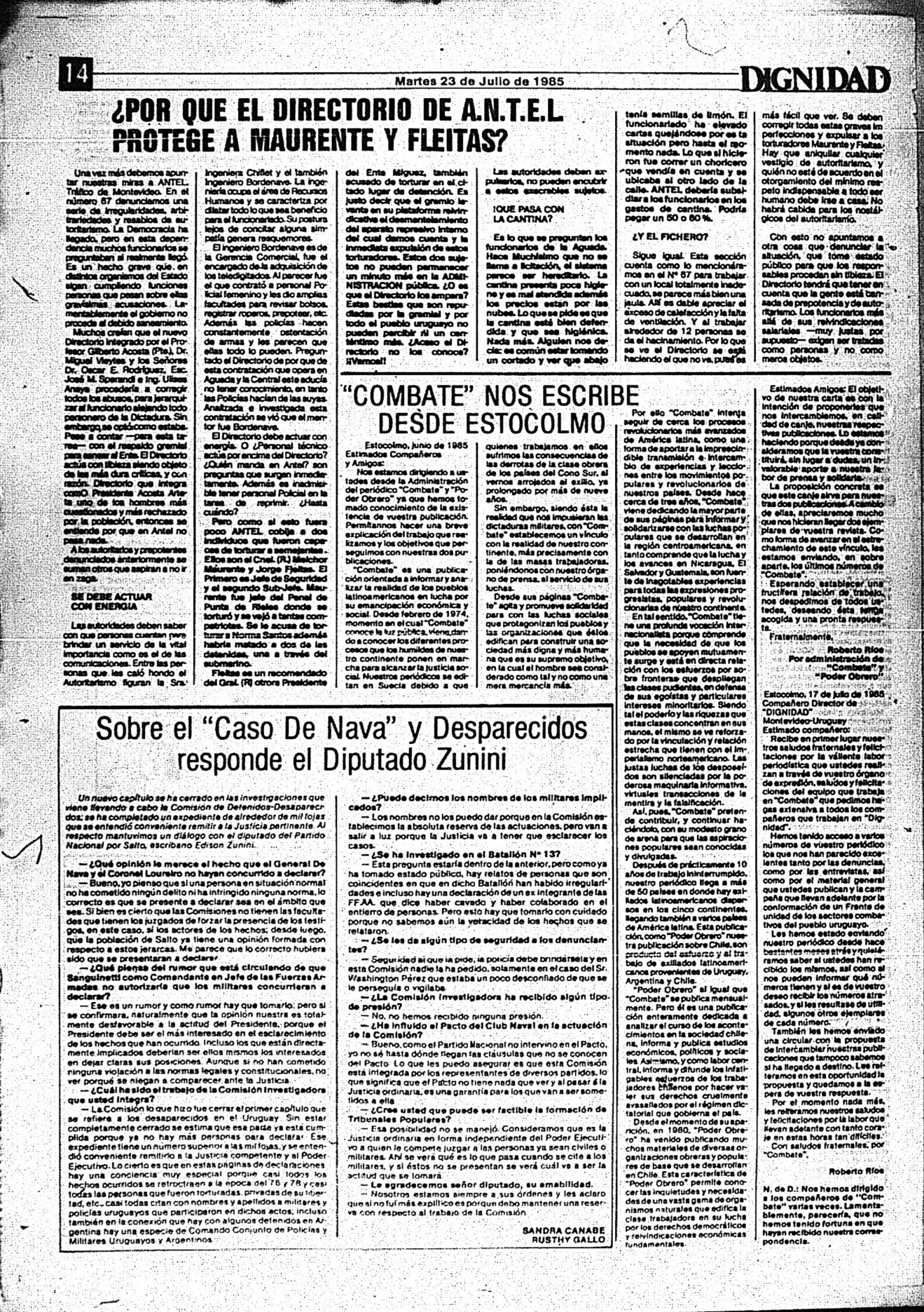 Medio de prensa Dignidad Tipo Posdictadura Día de publicación 23 Mes de publicación 7 Año de publicación 1985 Origen Archivo Berrutti Archivo Berrutti Publicacion completa
