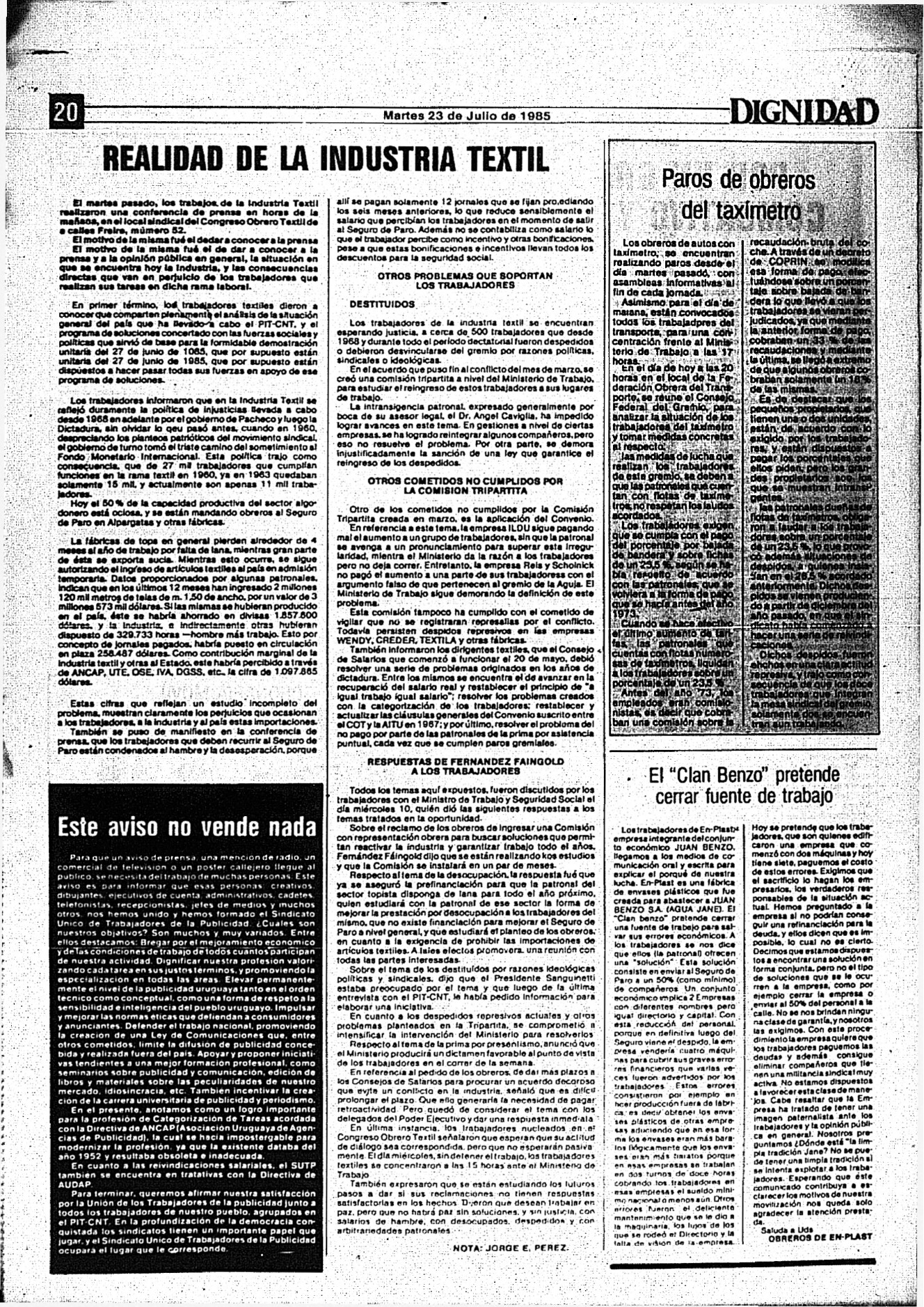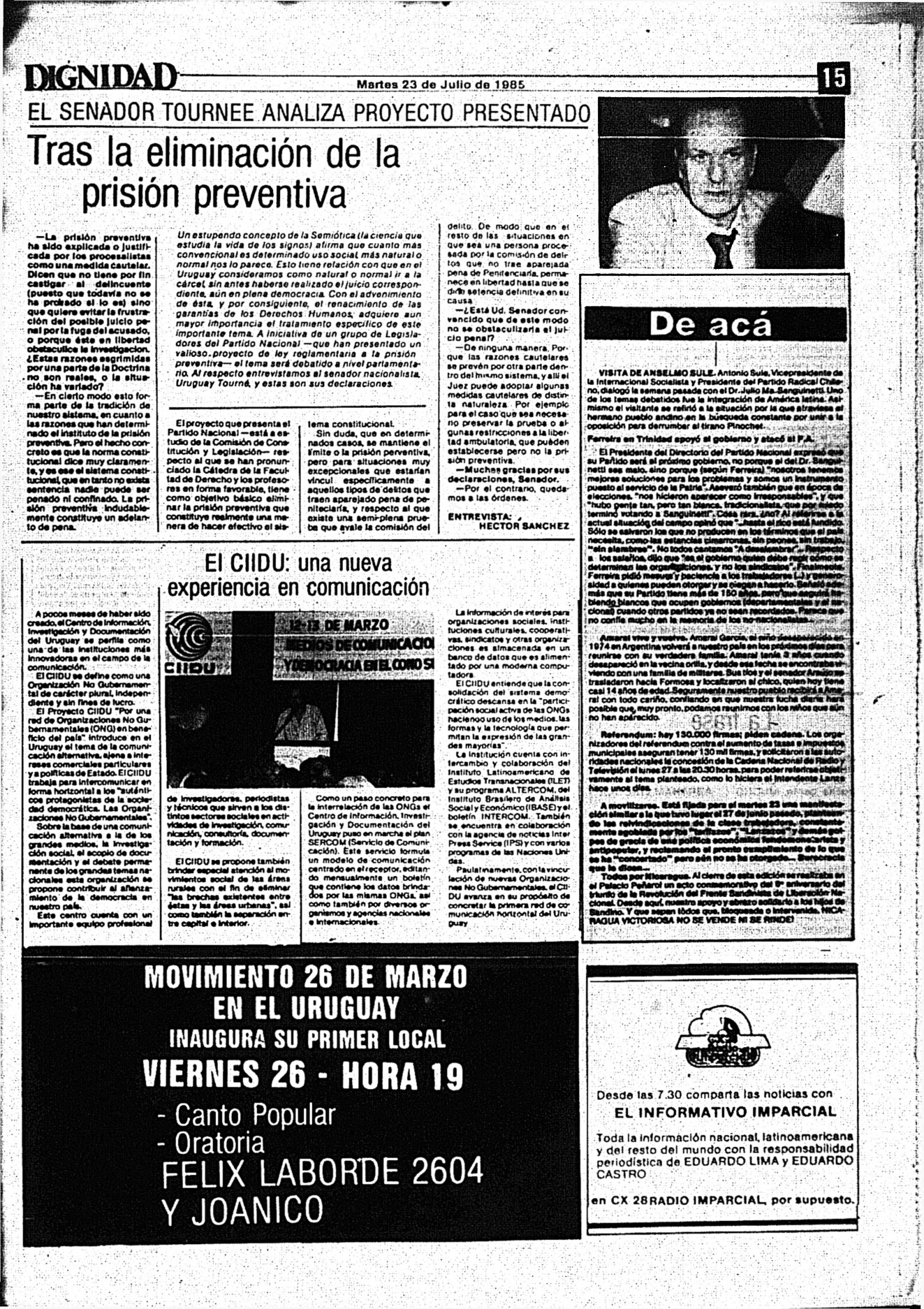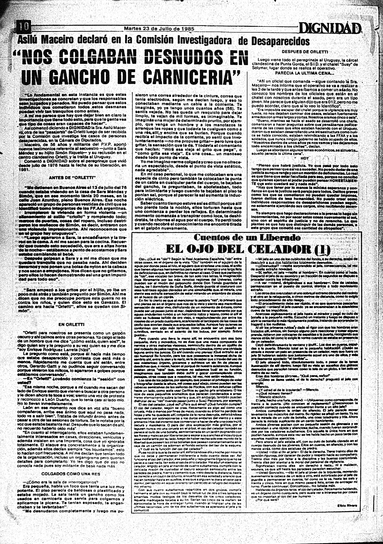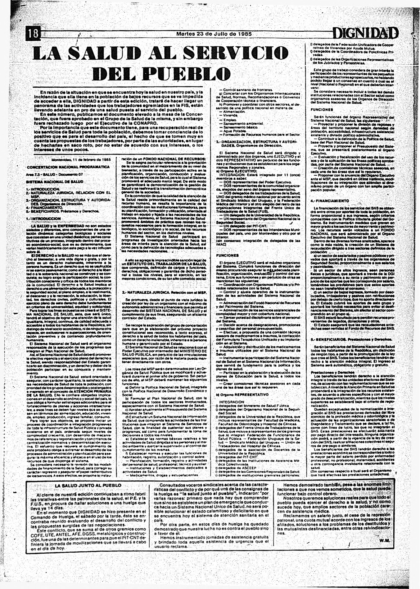 Medio de prensa Dignidad Tipo Posdictadura Día de publicación 23 Mes de publicación 7 Año de publicación 1985 Origen Archivo Berrutti Archivo Berrutti Publicacion completa