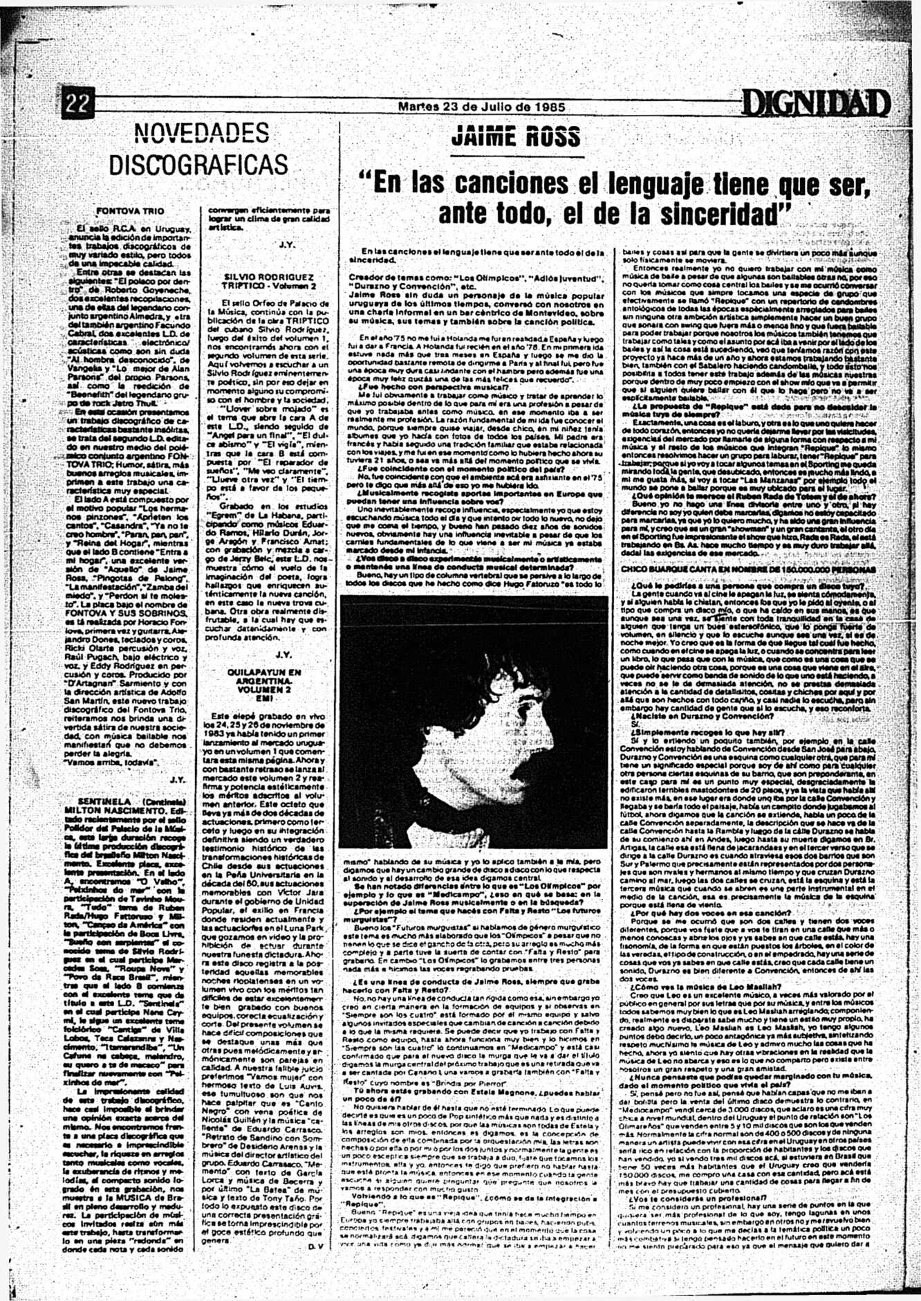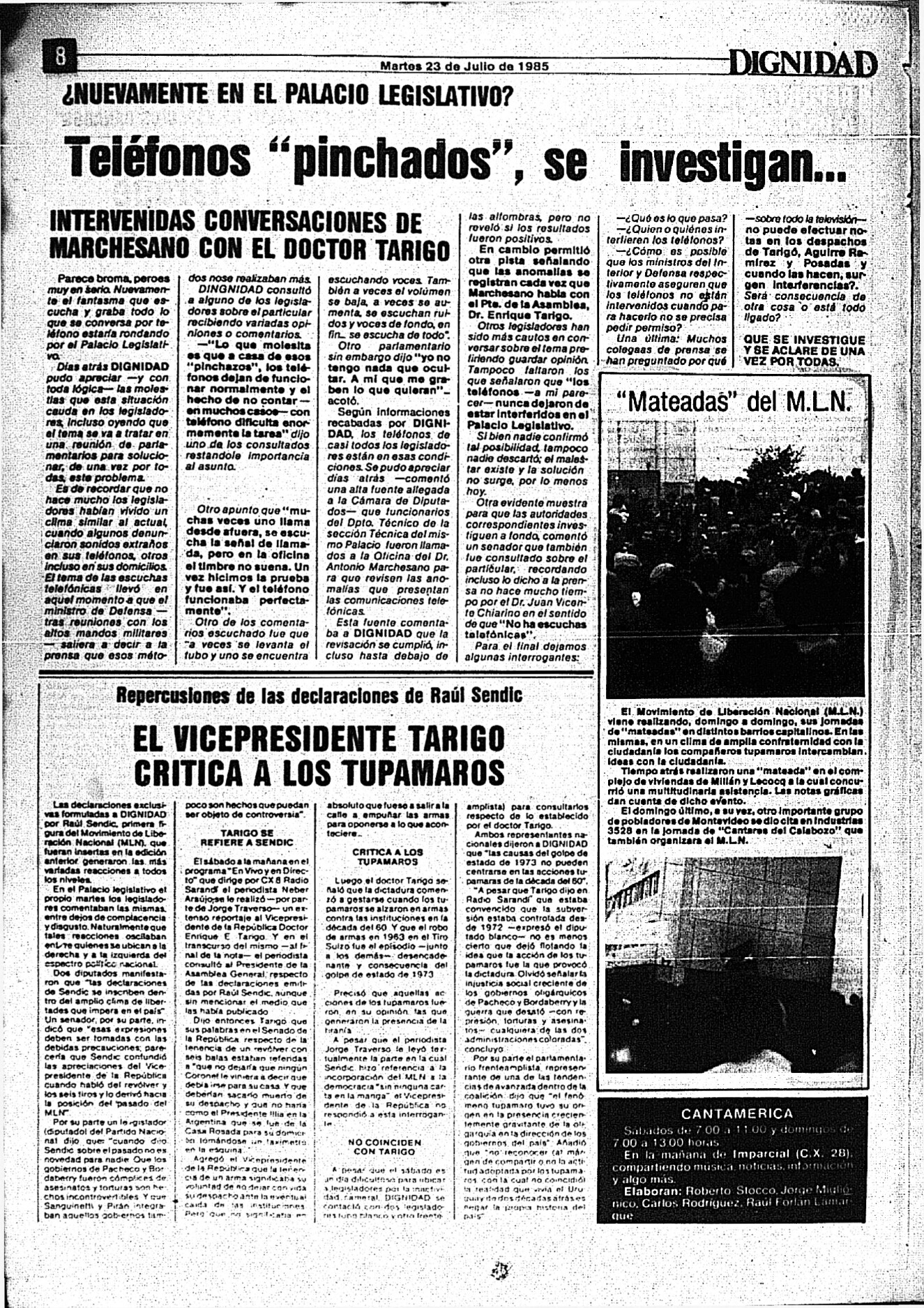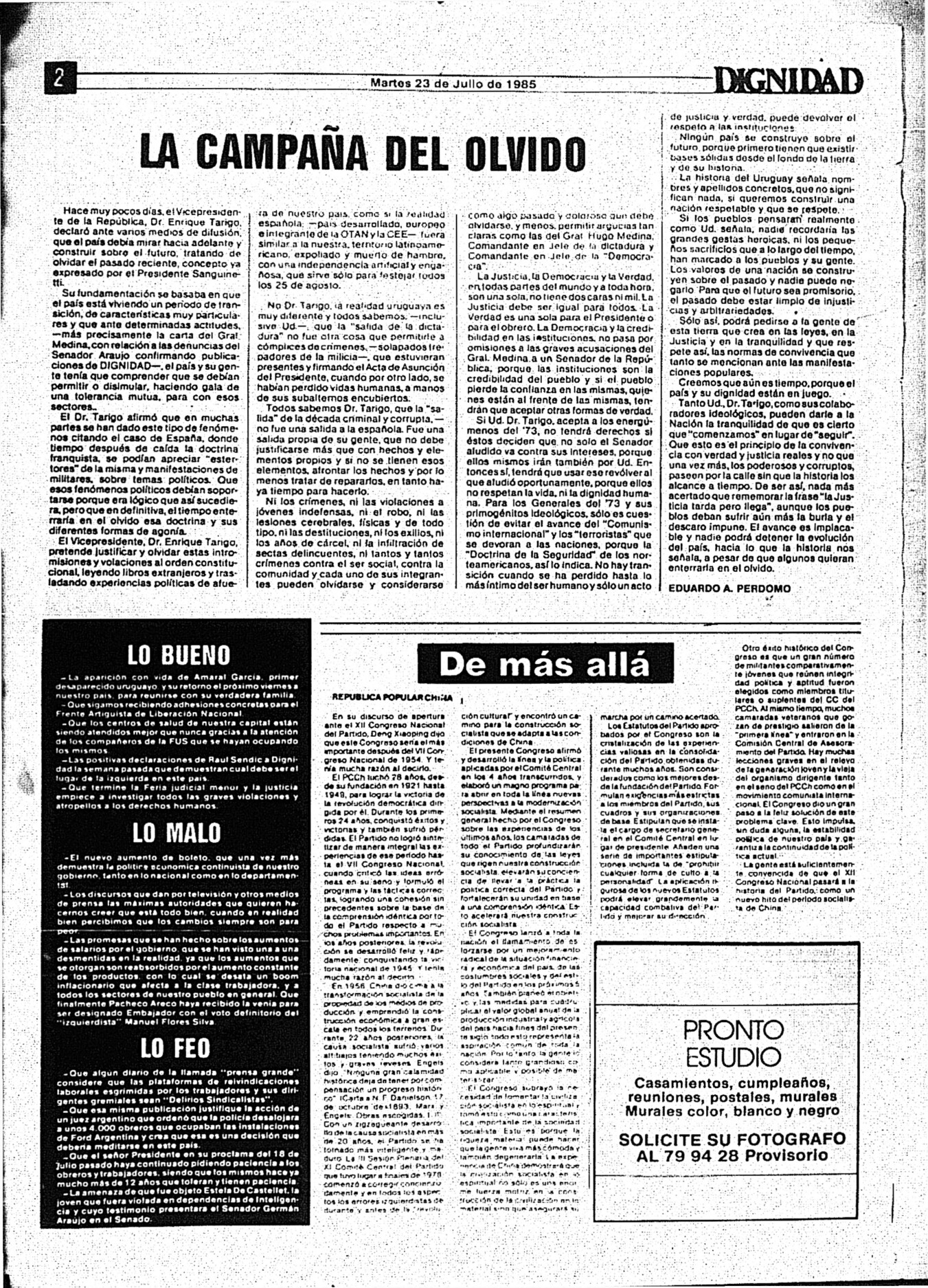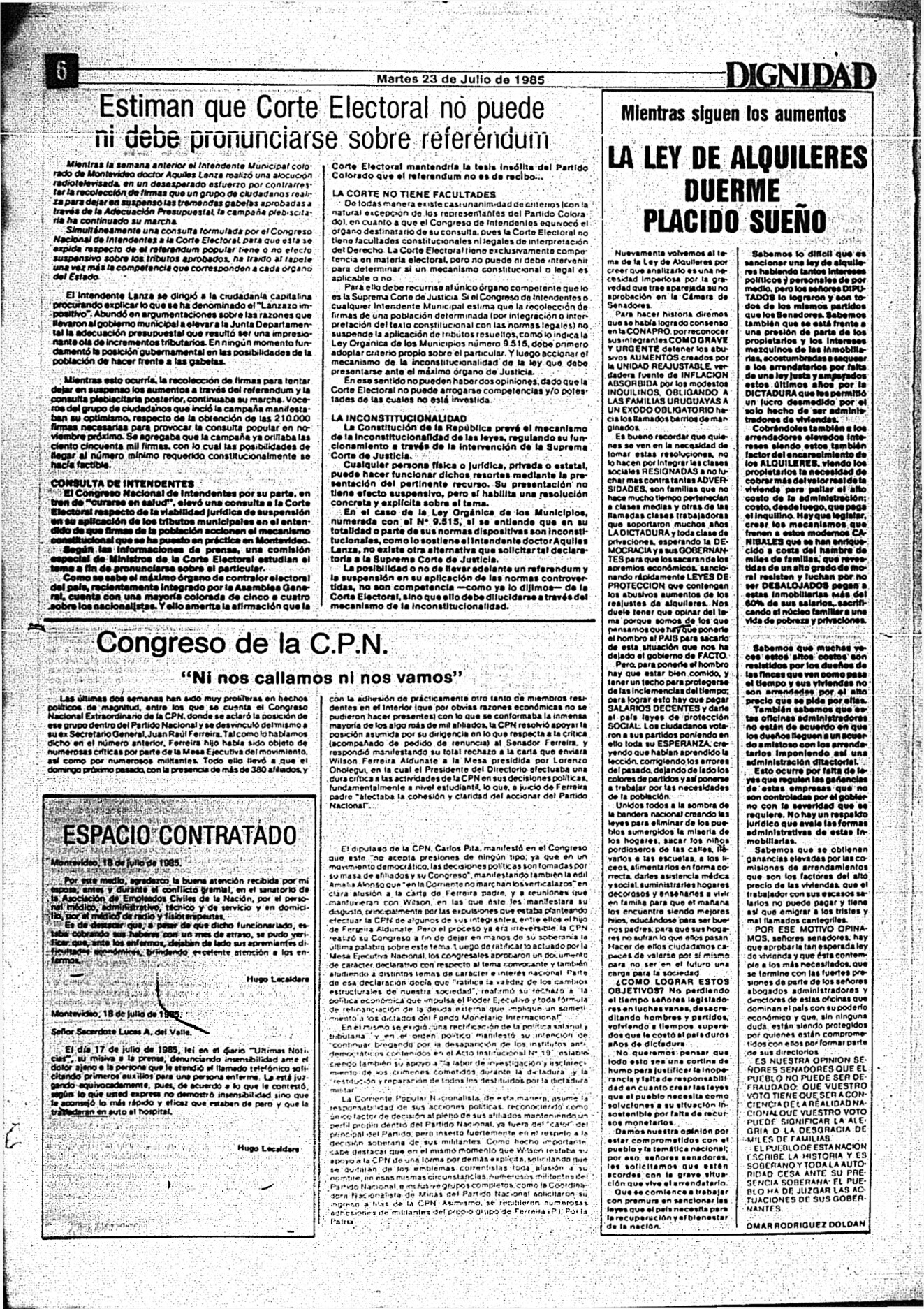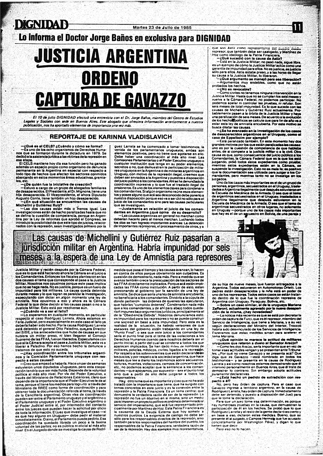 Medio de prensa Dignidad Tipo Posdictadura Día de publicación 23 Mes de publicación 7 Año de publicación 1985 Origen Archivo Berrutti Archivo Berrutti Publicacion completa