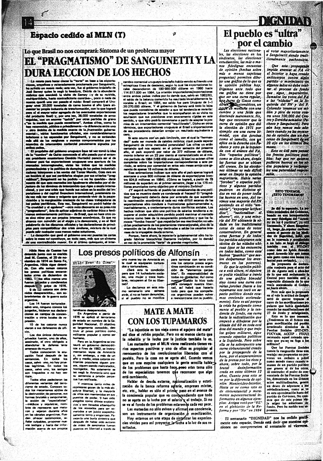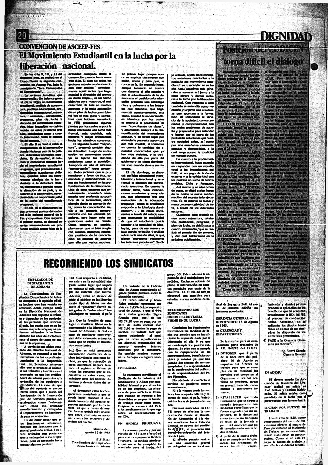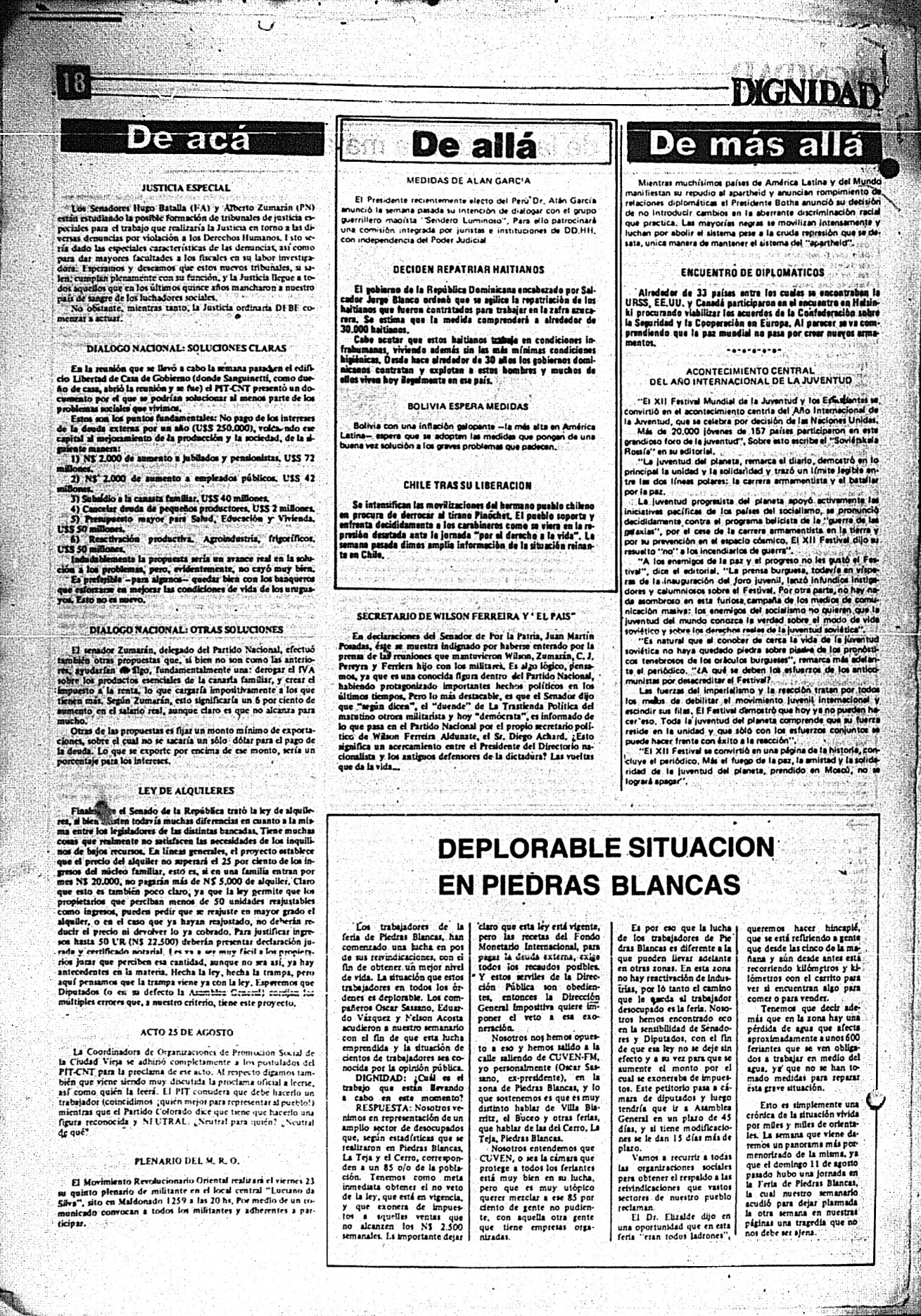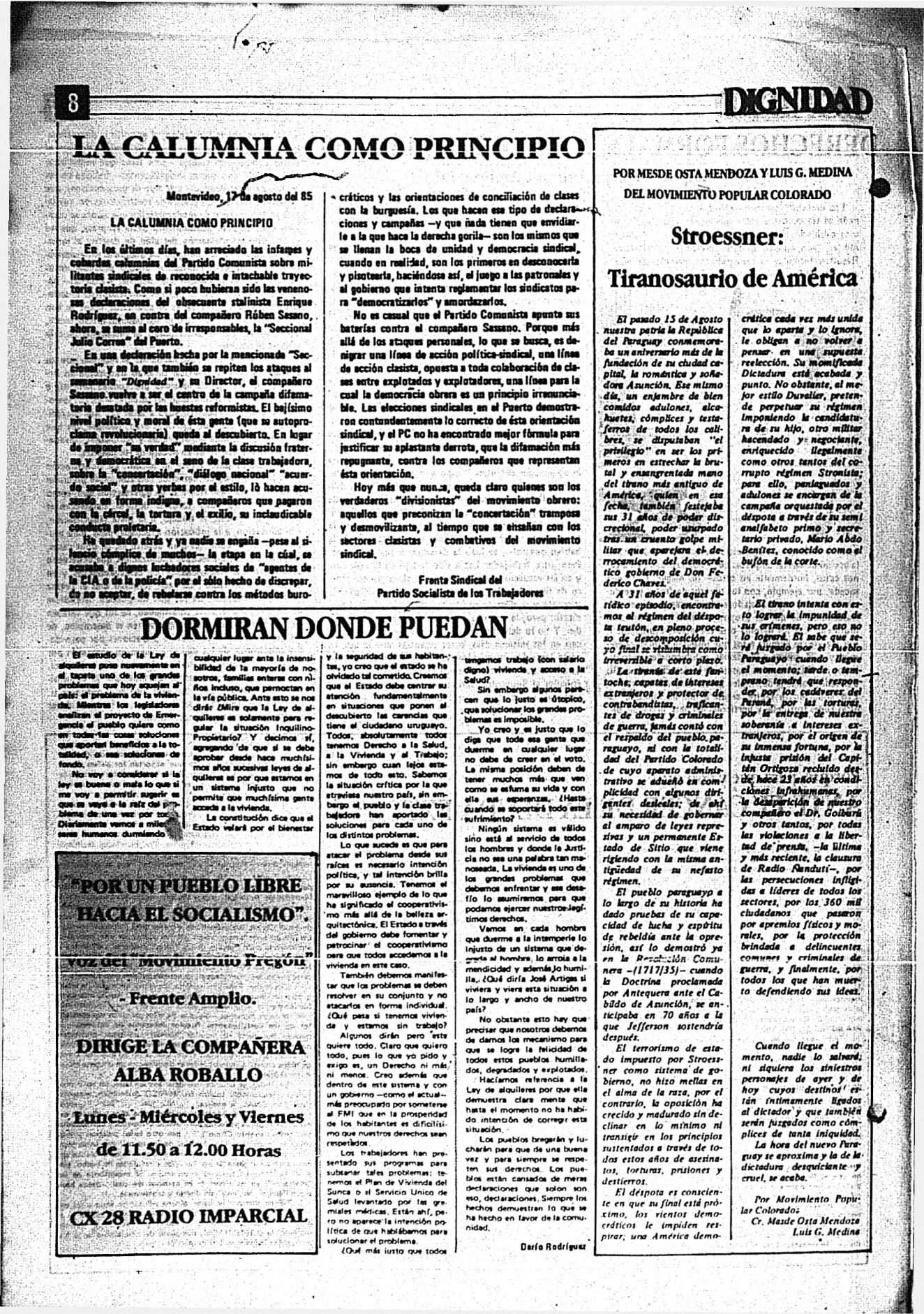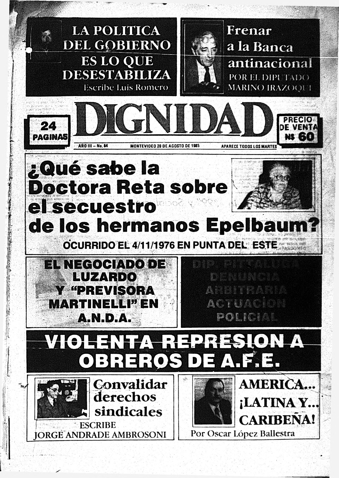 Medio de prensa Dignidad Tipo Posdictadura Día de publicación 20 Mes de publicación 8 Año de publicación 1985 Origen Archivo Berrutti Archivo Berrutti Publicacion completa