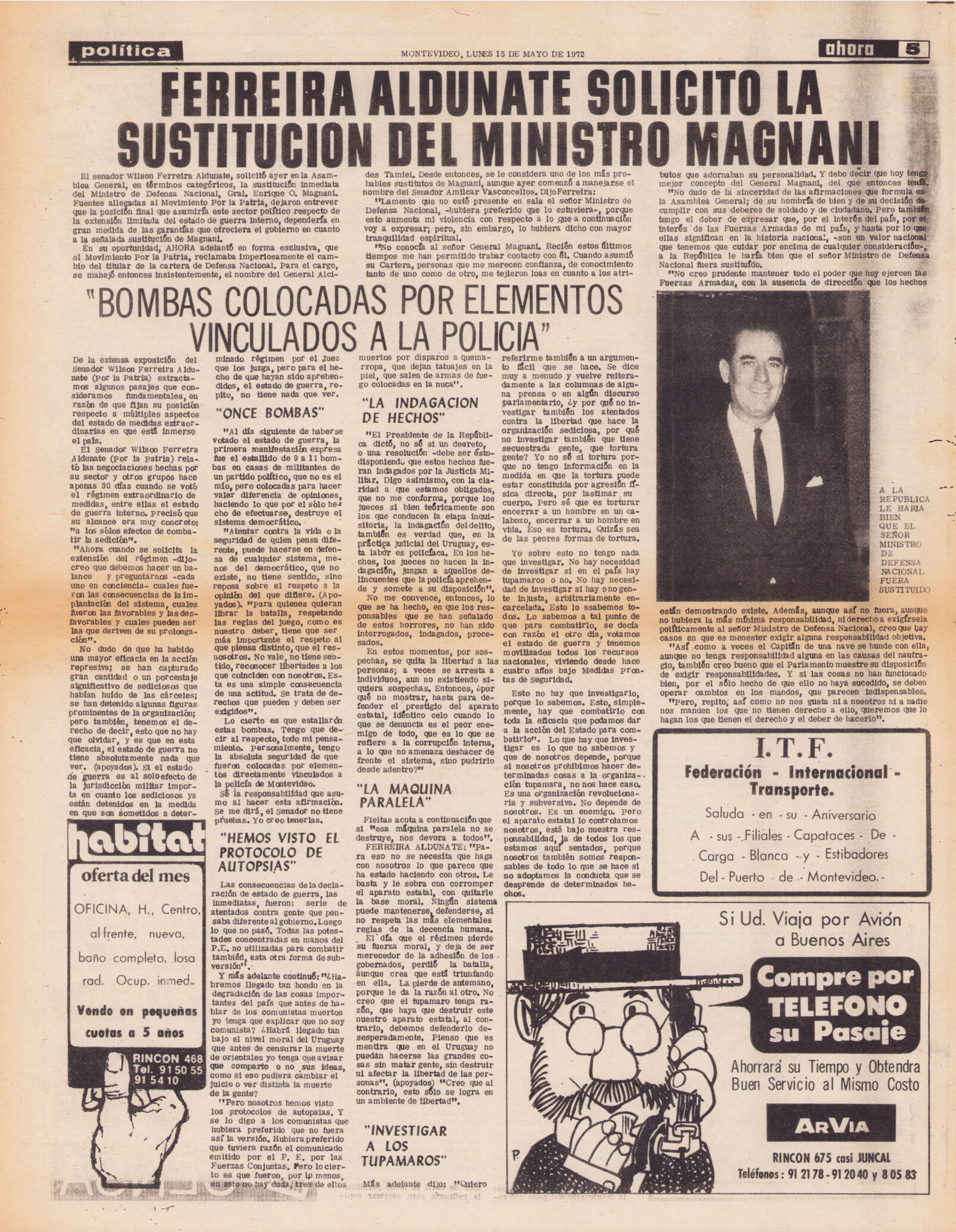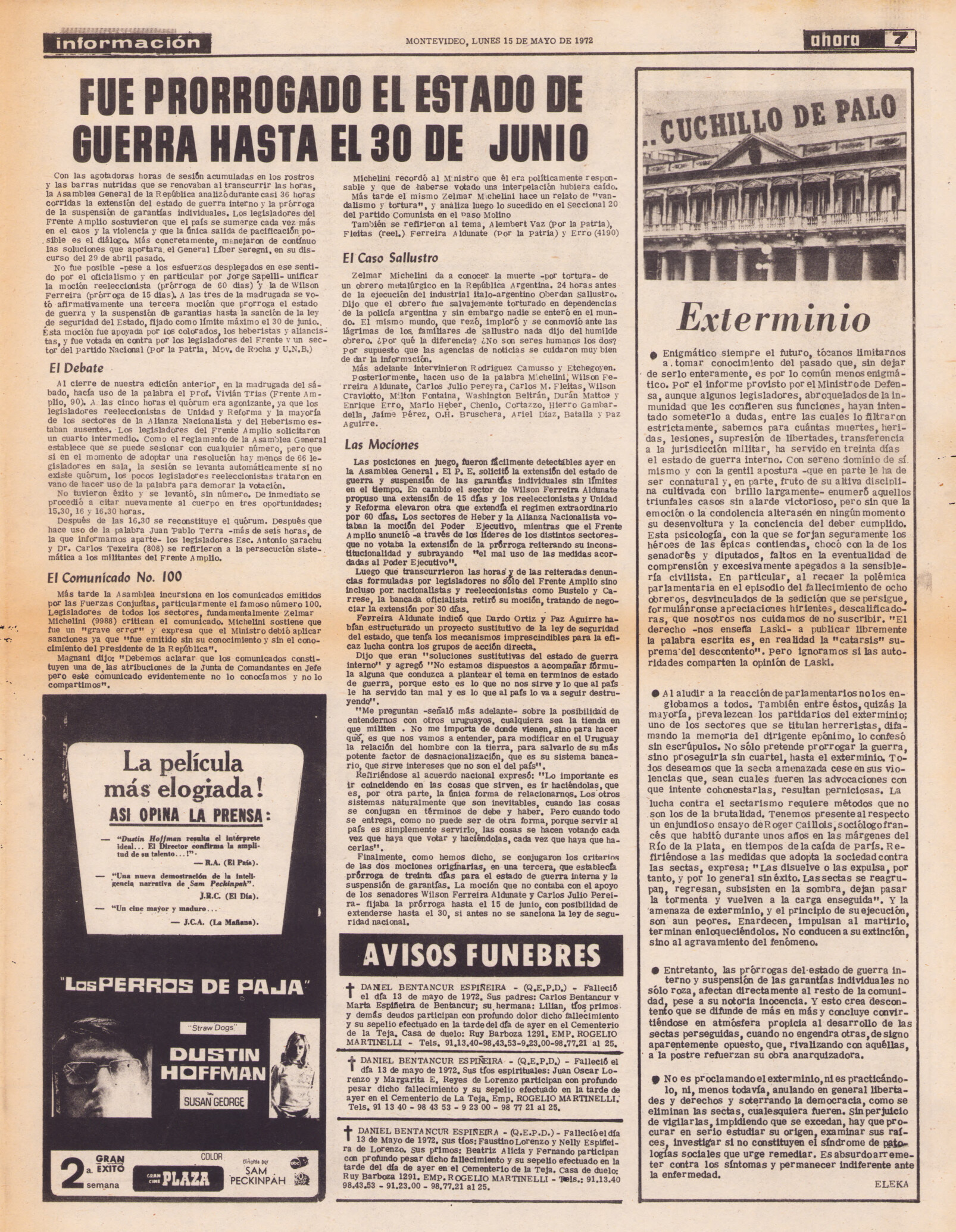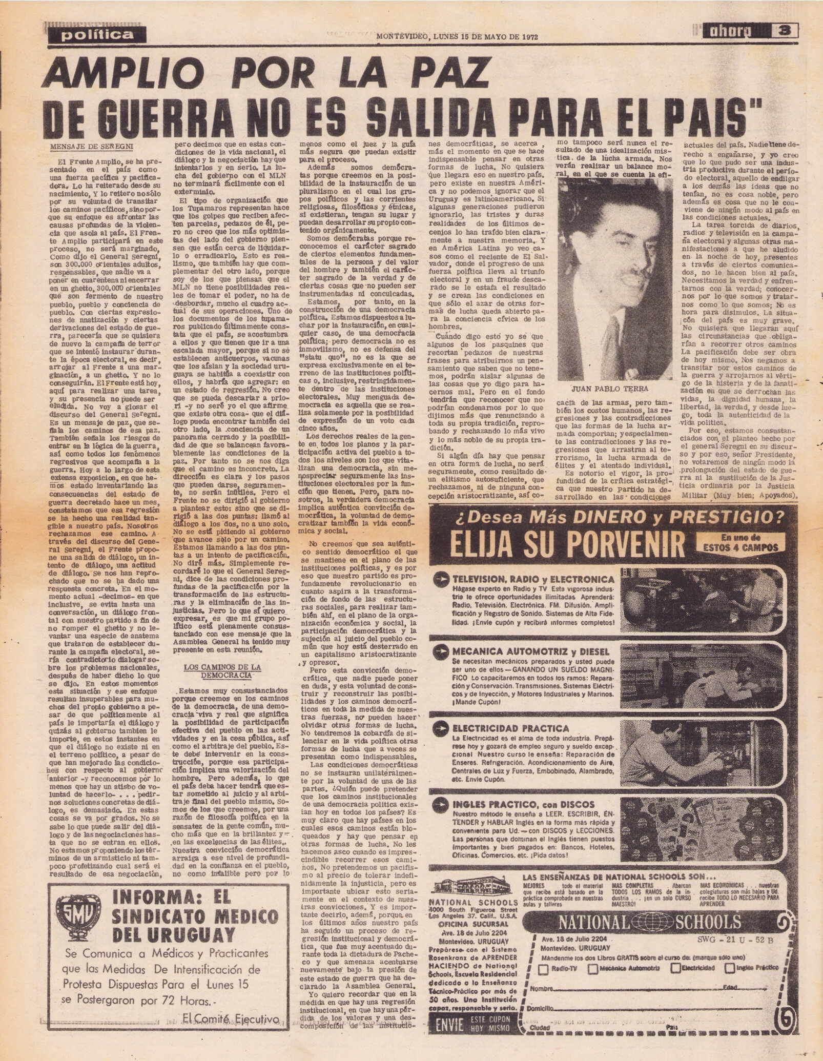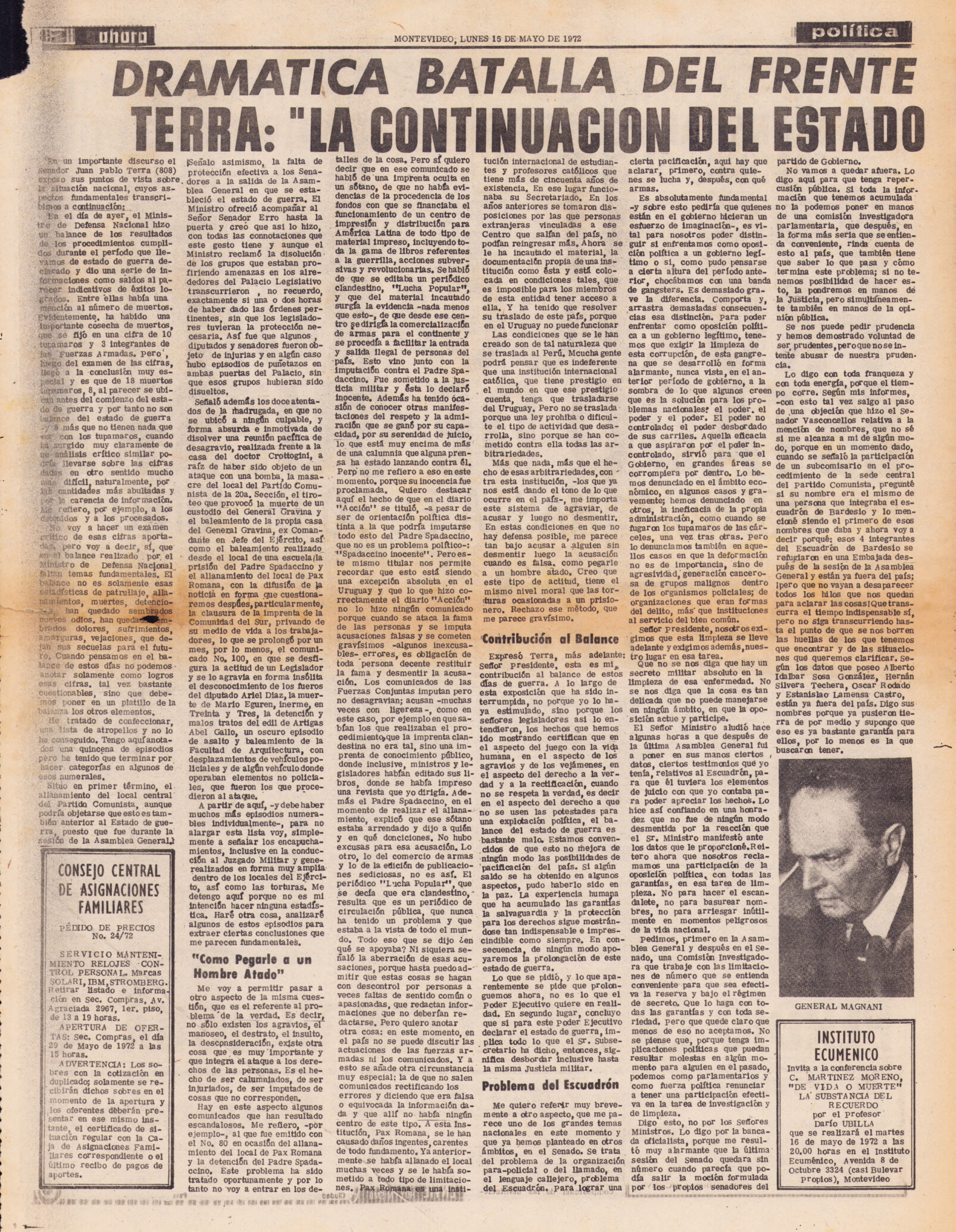 Publicación que reproduce un comunicado ofical de las Fuerzas Conjuntas, atribuyendo el suicidio como causa de muerte de Juan Fachinelli, quién estaba detenido en el Batallón de Infantería no. 1.