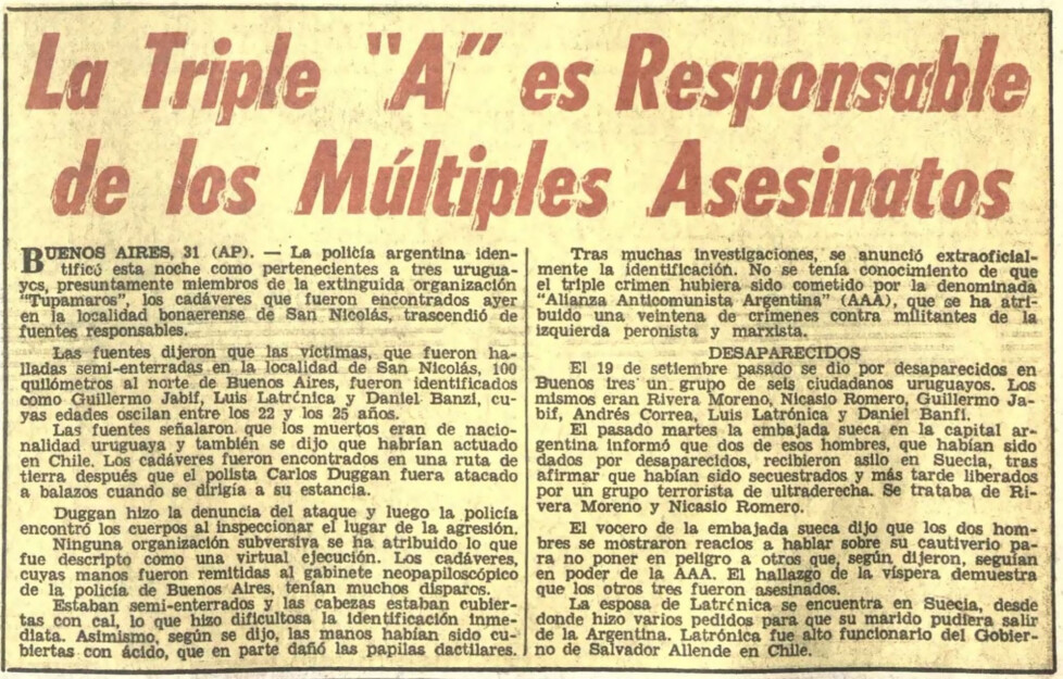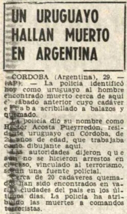 La nota de El País relata el asesinato del matrimonio conformado por Luis Nelson Martirena Fabregat e Ivette Rina Giménez en su hogar ubicado en la calle Amazonas 1440. Como fue habitual, el diario replica la versión oficial de los hechos, enmarcando estos hechos como fruto de un tiroteo en el cual las Fuerzas Conjuntas respondieron a una agresión armada.