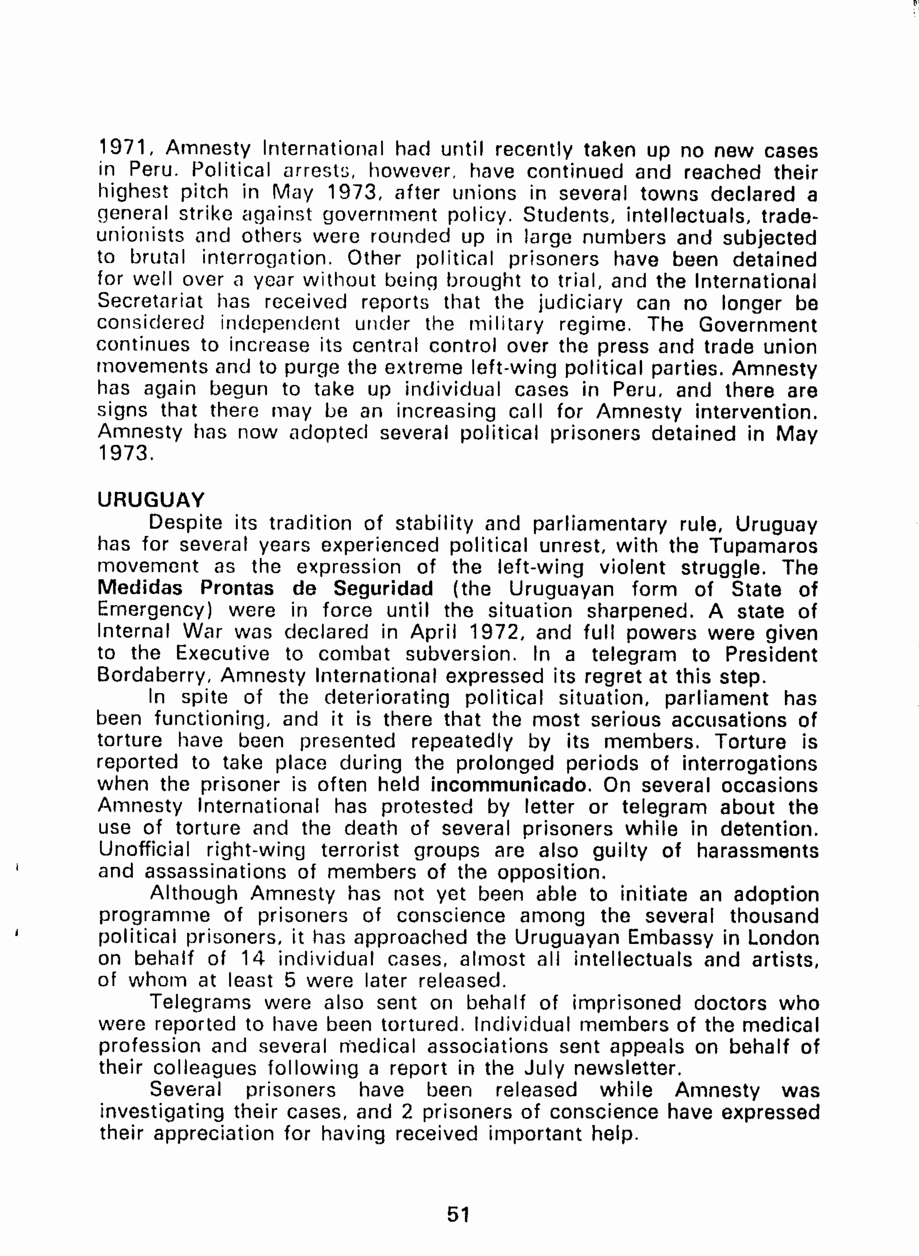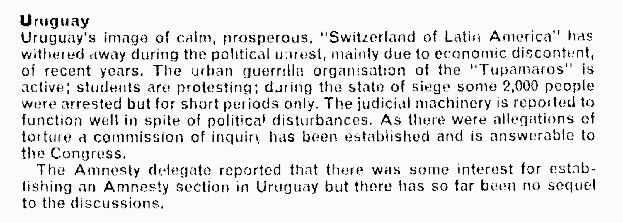 La nota recoge los informes de la Comisión Internacional de Juristas y de Amnistía Internacional que narran el uso sistemático de la tortura en al menos el 50% de los detenidos por motivos políticos en Uruguay, las técnicas de tortura empleadas y los miles de personas detenidas sin juicio.