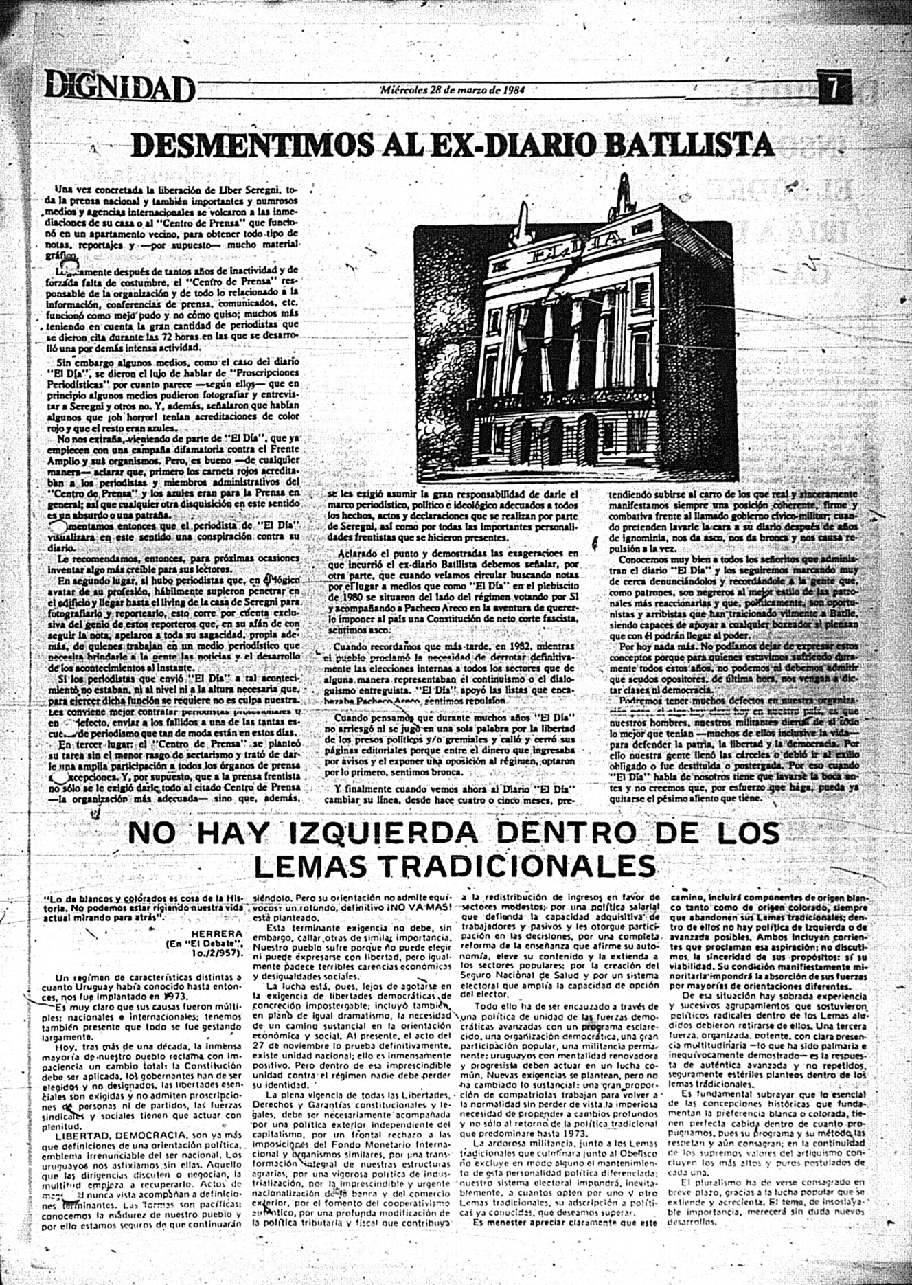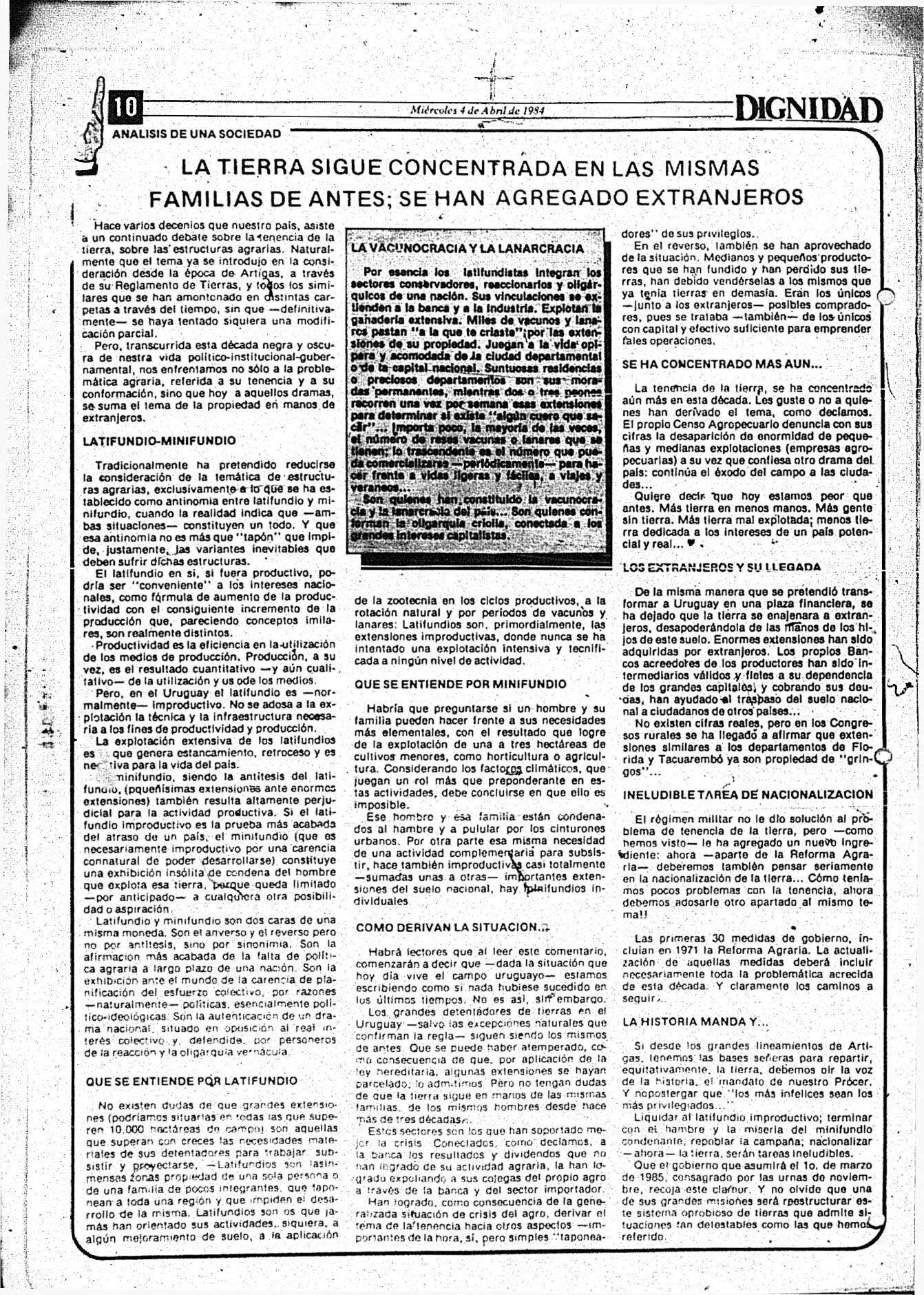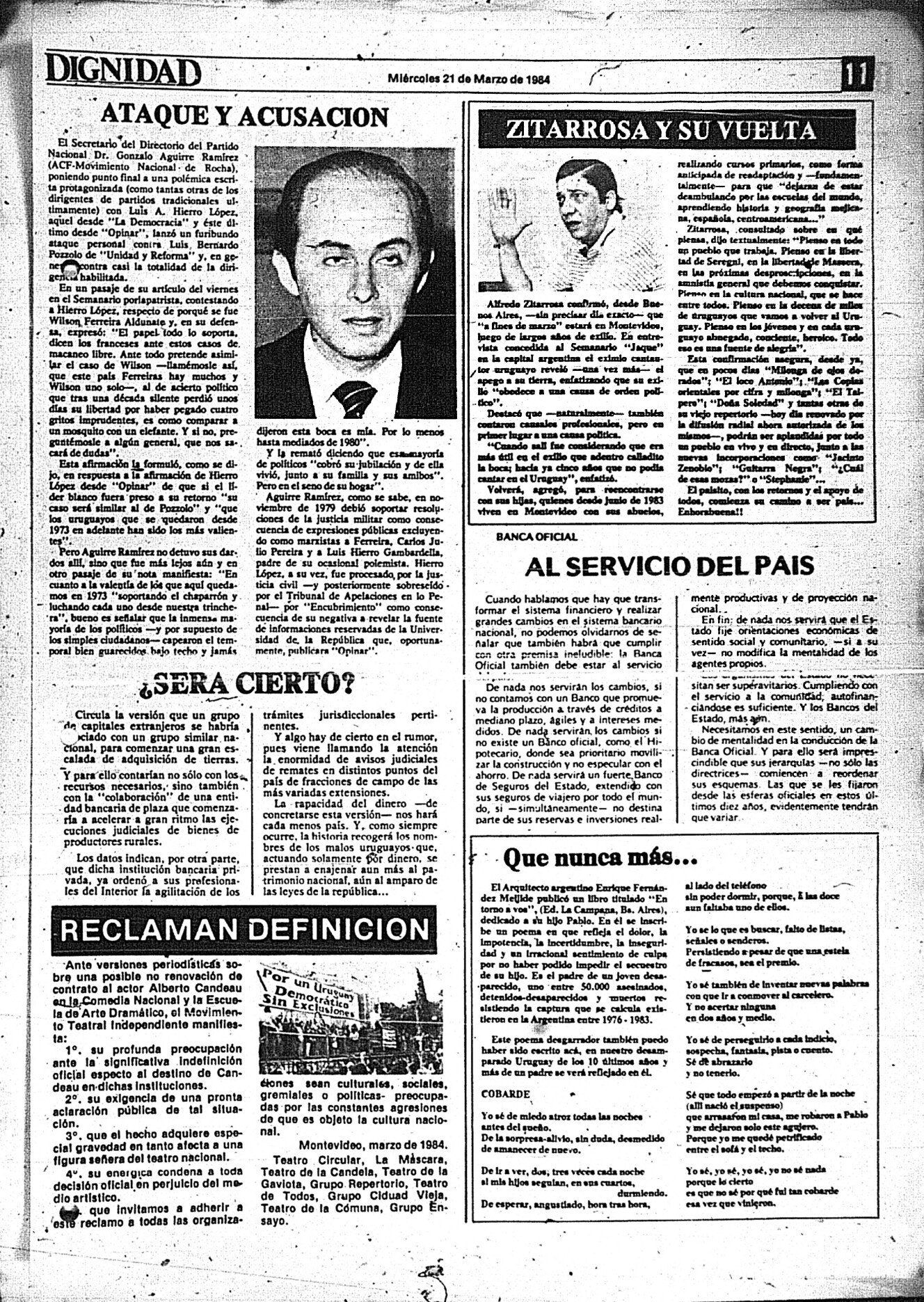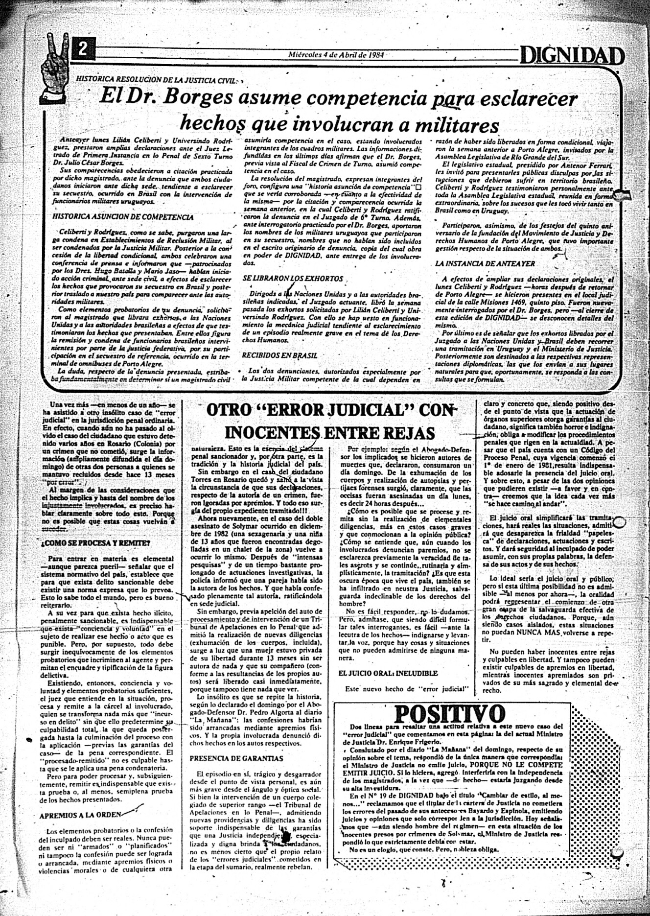 Esta nota, publicada el 22 de abril de 1984, constituye una nueva reproducción por parte de El País, de la versión oficial sobre hechos represivos de la dictadura. A través de un comunicado de la DINARP (Dirección Nacional de Relaciones Públicas), el diario reproduce la versión militar sobre la muerte de Vladimir Roslik, un médico de San Javier, intentando encubrir lo que hoy se reconoce como el último asesinato por tortura de la dictadura.