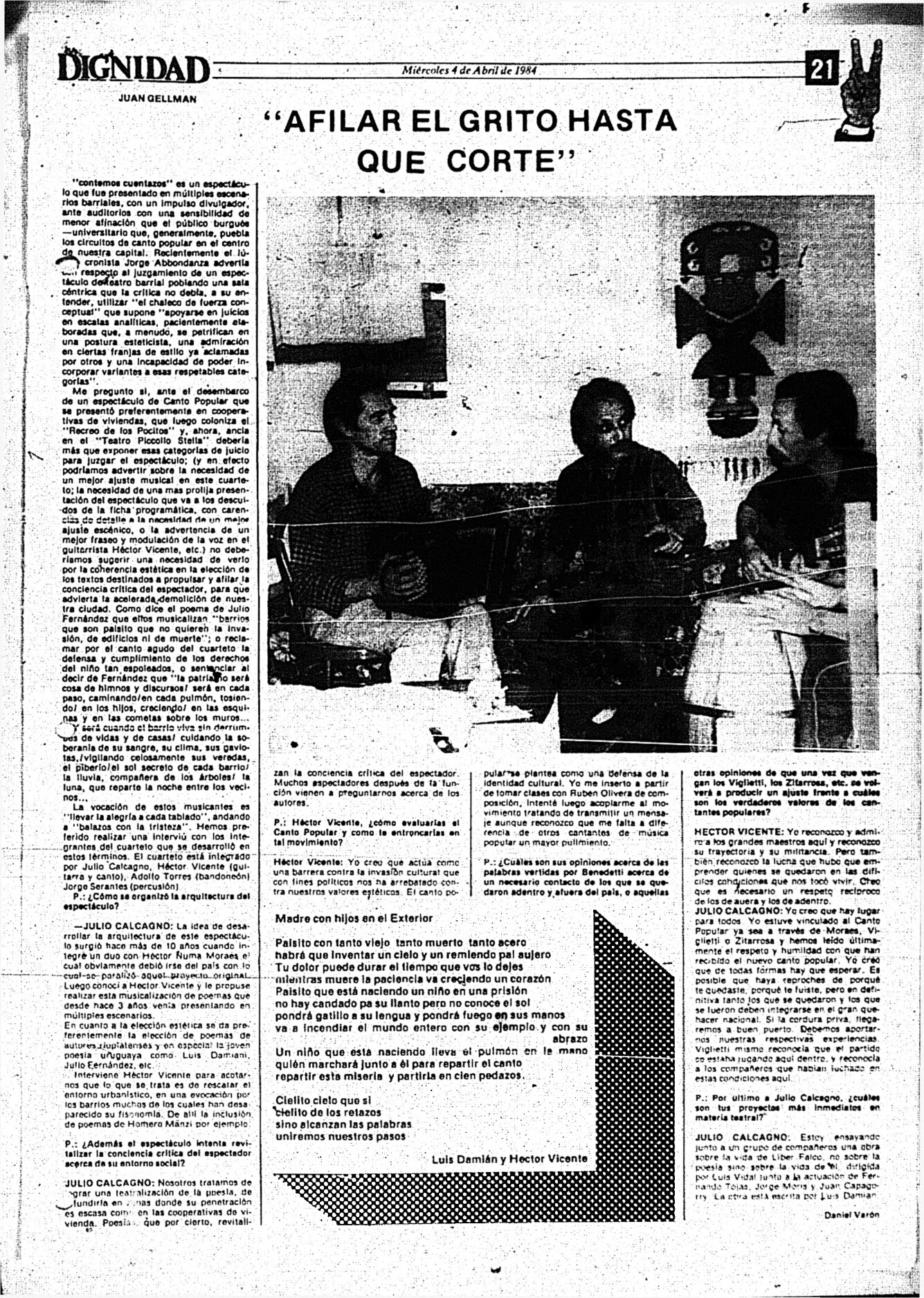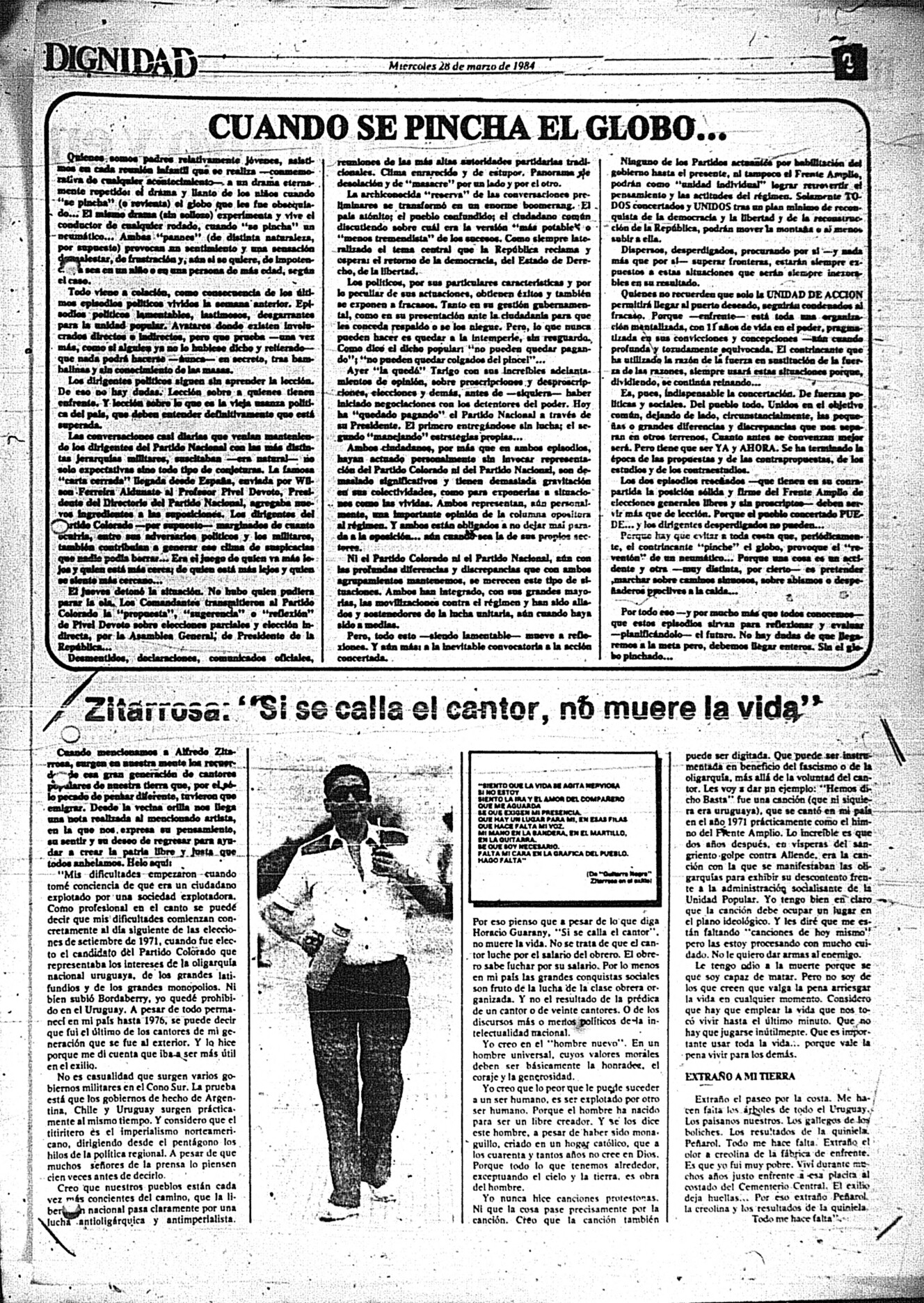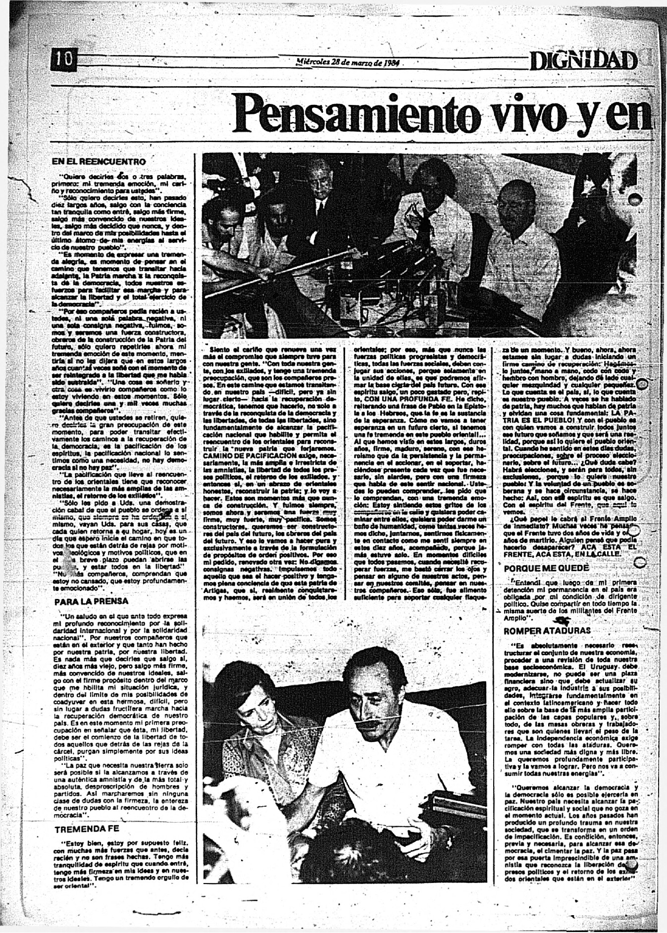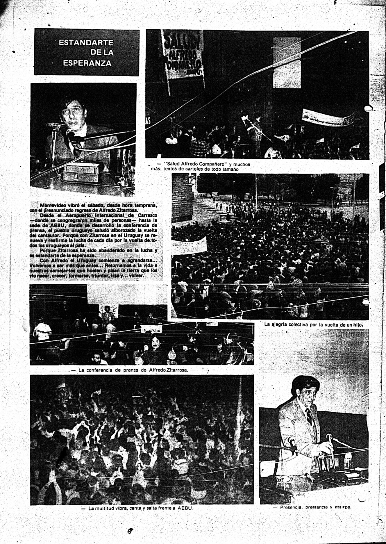 Suplemento especial del diario Cinco Días, con cobertura periodística y fotográfica del retorno de Alfredo Zitarrosa del exilio.