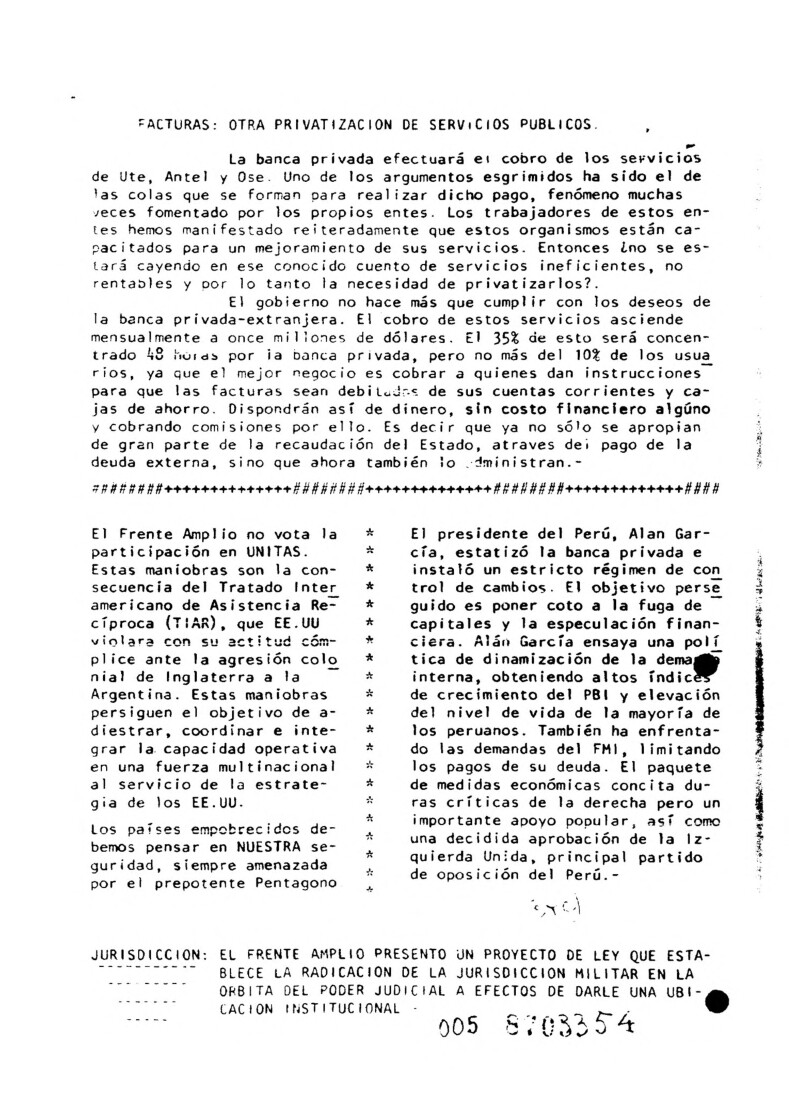 En Jurisprudencia, la revista transcribe la Sentencia 463 (19/nov/1986) de la Suprema Corte de Justicia, dictada en una contienda de competencia originada por la denuncia de Óscar Ortiz por la desaparición de su hermano Félix Sebastián Ortiz, militante del Partido Comunista, quien fue visto en el Hospital Militar. Frente al pedido de la Justicia Militar de atraer el caso por el principio de especialidad, el Ministerio Público aconsejó no hacer lugar a la declinatoria y el Juzgado Penal compartió ese criterio, elevándose la contienda a la SCJ. Por mayoría, la Corte reafirmó que corresponde la jurisdicción común, fijando un precedente clave para causas de violaciones a derechos humanos.