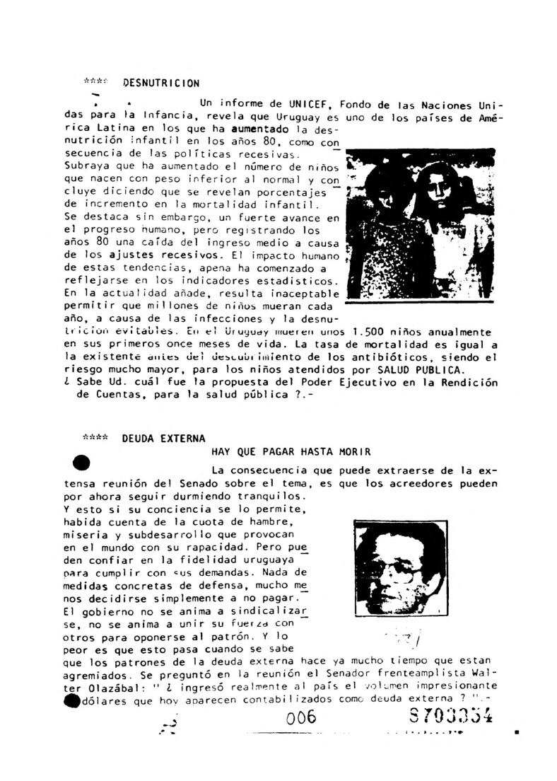 Abre con el editorial “El porqué de la Revista”, donde se define el carácter plural, no gubernamental y pedagógico del proyecto. En Informaciones y comentarios se destacan: “Acciones legales contra la Impunidad del Terrorismo de Estado”, análisis jurídico-político de la Ley 15.848 (Caducidad), con el detalle de estrategias de inconstitucionalidad y recursos internacionales; las “Actividades del IELSUR” de 1987 (patrocinio de causas, asesoramiento, salud mental, medio ambiente); el artículo “Uruguay no cumple obligaciones internacionales que ha asumido” sobre los informes pendientes ante el Comité de Derechos Humanos de la ONU y el Comité para la Eliminación de la Discriminación Racial; y “El examen de la conducta ética de médicos durante la dictadura militar”, que revisa estándares deontológicos y normativa internacional. La sección Doctrina incluye “El movimiento de derechos humanos en el Uruguay” (síntesis histórico-sociológica de su emergencia y agendas) y “El exilio de los enfermos mentales pobres” (mirada crítica sociosanitaria).